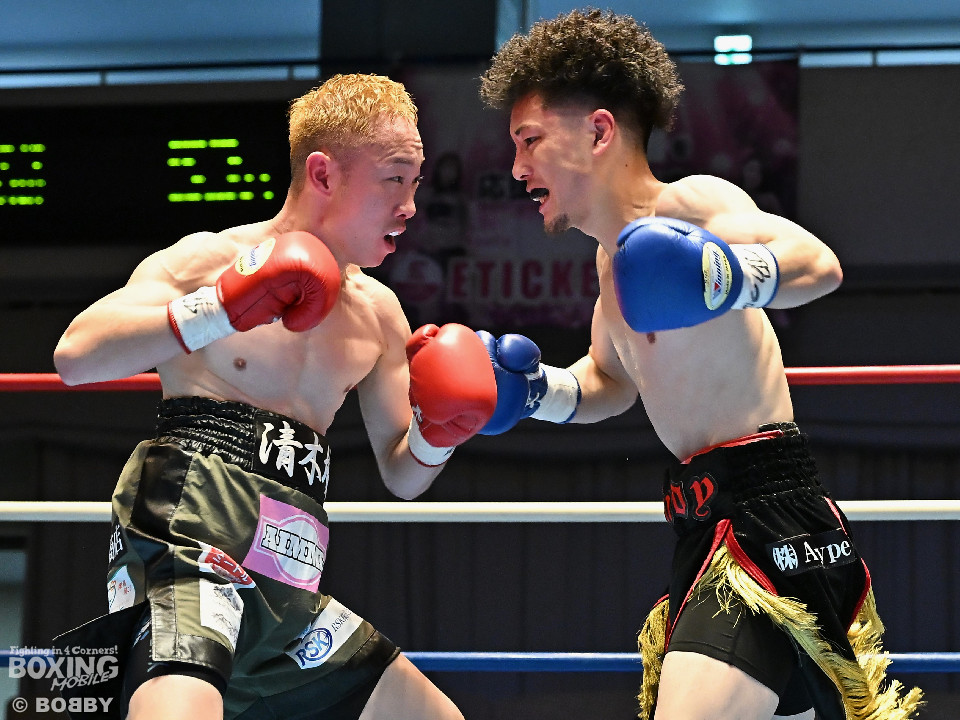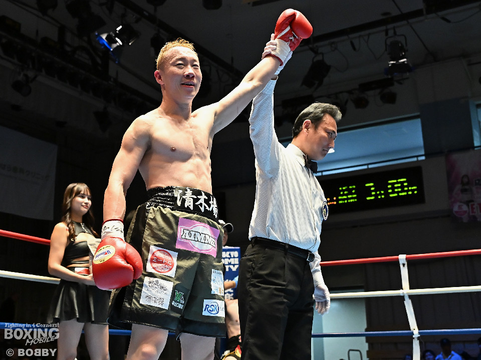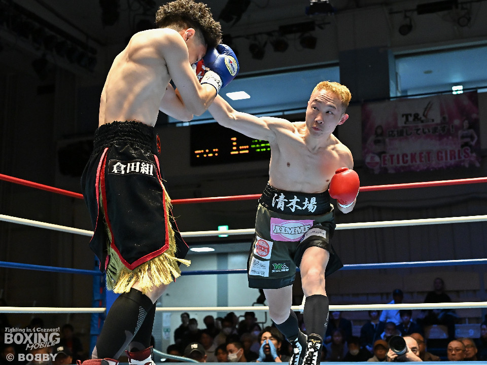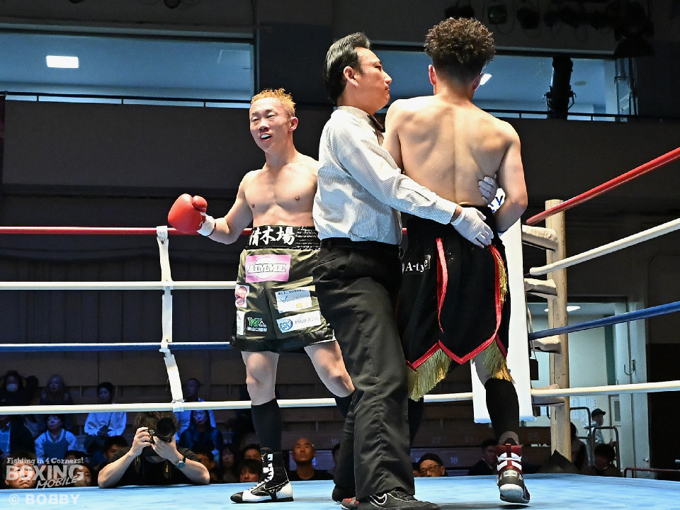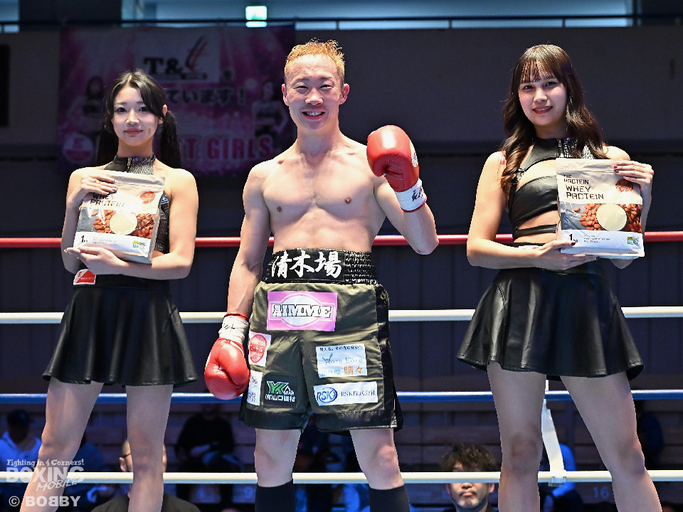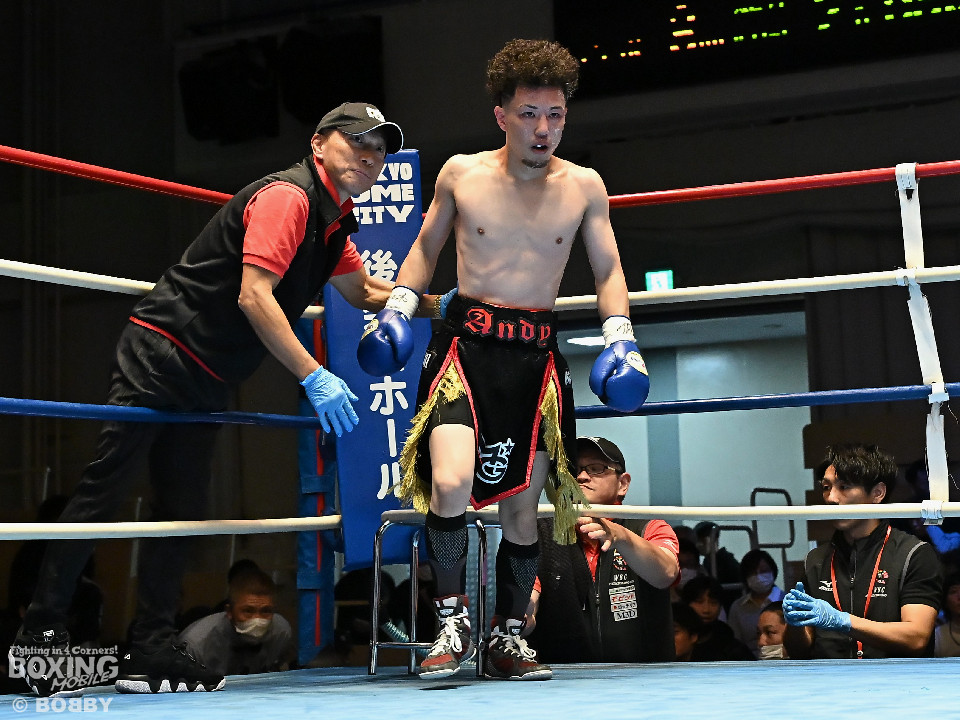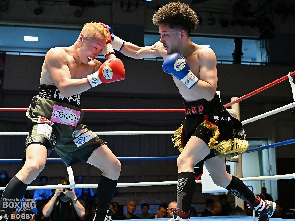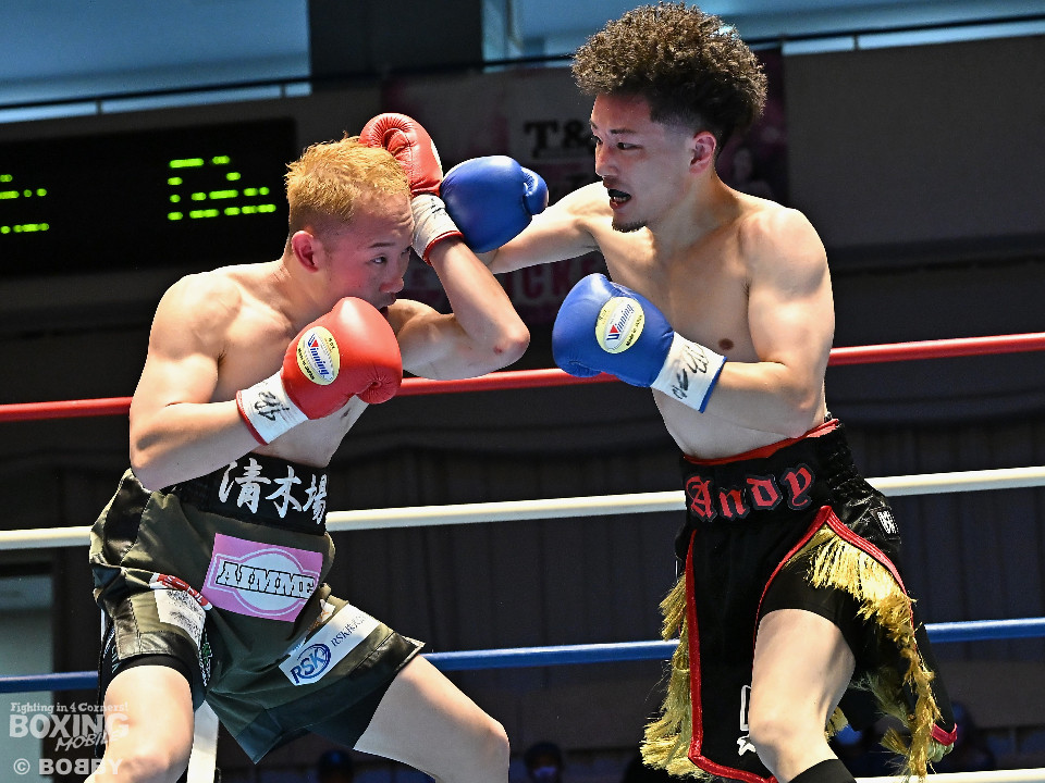 試合:清木場がプレスをかけて右アッパー、左ボディを叩きつけて先制攻撃。後手に回ったアンディだが、右フックで効かせるとジャブからワンツーにつなげて応戦。2回、清木場はジリジリと距離を詰めて左ボディを徹底。3回、アンディは右フックでグラつかせると連打で攻勢。ここを踏ん張った清木場はプッシュしながら必死に返した。4回、清木場は左ボディからパンチをまとめるとアンディ陣営からタオルが投入された。