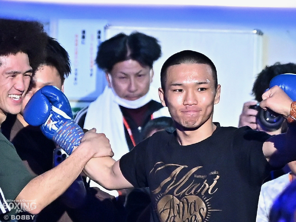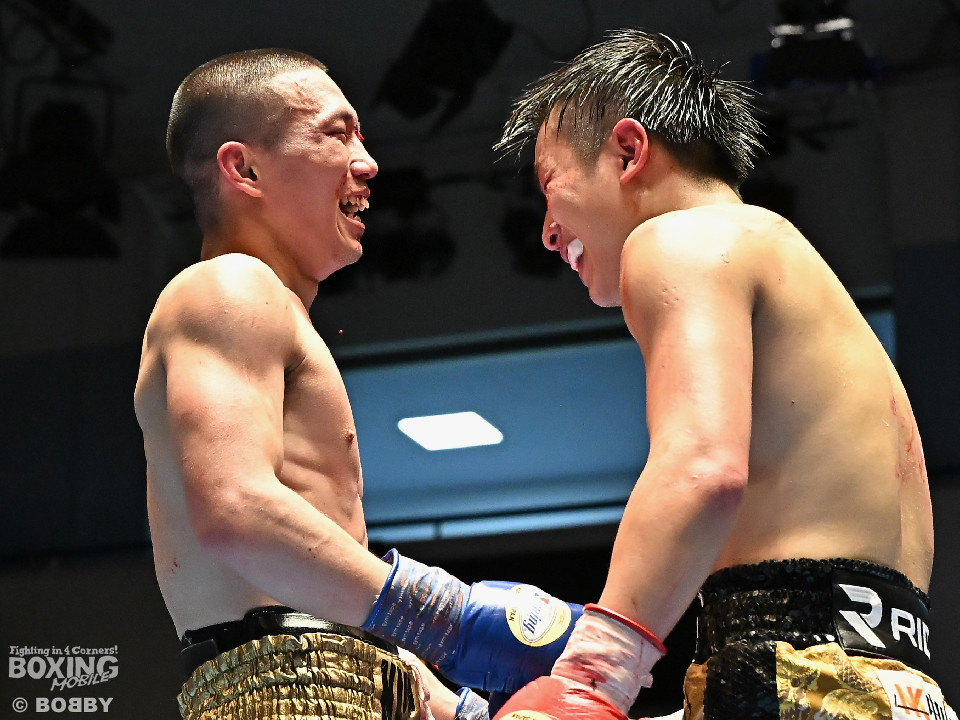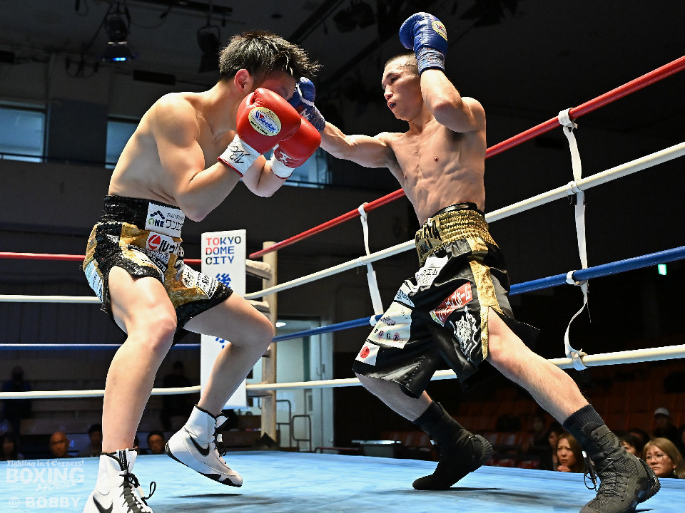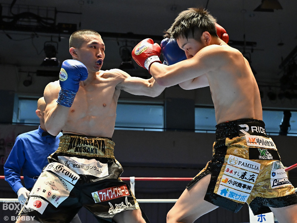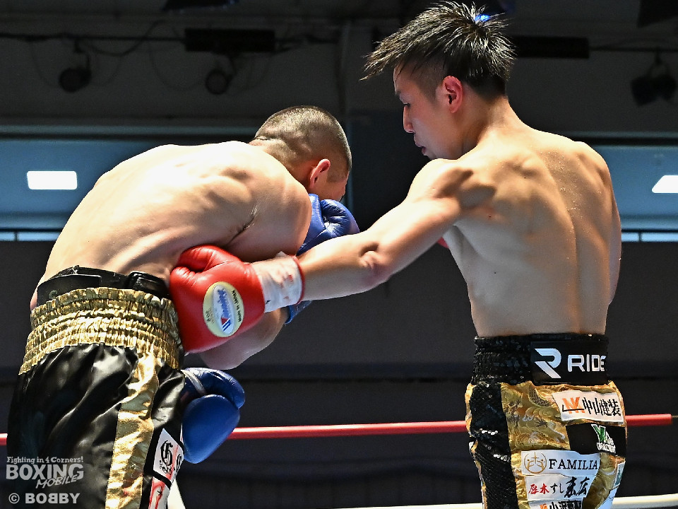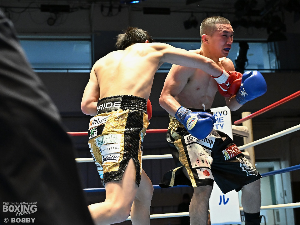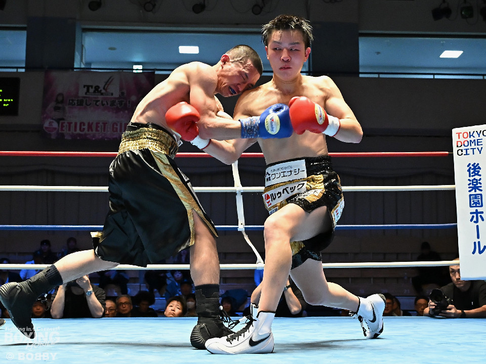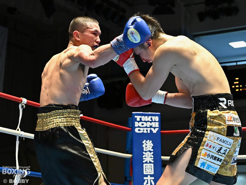 試合:渋谷がジャブを飛ばしながらプレスをかけるのに対し、稲元はサウスポーにスイッチして左オーバーハンドをヒット。ラウンド後半は、サークリングしながら的を絞らせず。2回、稲元は左フックから右ボディを突き刺すが、渋谷は負けじと左ボディを返した。3回、渋谷は右ボディアッパーを皮切りに上下に打ち分けると右フックでダウンを先取。再開後、ボディにパンチを集めて体力を削った。4回、渋谷はこれでもかと左ボディを打ち込むと右ストレートで顔を弾き攻勢。5回、渋谷はジワリジワリと距離を詰めてボディ攻撃を敢行。6回、稲元は右フック、左ストレートを合わせて反撃。このラウンド、稲元はヒッティングで左目上をカット。7回、お互いの意地がぶつかり合う中、稲元が脅威的な粘りを見せて猛追。8回、最後の力を使い切り、壮絶な打撃戦。稲元が力強いパンチを叩き込んだ。採点は割れたが稲元を支持。ダウンを挽回した稲元が撃戦を制した。