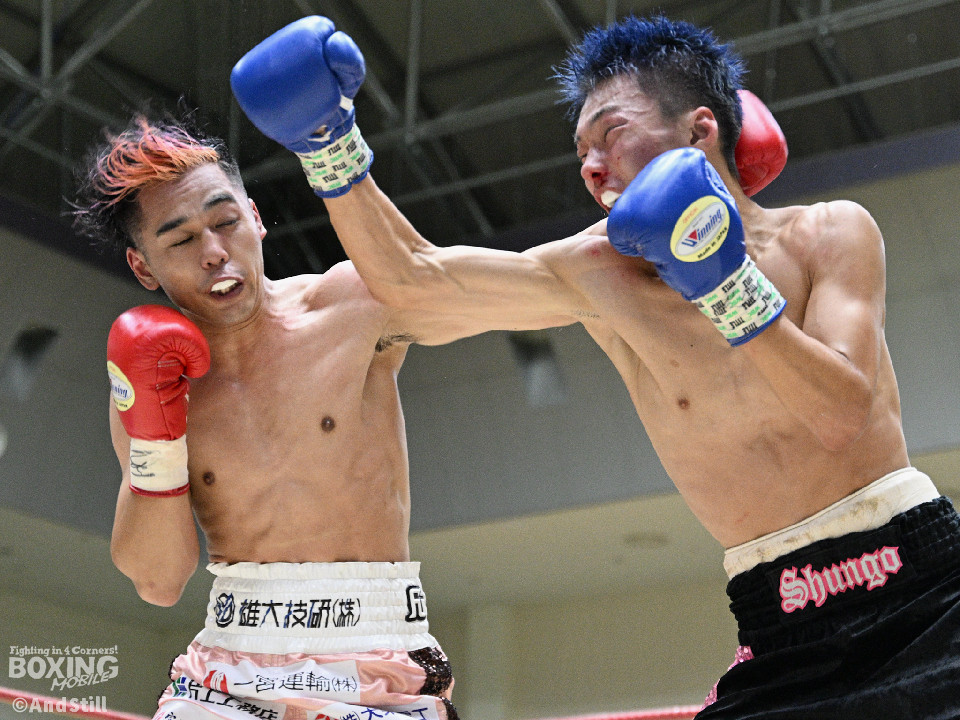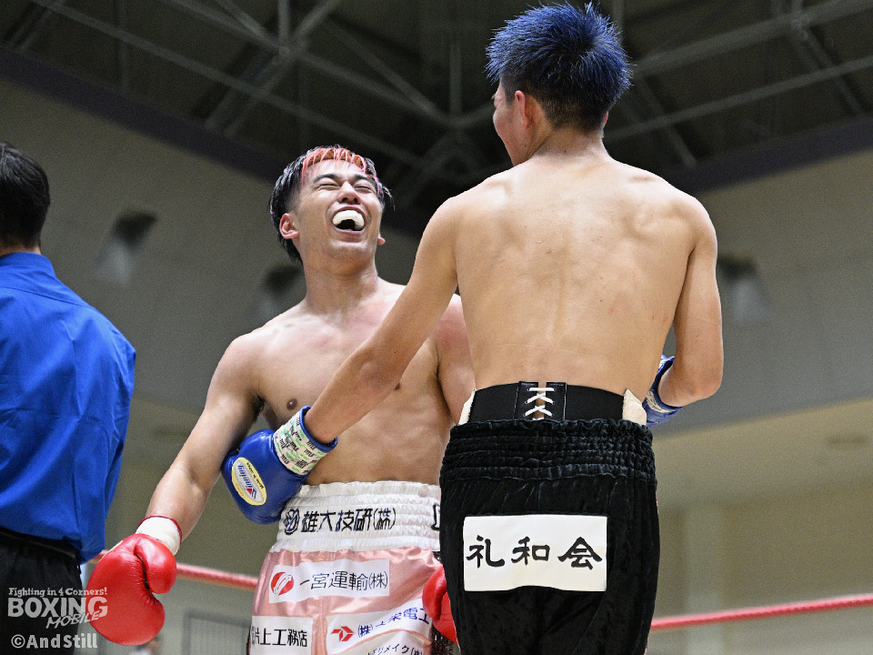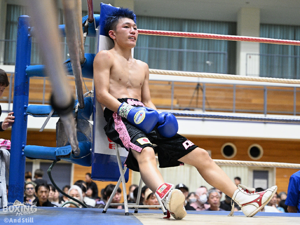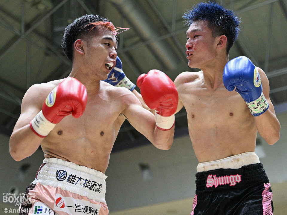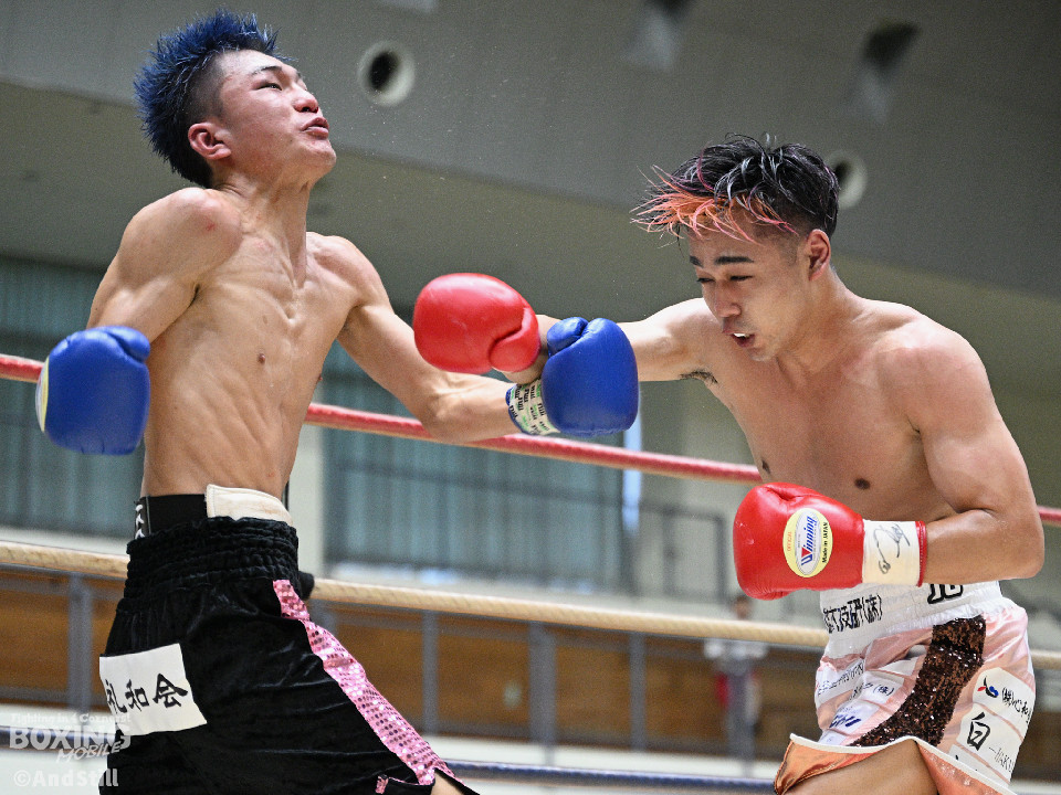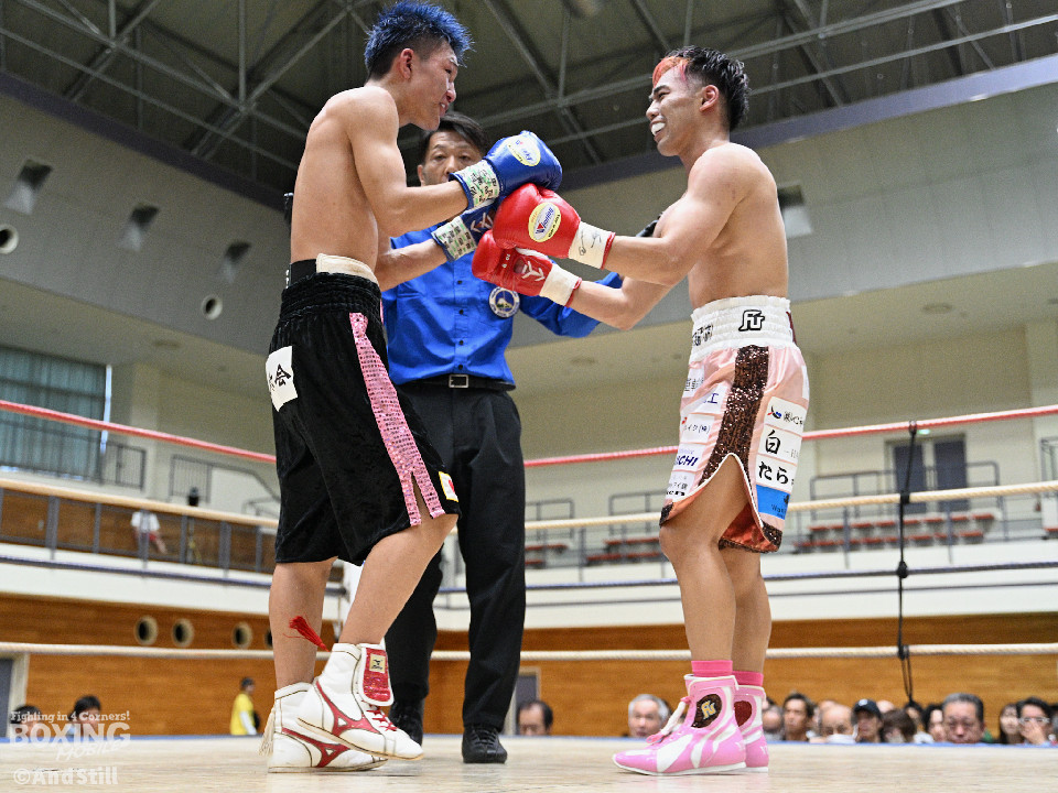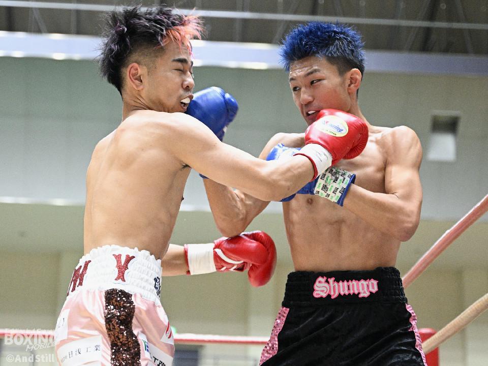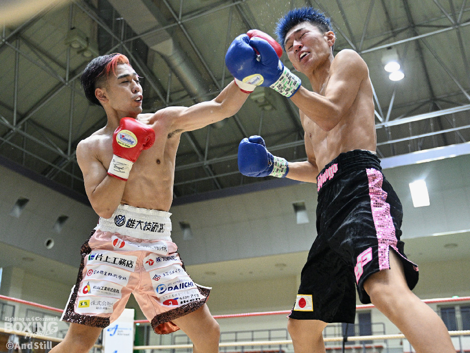試合:地元凱旋の竹本がサウスポーの横山と対決。初回、鋭い左ストレートの打ち下ろしでリズムを作った横山に対して、徐々にプレスをかけた竹本が右ストレートで顔面を弾いた。2回、右を上下に打ち分けて左ストレートに繋いだ横山に対して、スウェイでディフェンス力を見せた竹本だったが、横山の右のショートカウンターでダウン。すぐに立ち上がって右ストレートを返した。3回、リングの中央から中に入る竹本に対して、リングを回りながらジャブと左ストレートを突いて距離を保った。最終回、左右のフックでリズムを作った竹本がアッパーを織り交ぜて手数を増やすが、横山も右フックと左ストレートを顔面に打ち返した。再三逆転のチャンスを掴みかけた竹本は、地元ファンからの大きな拍手で労われた。