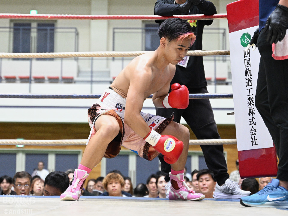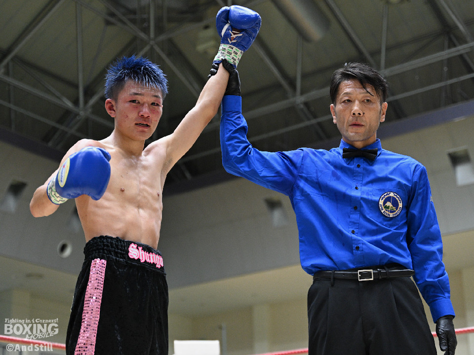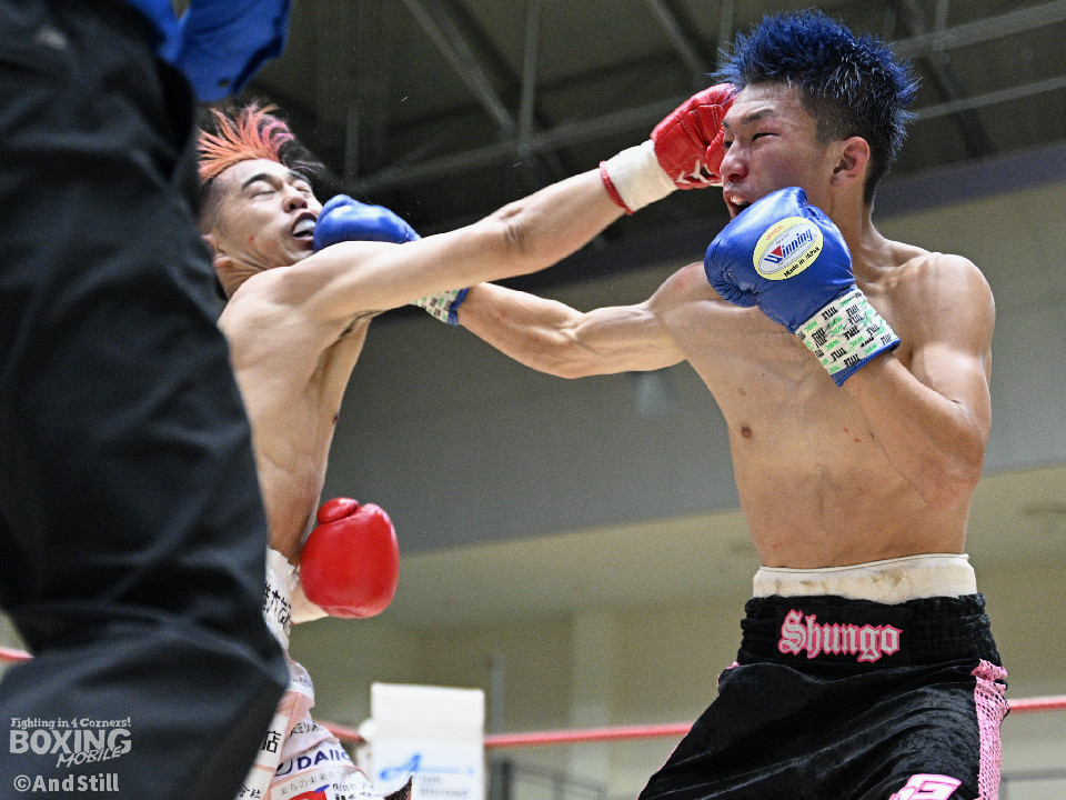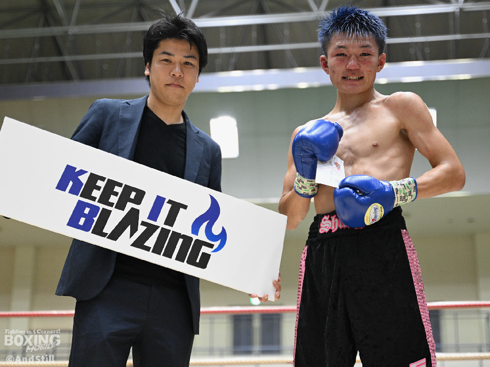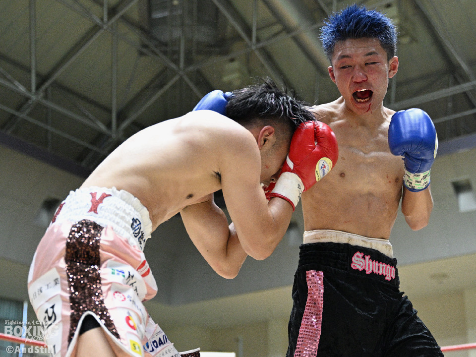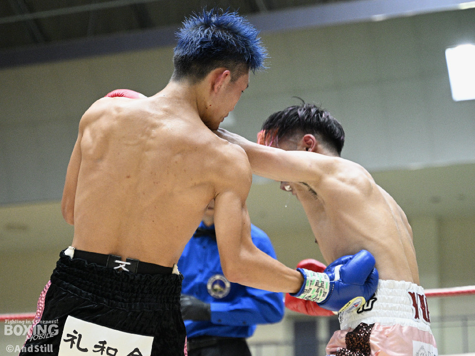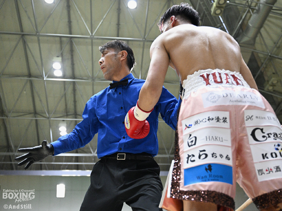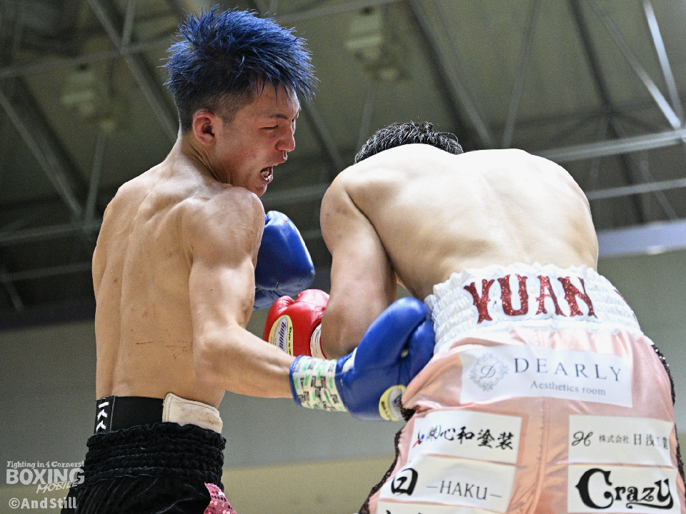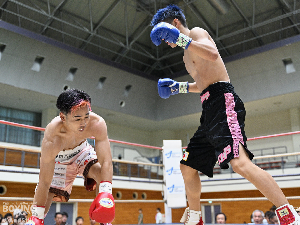 試合:地元凱旋の竹本がサウスポーの横山と対決。初回、鋭い左ストレートの打ち下ろしでリズムを作った横山に対して、徐々にプレスをかけた竹本が右ストレートで顔面を弾いた。2回、右を上下に打ち分けて左ストレートに繋いだ横山に対して、スウェイでディフェンス力を見せた竹本だったが、横山の右のショートカウンターでダウン。すぐに立ち上がって右ストレートを返した。3回、リングの中央から中に入る竹本に対して、リングを回りながらジャブと左ストレートを突いて距離を保った。最終回、左右のフックでリズムを作った竹本がアッパーを織り交ぜて手数を増やすが、横山も右フックと左ストレートを顔面に打ち返した。再三逆転のチャンスを掴みかけた竹本は、地元ファンからの大きな拍手で労われた。