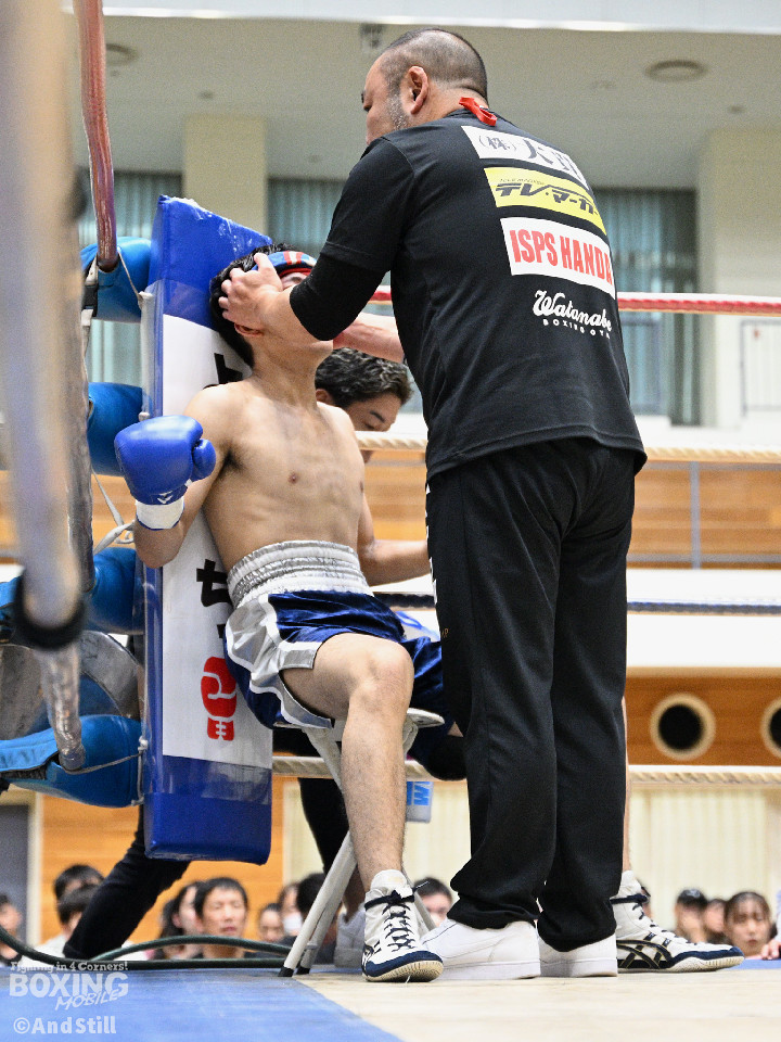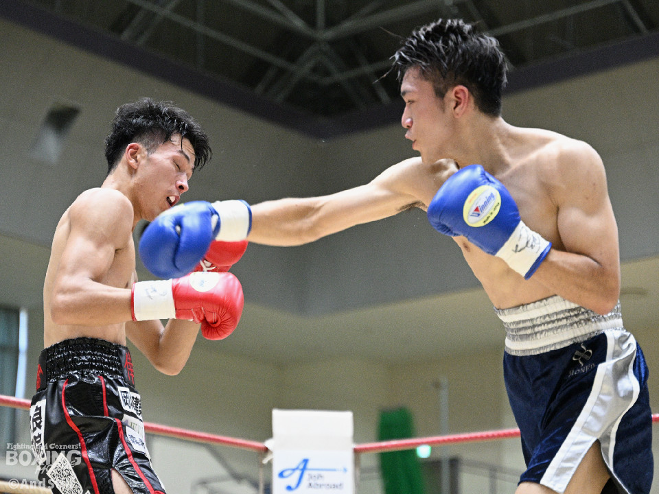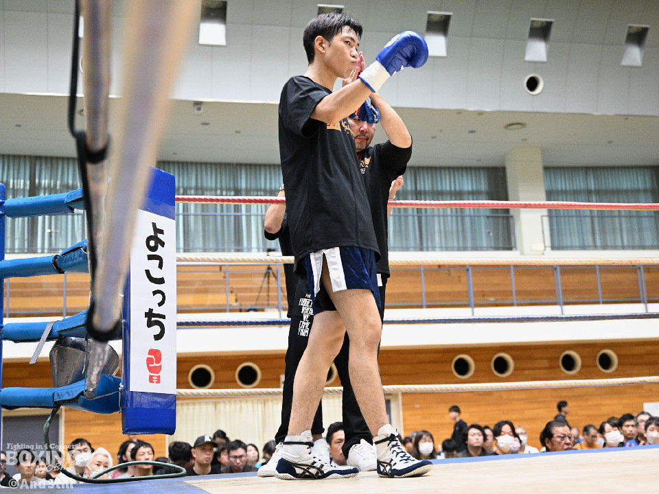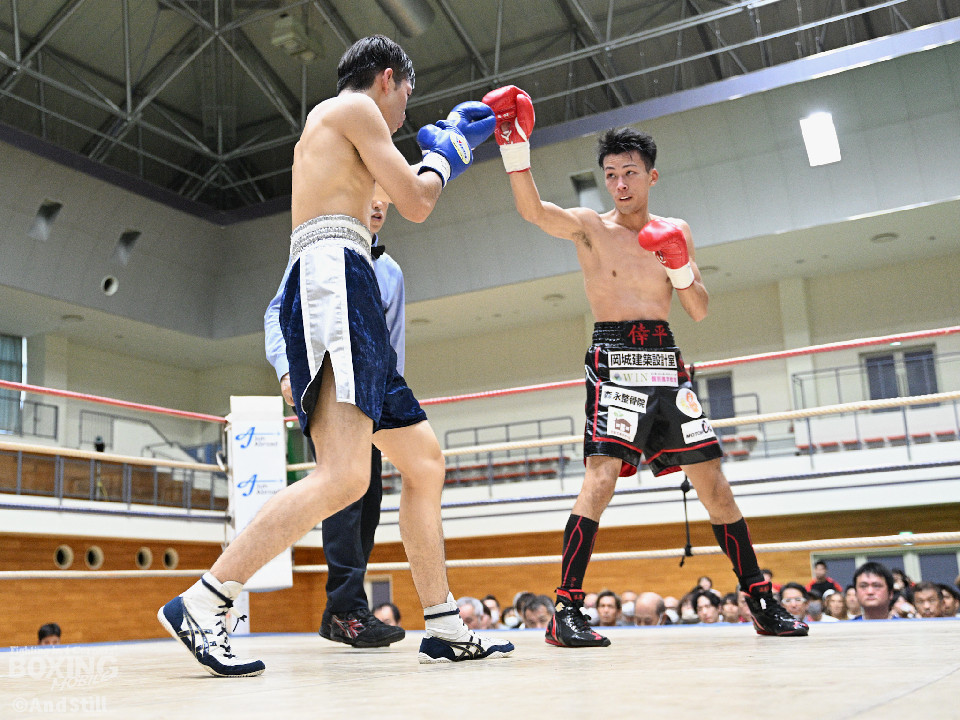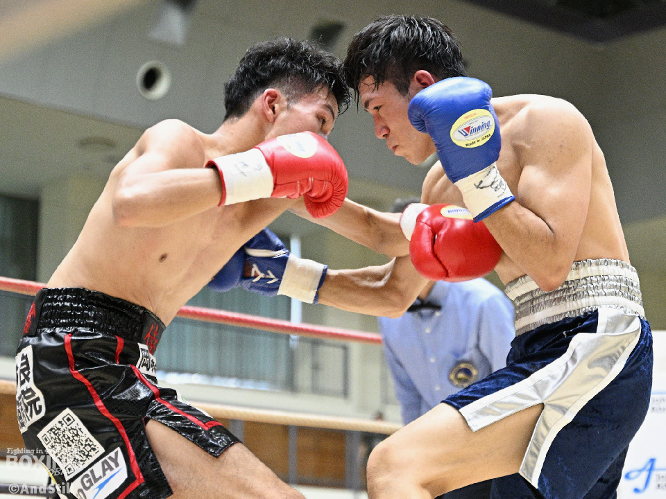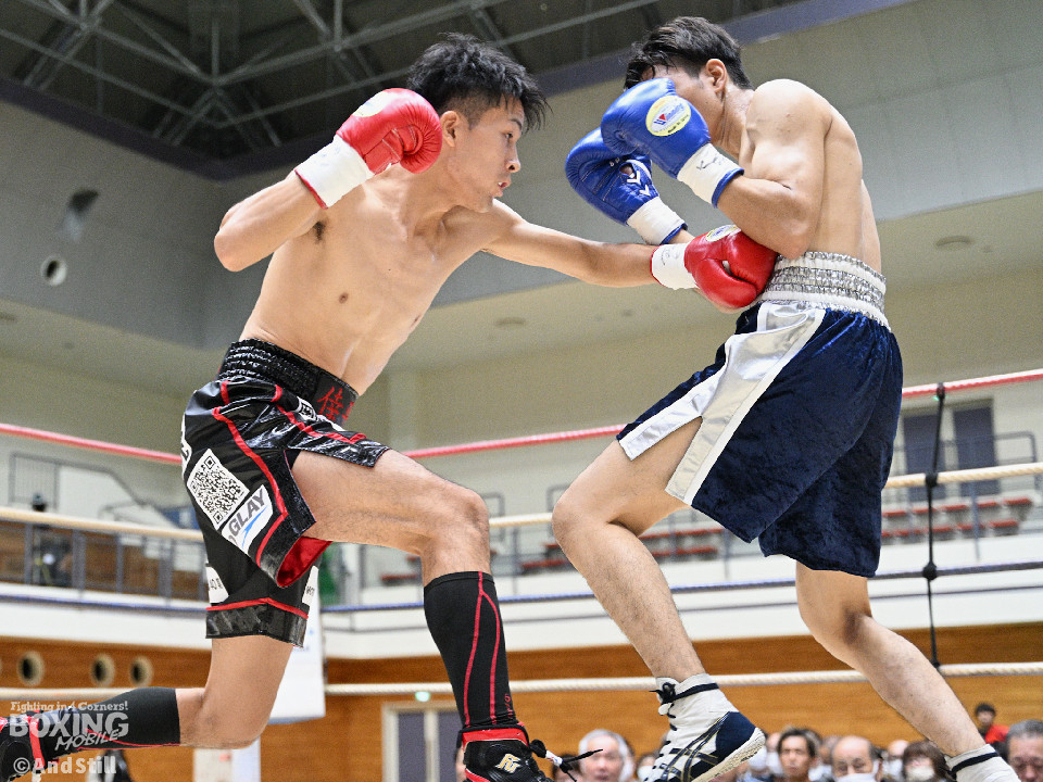 試合:サウスポーの山川がリングを反時計回りに動きながらジャブを突くのに対して渡邉は距離を詰めてジャブを返した。2回、山川は左右のボディと右フックと左ストレートでポイントを稼ぐ。渡邉は右ストレートでボディを狙う。山川の右フックには右を被せたが詰め切れず。3回、足を使う山川を渡邉が追う展開が続く中、渡邉は左右のボディを叩くが、山川も左ストレートと右フックでリズムを保った。最終回、山川のボディを削りにいった渡邉だったが、山川の足を止められず。山川は右フックと左ストレートでポイントアウトした。