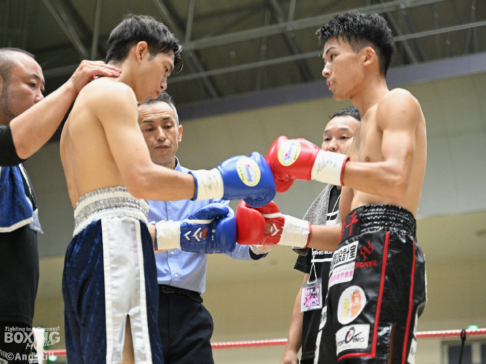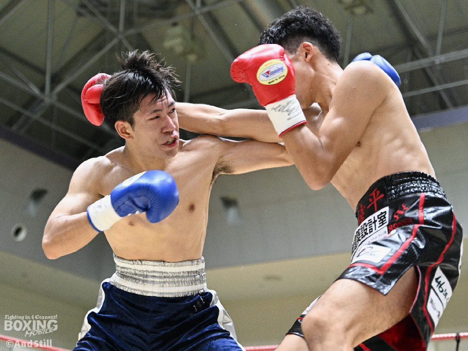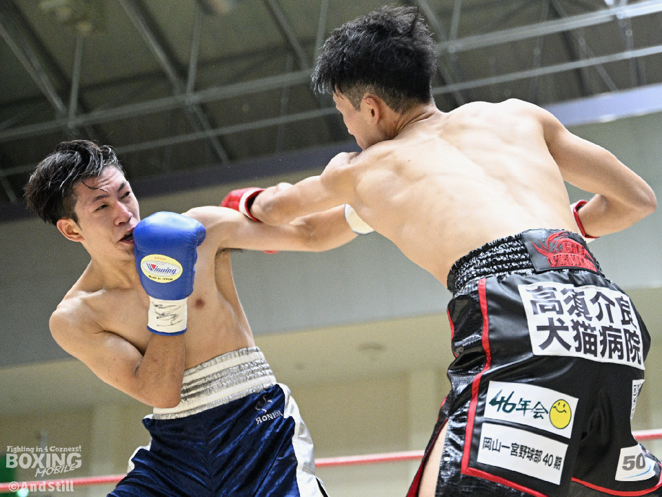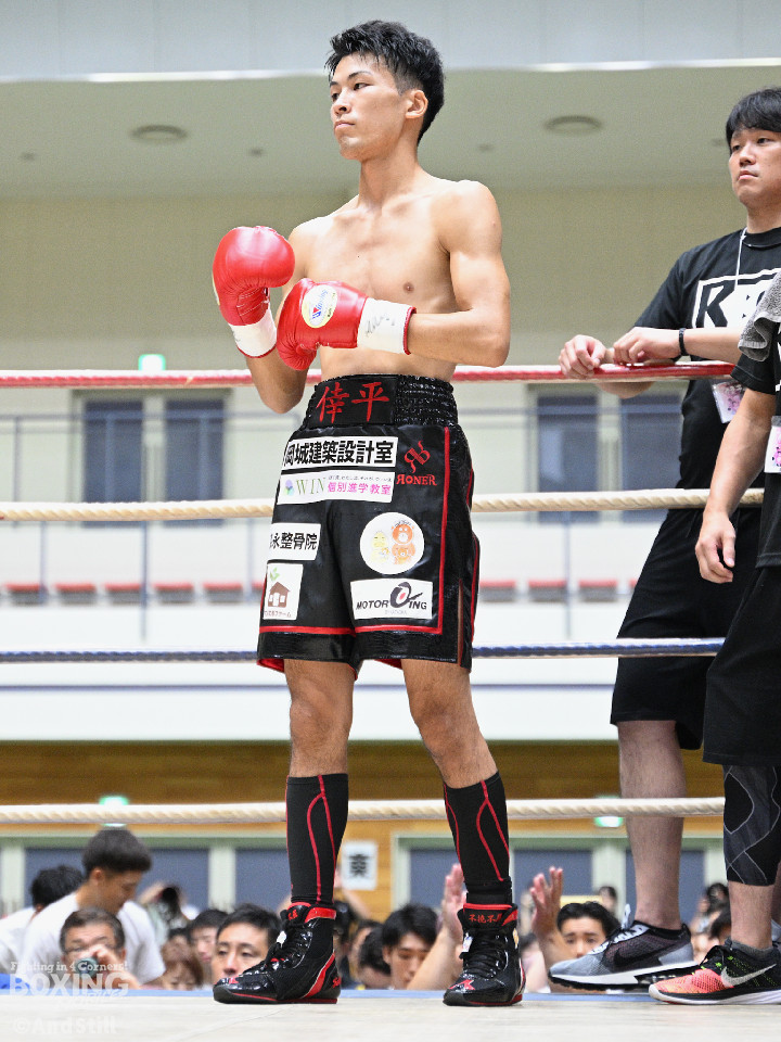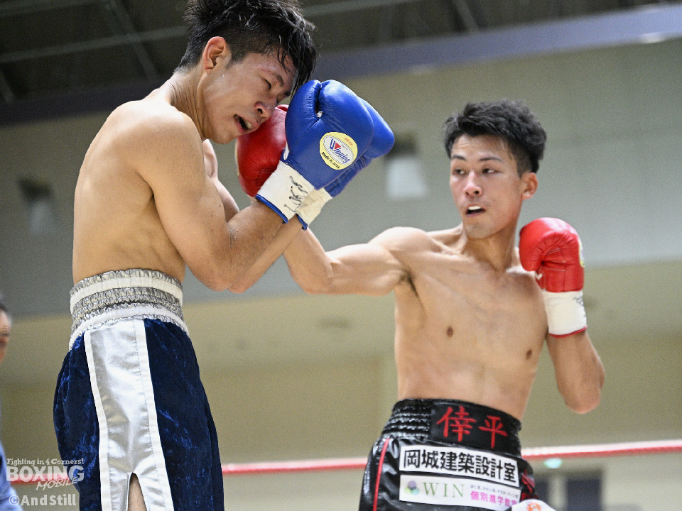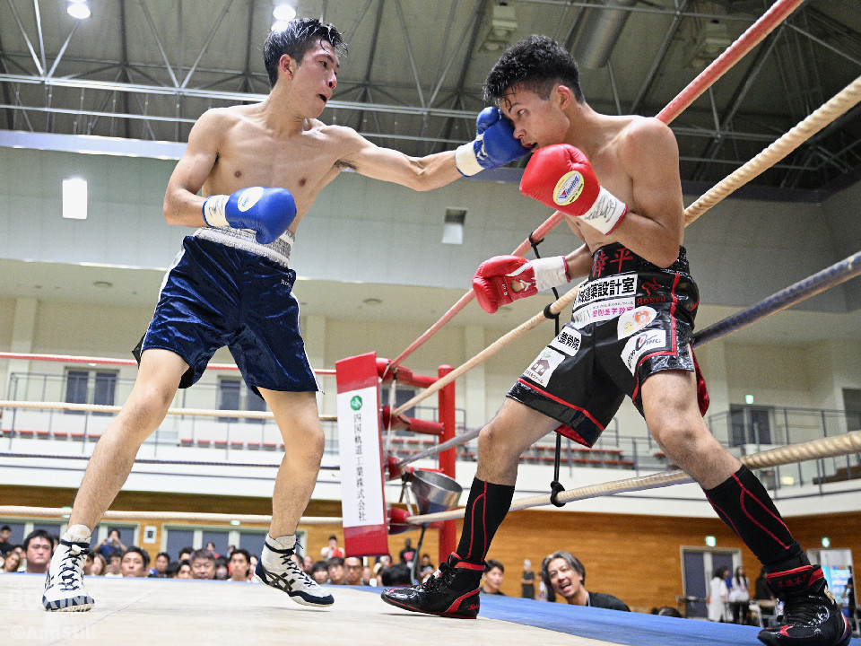 試合:サウスポーの山川がリングを反時計回りに動きながらジャブを突くのに対して渡邉は距離を詰めてジャブを返した。2回、山川は左右のボディと右フックと左ストレートでポイントを稼ぐ。渡邉は右ストレートでボディを狙う。山川の右フックには右を被せたが詰め切れず。3回、足を使う山川を渡邉が追う展開が続く中、渡邉は左右のボディを叩くが、山川も左ストレートと右フックでリズムを保った。最終回、山川のボディを削りにいった渡邉だったが、山川の足を止められず。山川は右フックと左ストレートでポイントアウトした。