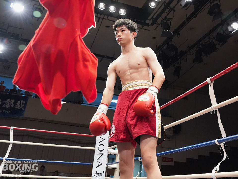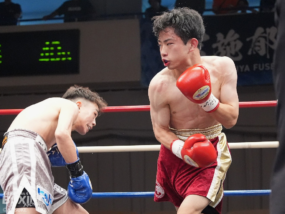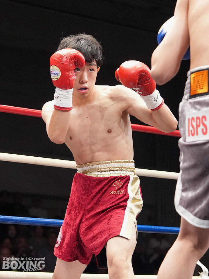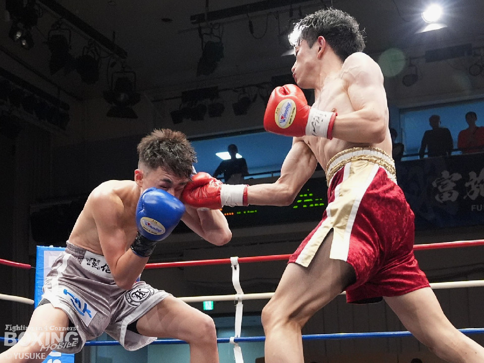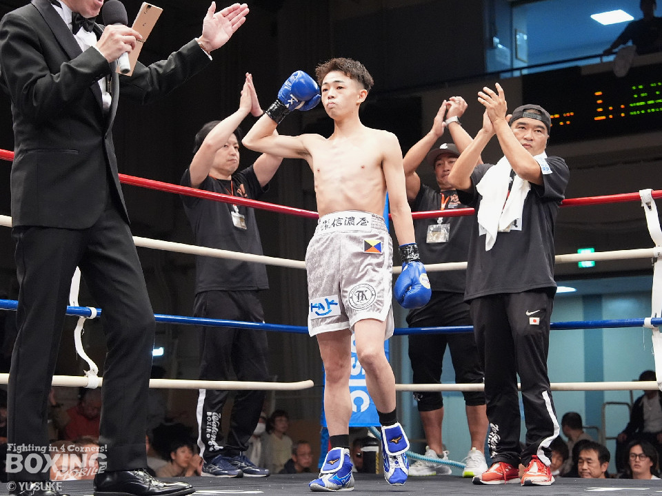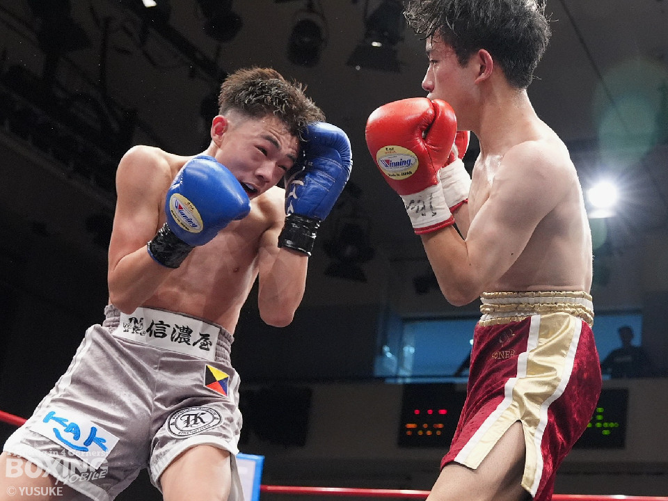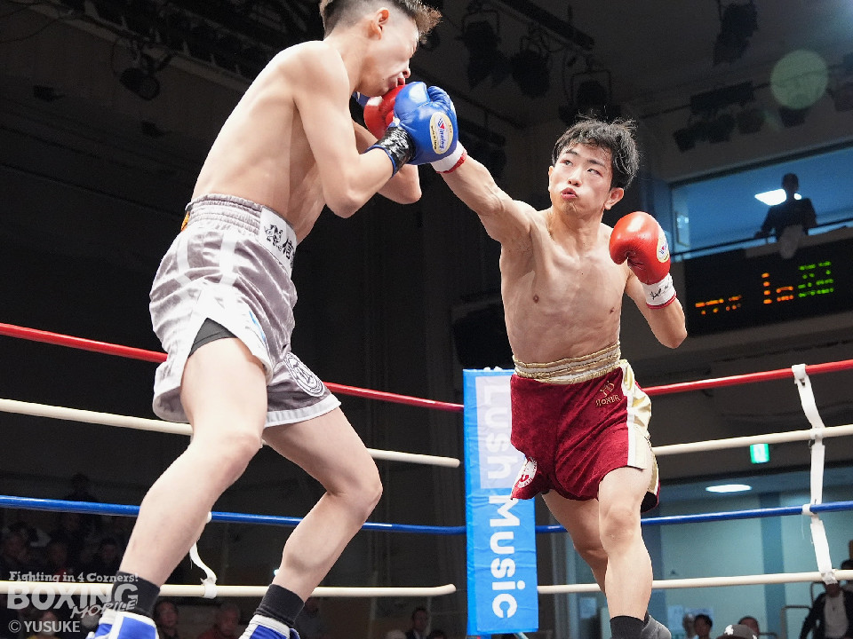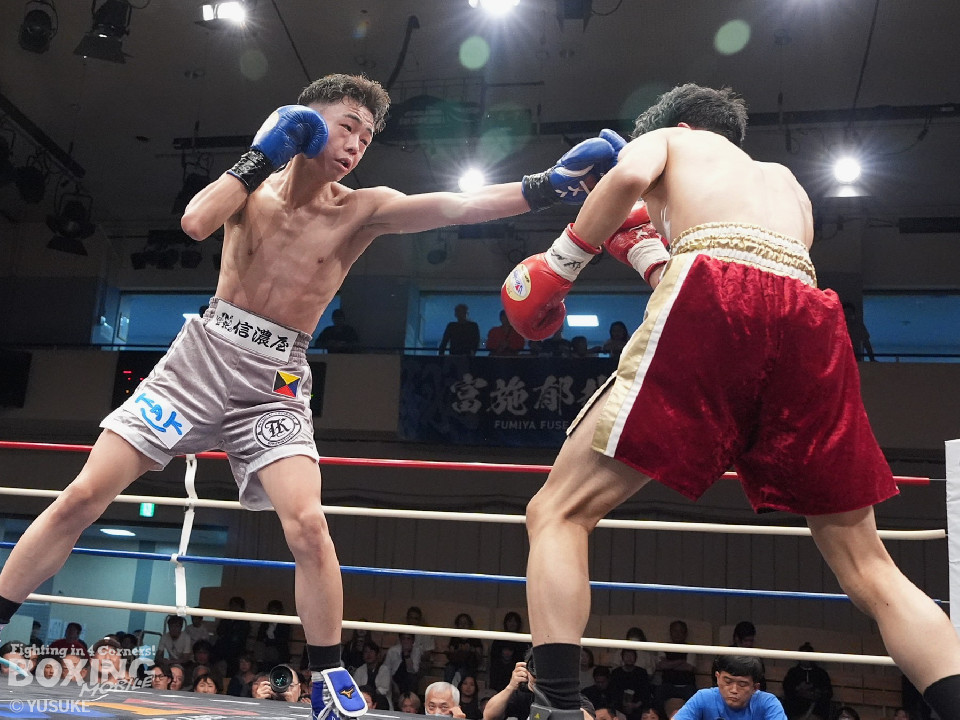 試合:梅澤がジャブからワンツーにつなげて先制攻撃を仕掛けると左フックを好打。返しのパンチをバックステップで回避しペースを掌握。2回、星野は右フックを強振するがこれはブロックの上。タイミングを図った梅澤は右カウンターで鮮やかに倒した。3回、流れを変えたい星野は右フックをブン!と振り回しアグレッシブな姿勢。このラウンド梅澤は後手に回った。4回、星野は強引に前に出て左右フックで攻勢。ラウンド終盤、右フックで浴びてグラついた梅澤はクリンチでピンチを乗り切った。相手の猛追を振り切った梅澤が初勝利した。