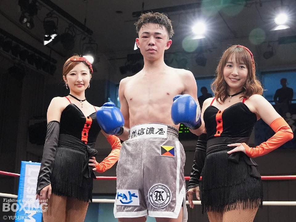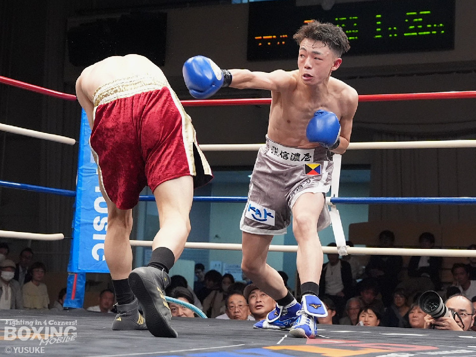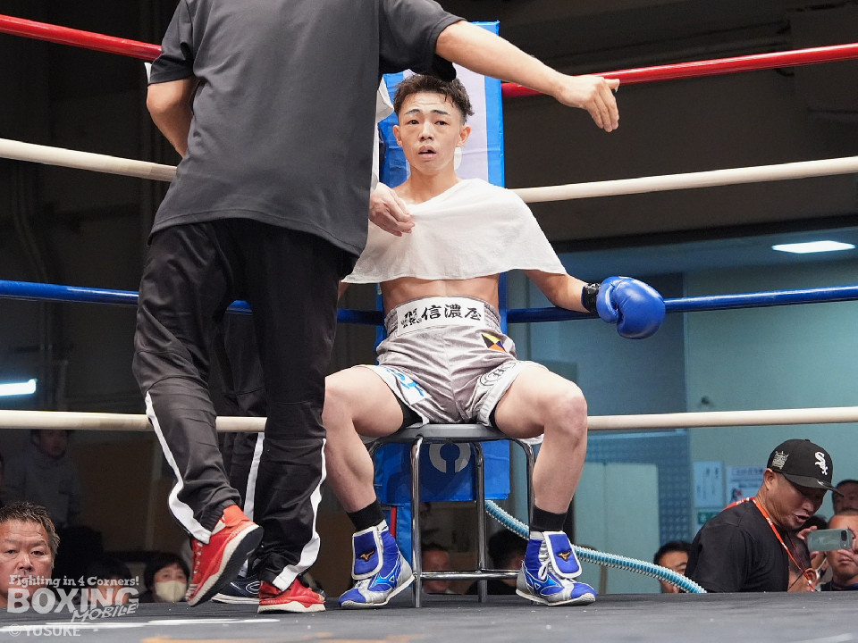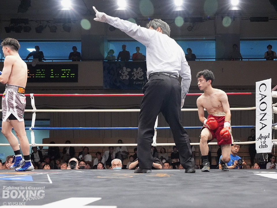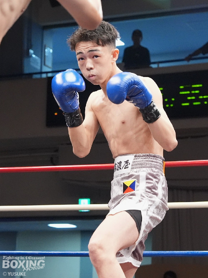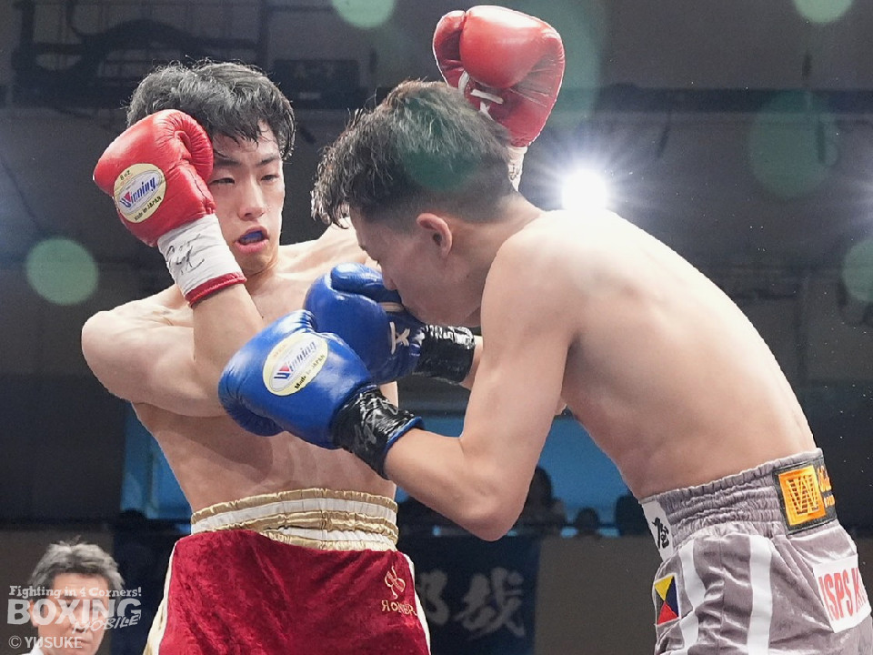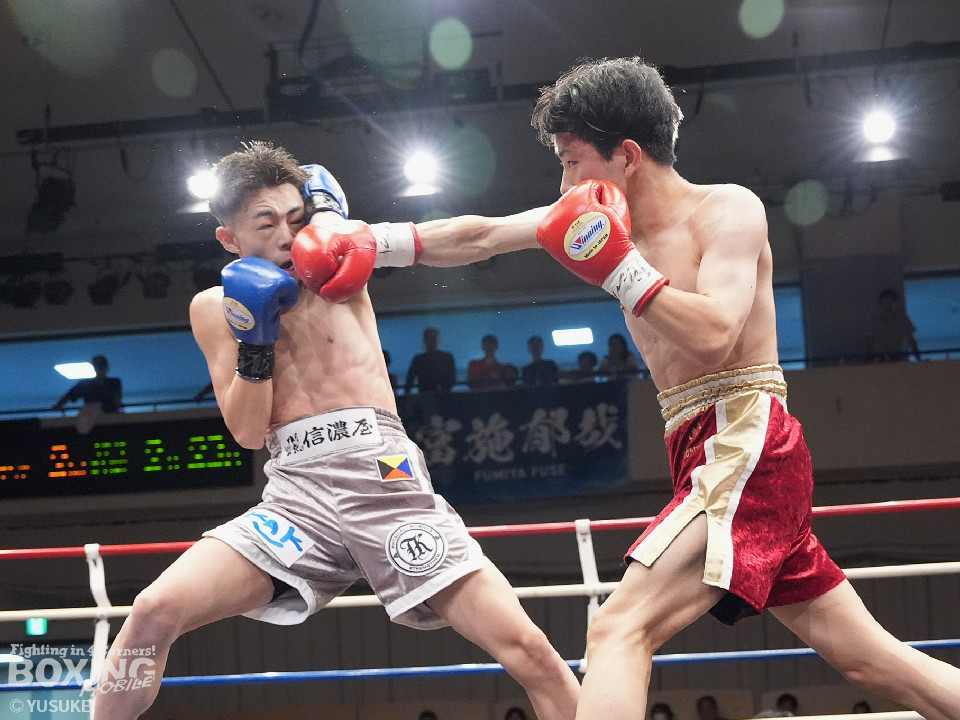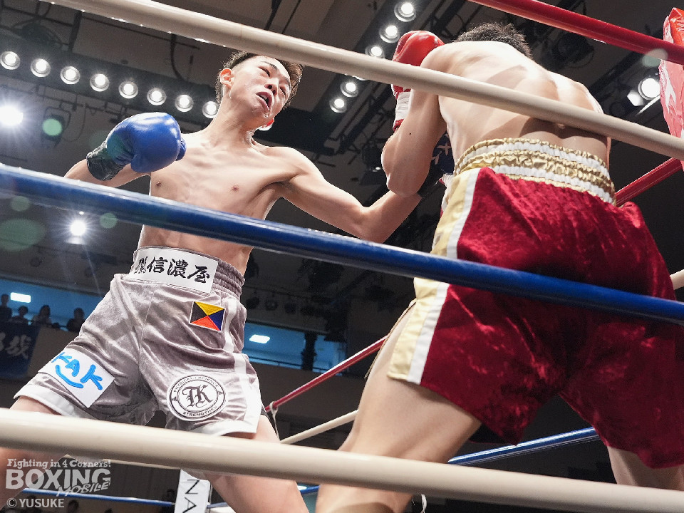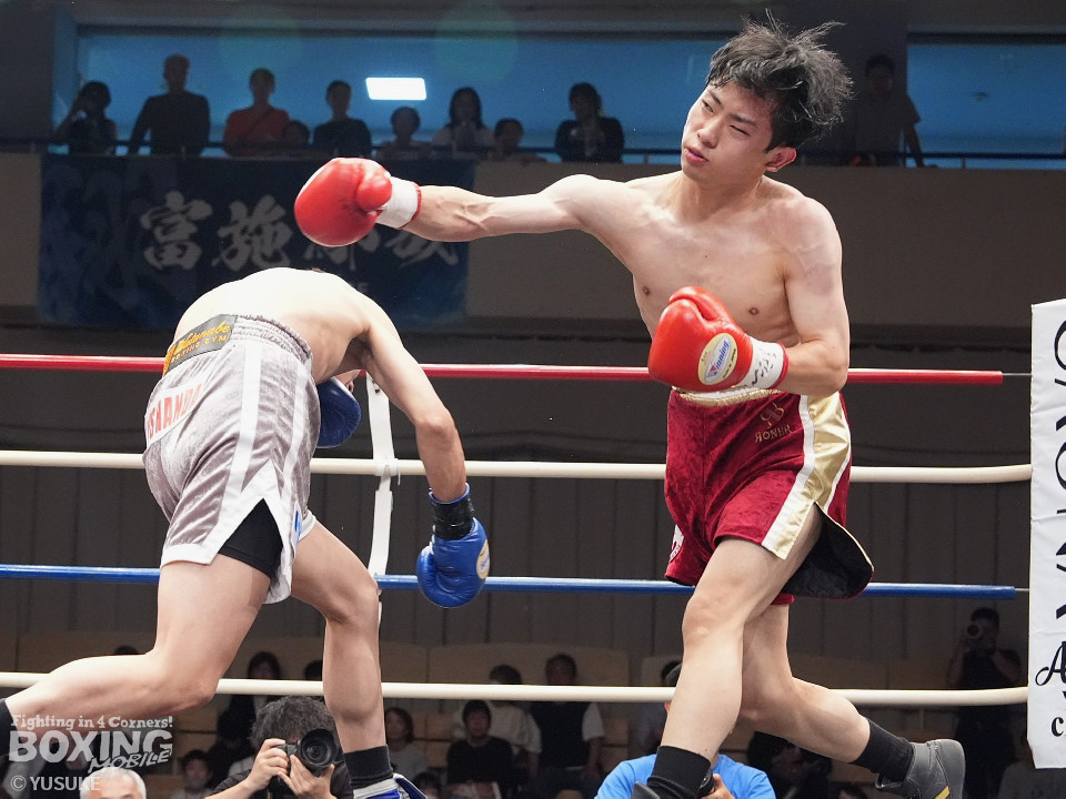 試合:梅澤がジャブからワンツーにつなげて先制攻撃を仕掛けると左フックを好打。返しのパンチをバックステップで回避しペースを掌握。2回、星野は右フックを強振するがこれはブロックの上。タイミングを図った梅澤は右カウンターで鮮やかに倒した。3回、流れを変えたい星野は右フックをブン!と振り回しアグレッシブな姿勢。このラウンド梅澤は後手に回った。4回、星野は強引に前に出て左右フックで攻勢。ラウンド終盤、右フックで浴びてグラついた梅澤はクリンチでピンチを乗り切った。相手の猛追を振り切った梅澤が初勝利した。