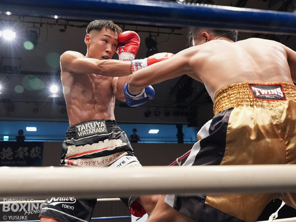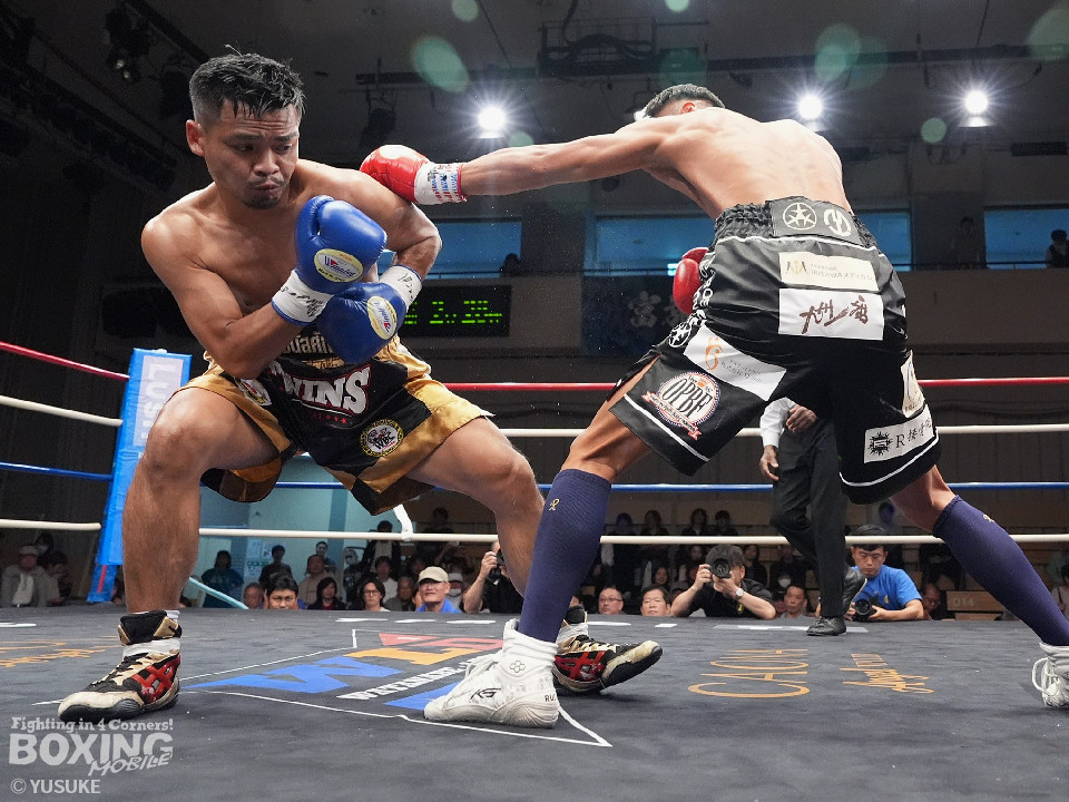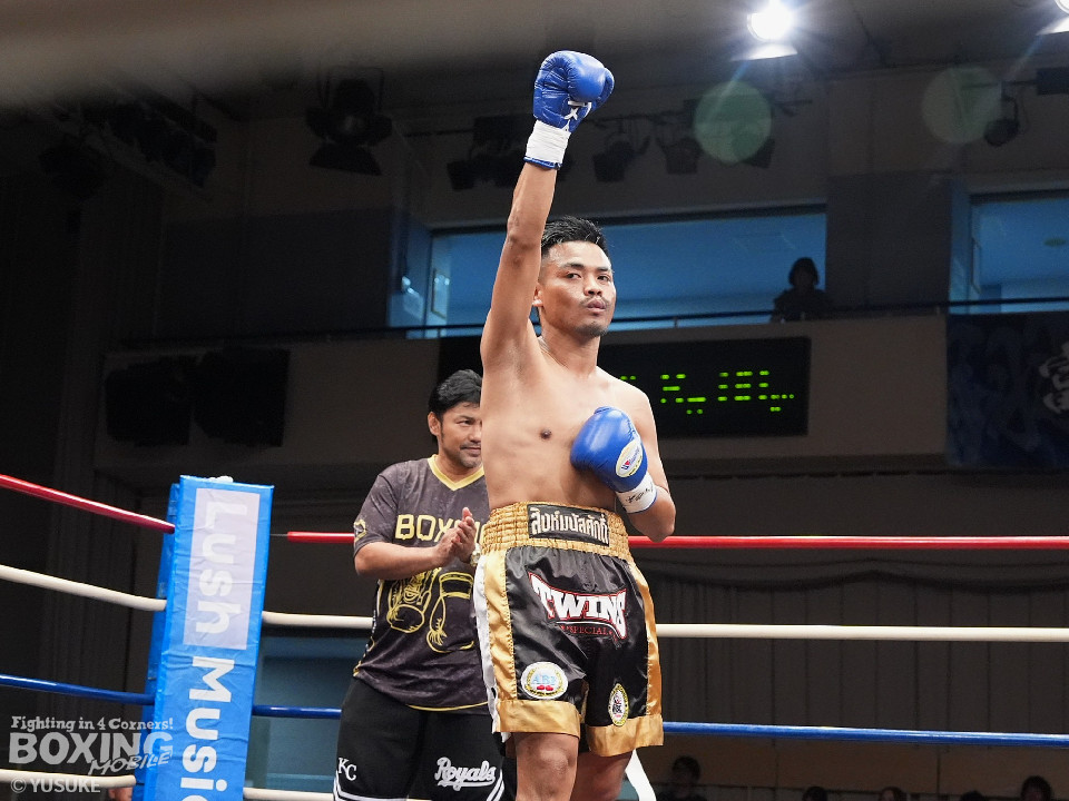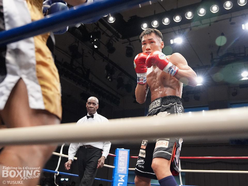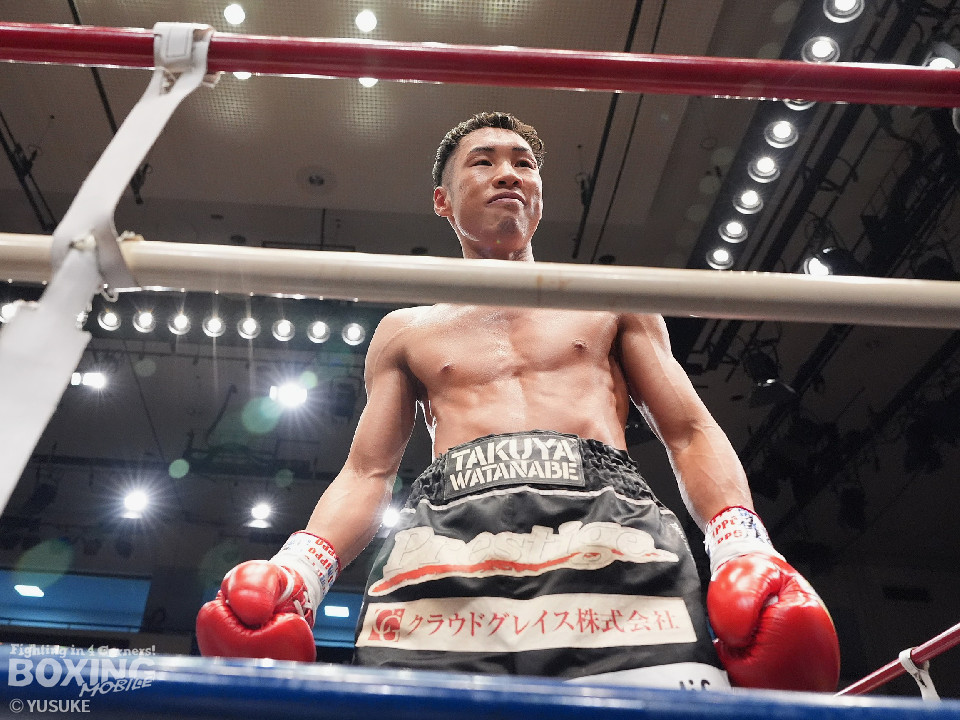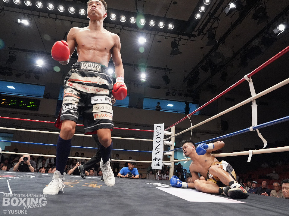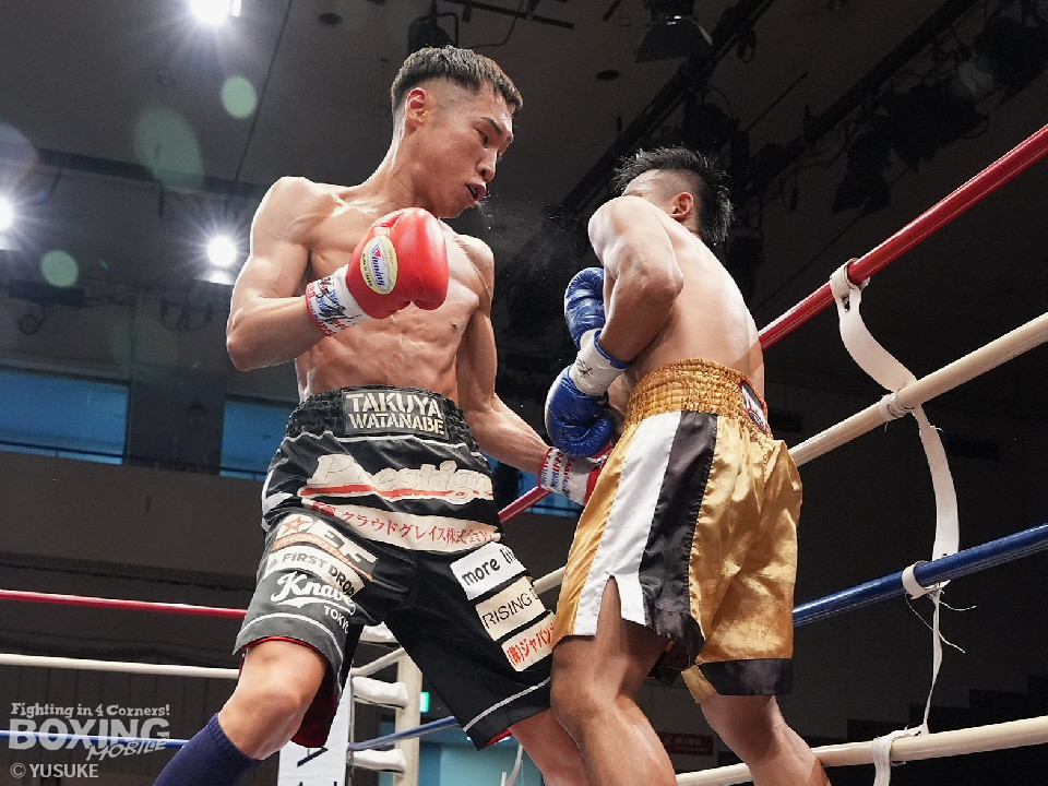 試合:元WBOアジアパシフィック王者の渡邉がジリジリと距離を詰めて単発の左フックをヒット。パティパーンはのらりくらりとつかみどころのない動きを見せた。2回、渡邉はプレスをかけて左ボディで動きを止めるとドンピシャの右ストレートでダウンをゲット。立ち上ったパティパーンだが、ダメージありと見たレフェリーは10カウントを数え上げた。渡邉は見事なKO勝ちで復活を遂げた。