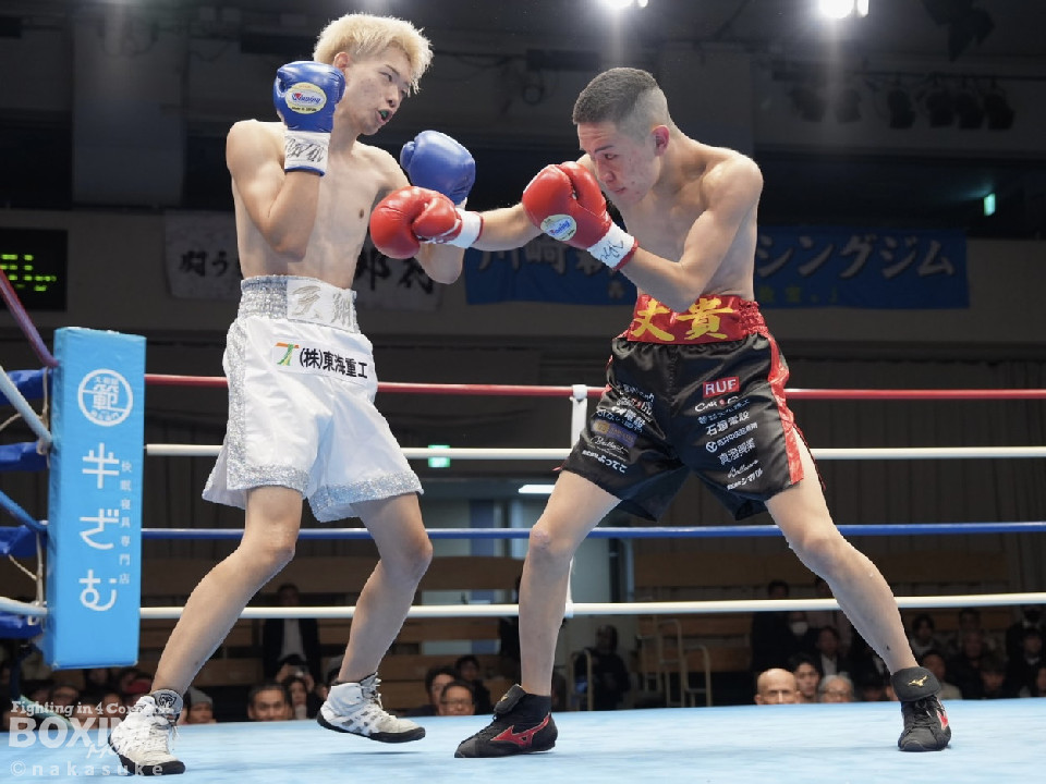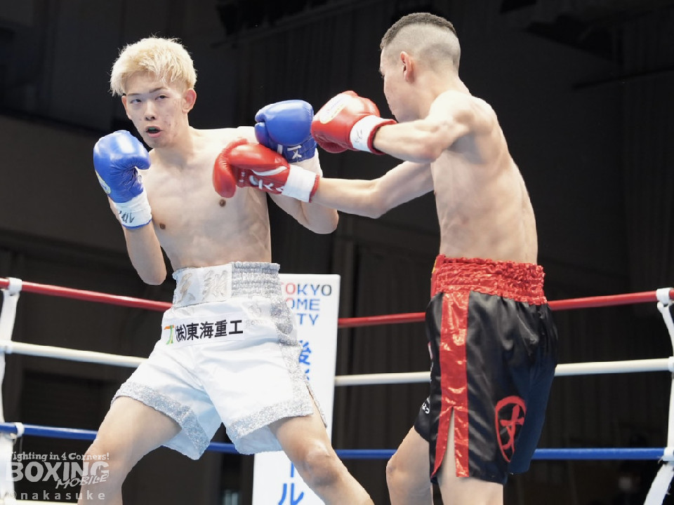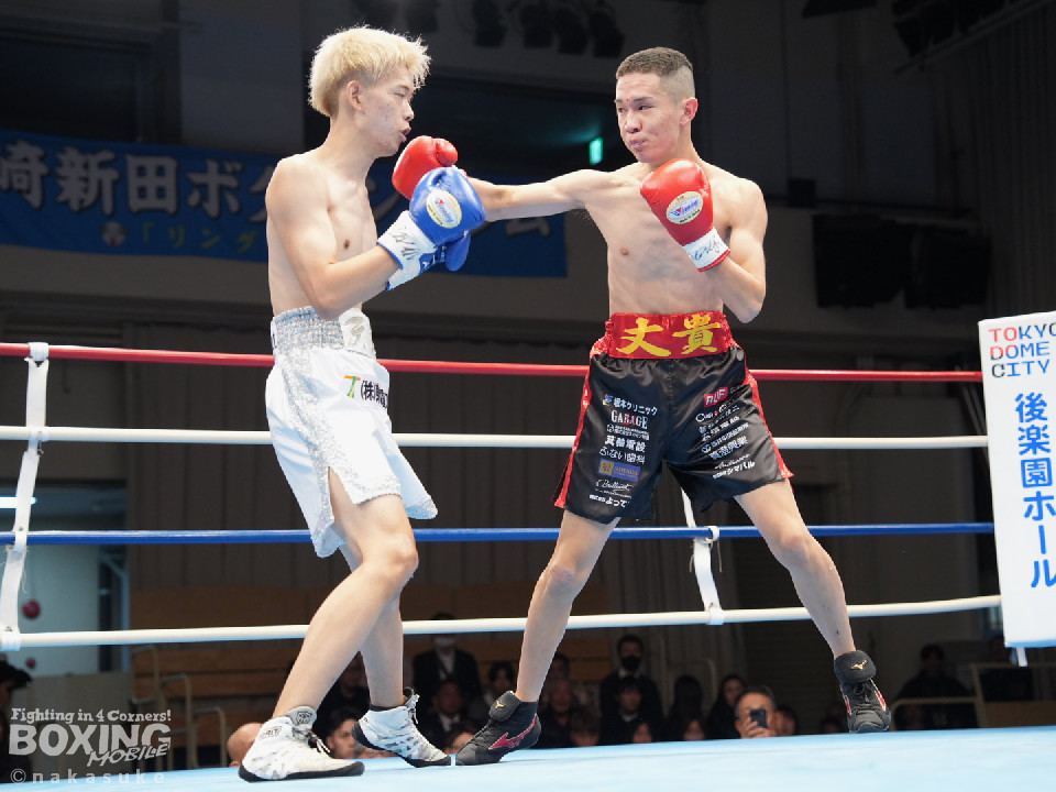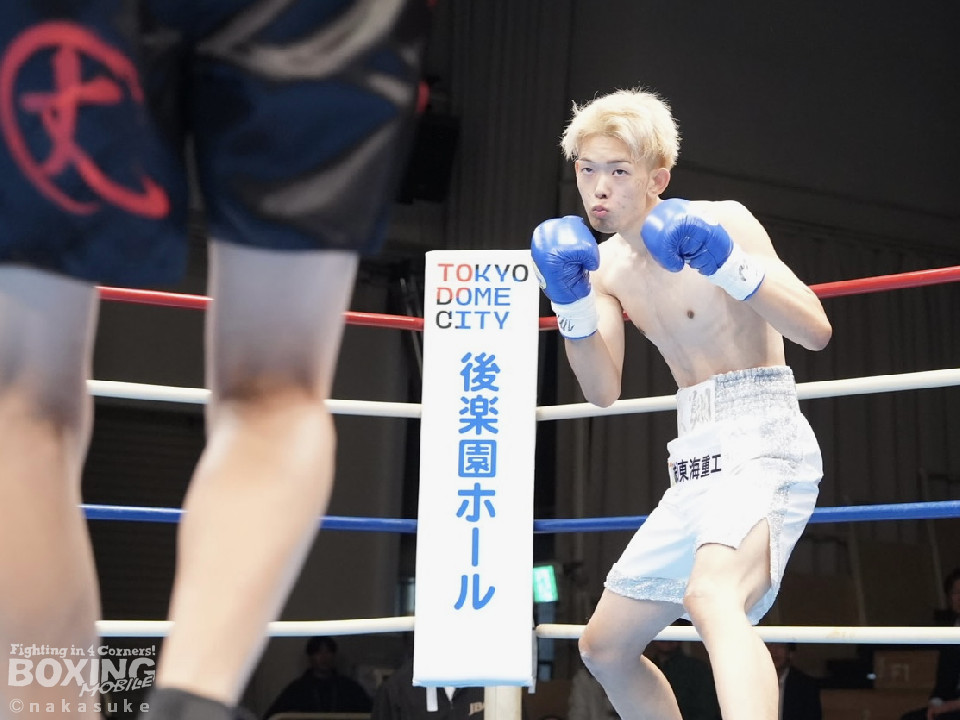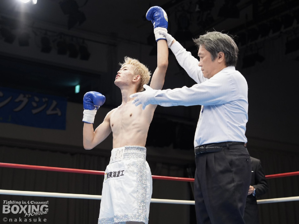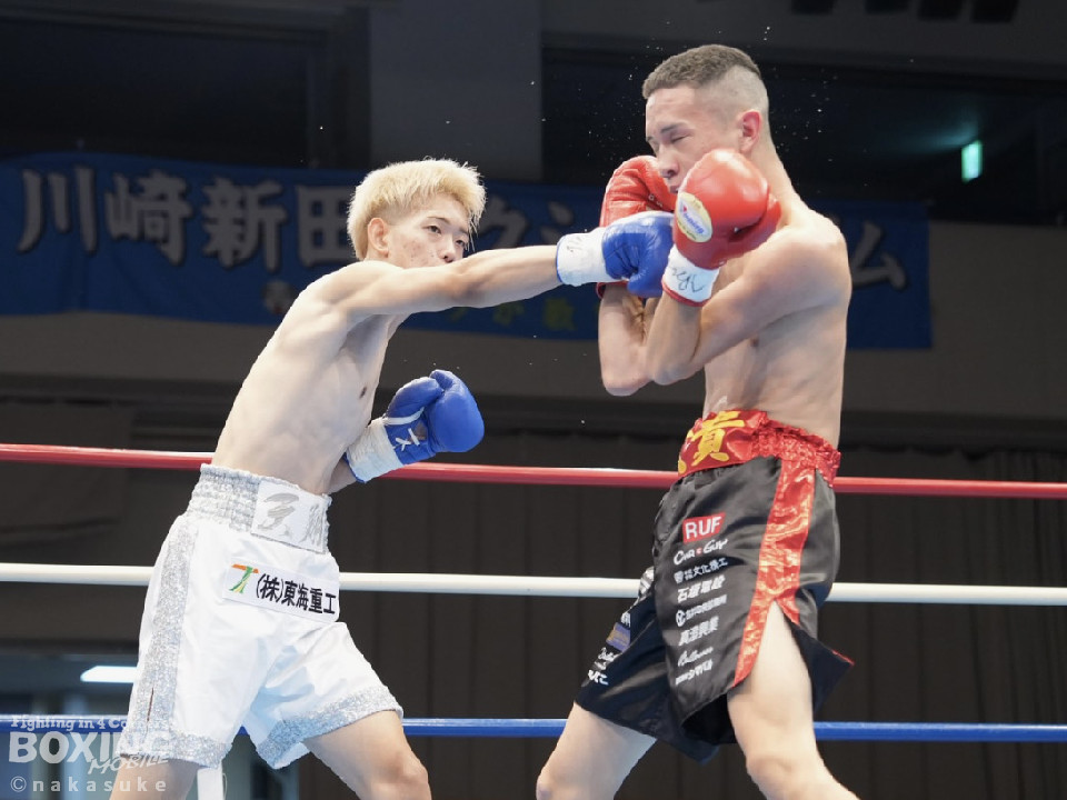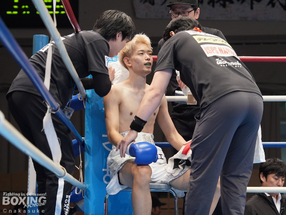 試合:開始10秒、サウスポー斉藤の左ストレートが火を噴きダウンを奪取。出鼻を挫かれた磯部だが、ジャブから立て直しを図るとワンツーを返した。2回、磯部はワンツーで顔を弾くと上下に打ち分け反撃。3回、磯部はワンツーでグラつかせるとパンチをまとめてフィニッシュにつなげた。磯部が逆転KOで初勝利を飾った。