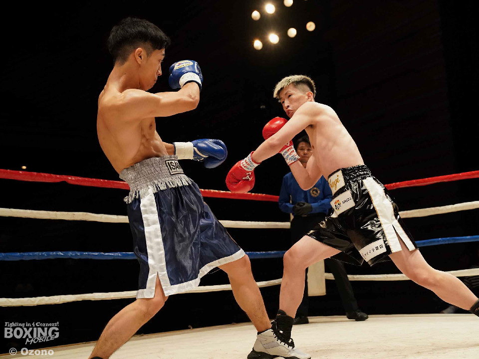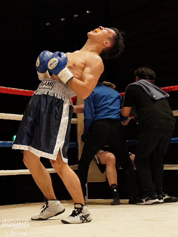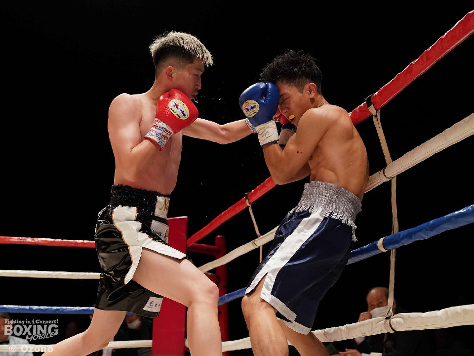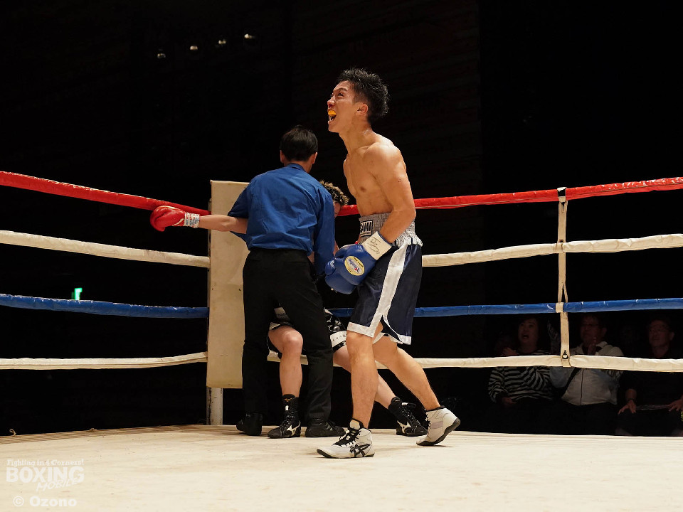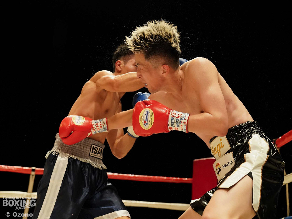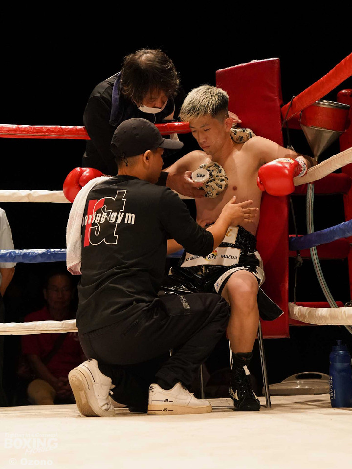 試合:サウスポー前田がジャブを飛ばして距離をキープ。2回、右ストレートにつなげたい宮下だが、距離が遠いのかあと一歩が踏み込めず。3回、前田はステップを刻みながら左ショートでダウンをゲット。再開後、仕留めに行くが宮下は左フックで膝を揺らすとグイグイと攻めてて反撃。4回、宮下は右フックでグラつかせるとコーナーに詰めてこれでもかと左ボディを叩くと防戦一方になった前田を見てレフェリーが割って入った。宮下が逆転KO勝ちを飾った。