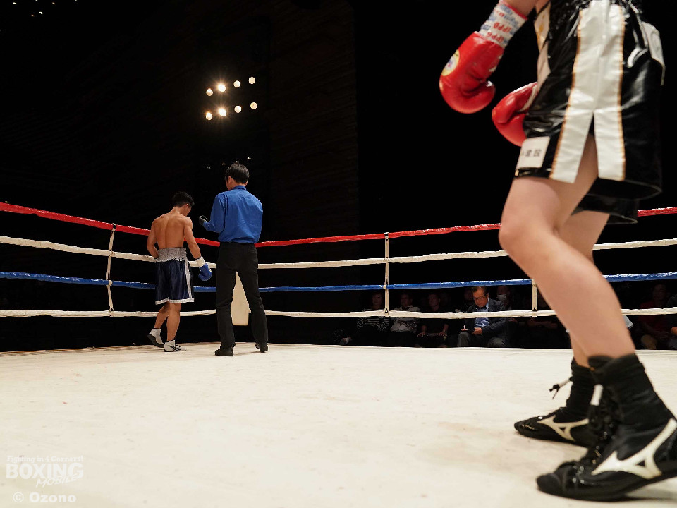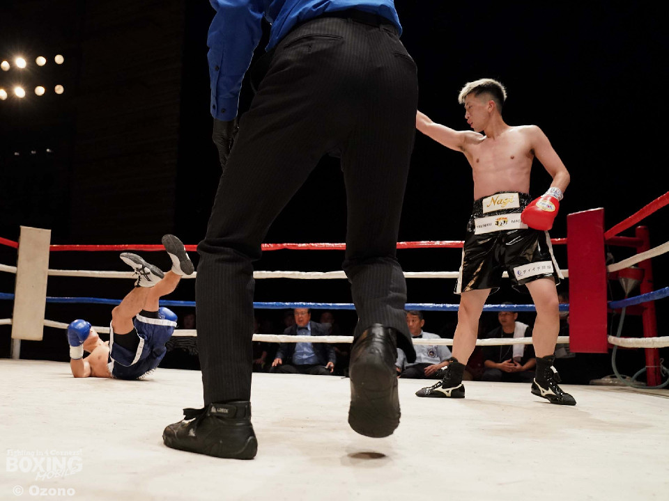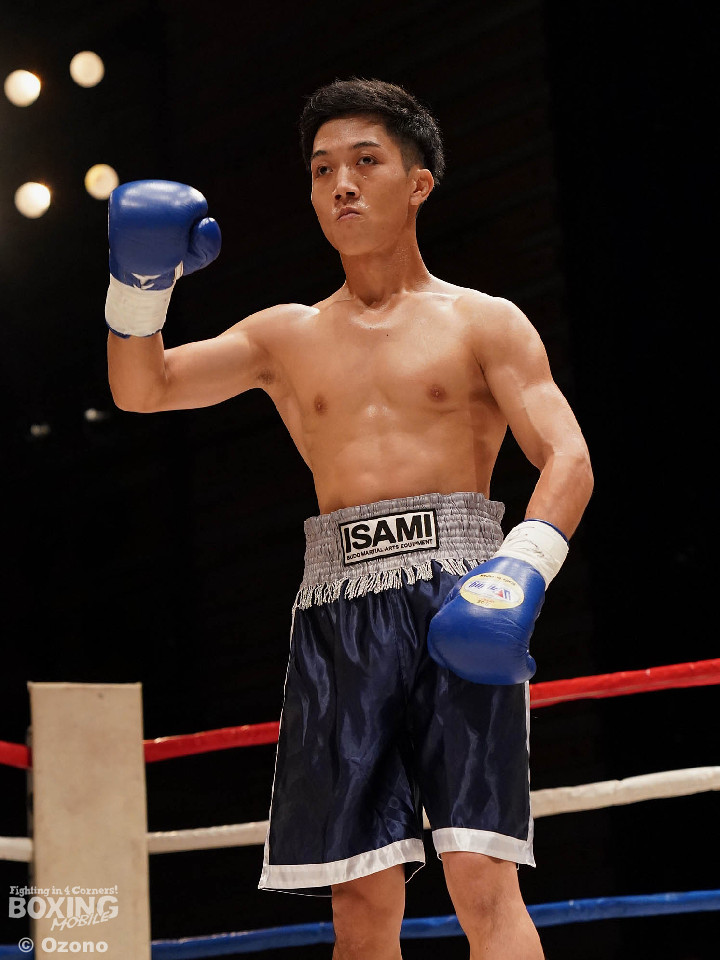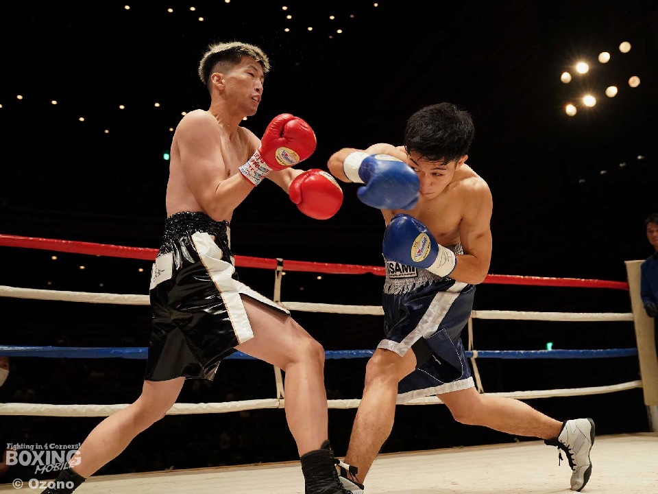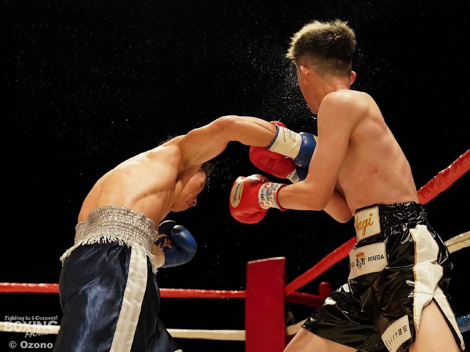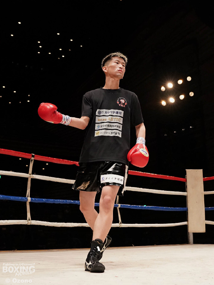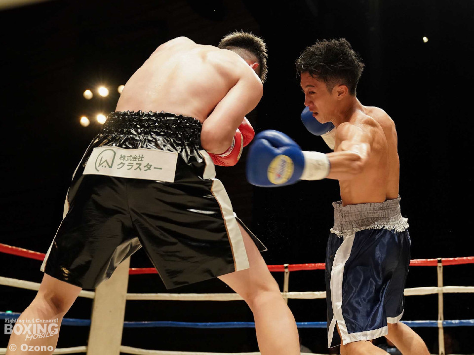 試合:サウスポー前田がジャブを飛ばして距離をキープ。2回、右ストレートにつなげたい宮下だが、距離が遠いのかあと一歩が踏み込めず。3回、前田はステップを刻みながら左ショートでダウンをゲット。再開後、仕留めに行くが宮下は左フックで膝を揺らすとグイグイと攻めてて反撃。4回、宮下は右フックでグラつかせるとコーナーに詰めてこれでもかと左ボディを叩くと防戦一方になった前田を見てレフェリーが割って入った。宮下が逆転KO勝ちを飾った。