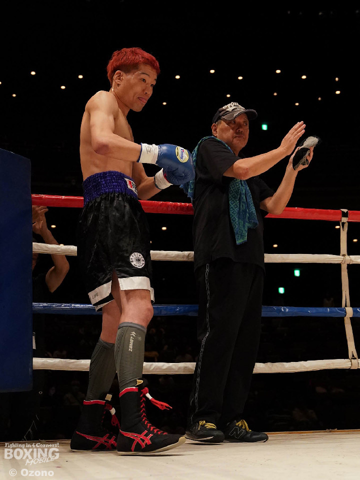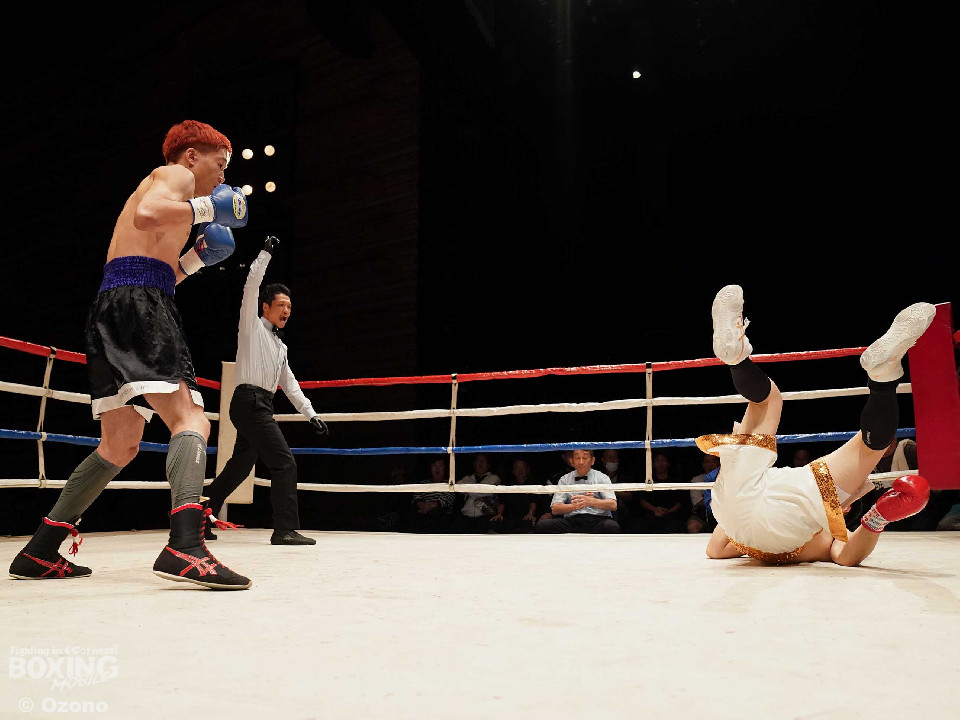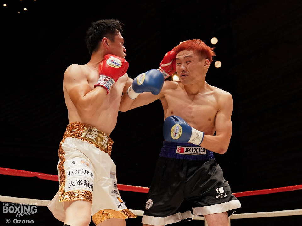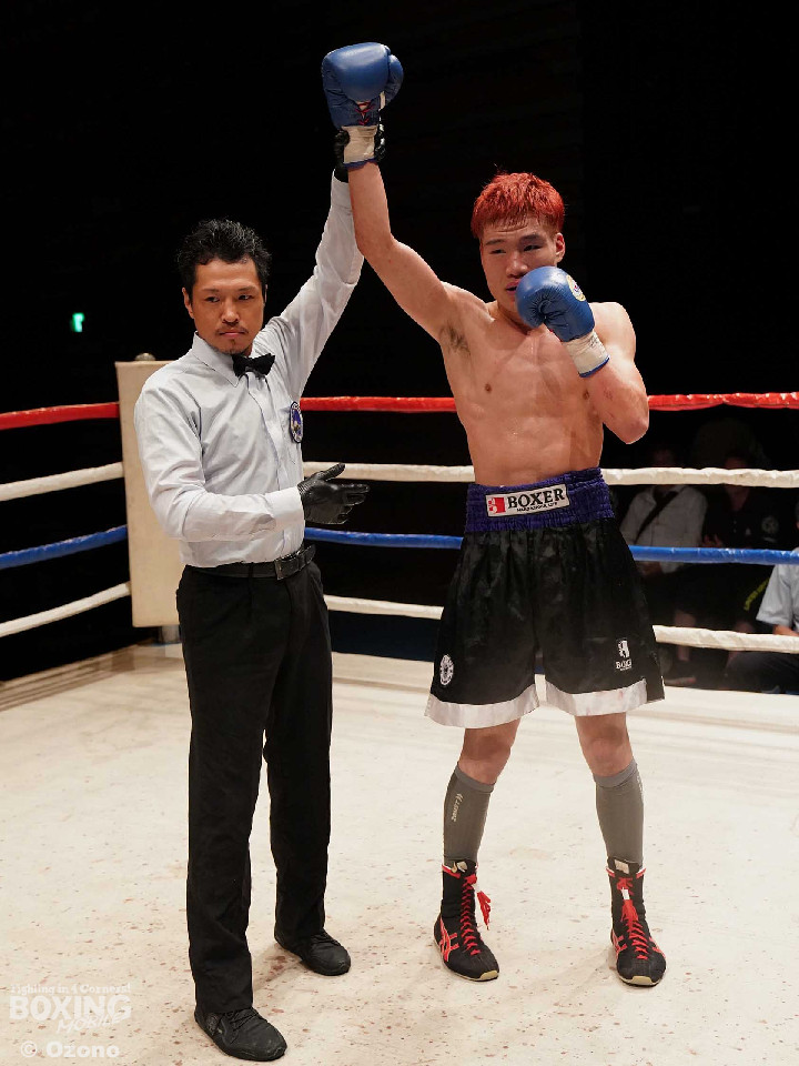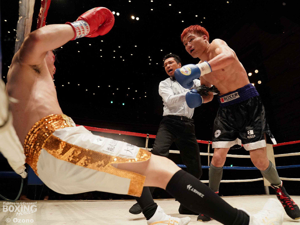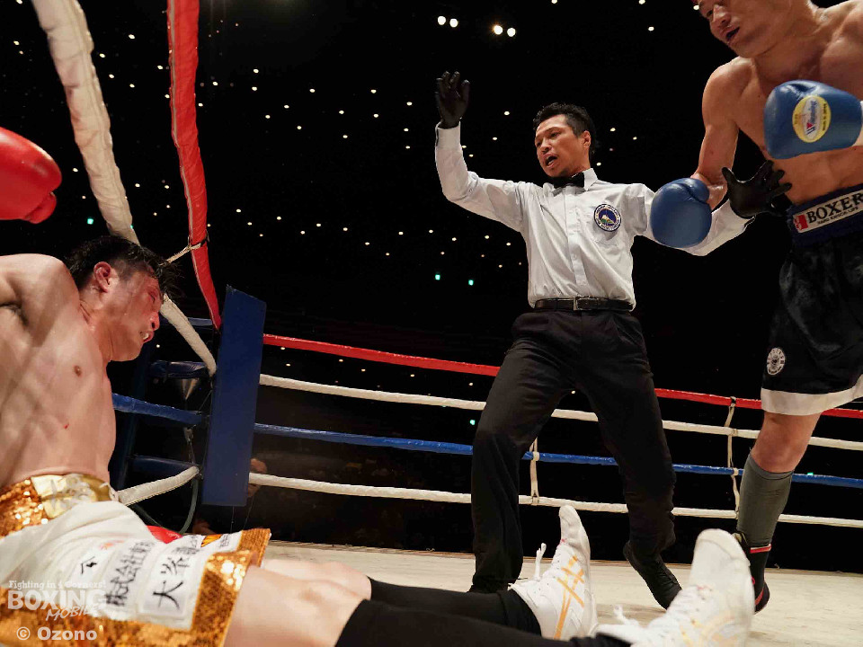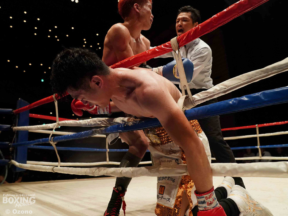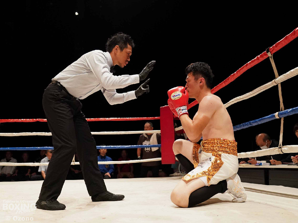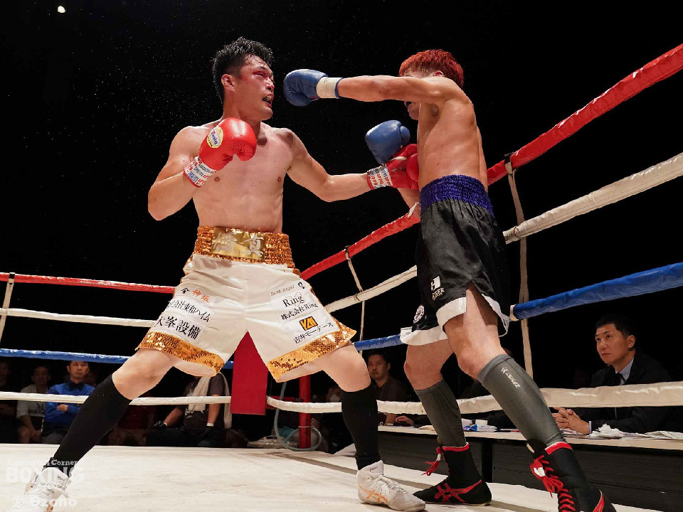 試合:サウスポー豊中が独特のリズムのワンツーを繰り出すと大峯も真っ向から応戦。ラウンド中盤、豊中が右フックでダウンを奪取。再開後、手数を増やして攻め立てた。2回、豊中は右構えにスイッチすると左右をまとめて積極的な攻撃。大峯も後手に回ることなく返した。3回、回転力を活かした打ち合いで互角の展開。4回、大峯はプレスをかけてワンツーで反撃。やや疲れは見える豊中だが、左ストレートで右目上を切り裂きペースを渡さず。5回、豊中はワンツーで効かせて連打で2度目のダウンを奪うと最後は左ストレートで倒して決着をつけた。ダメージが深い大峯は担架で運ばれた。豊中がメインイベントを締めた。