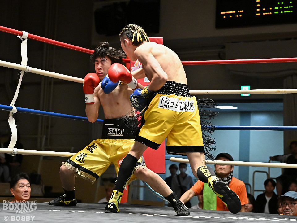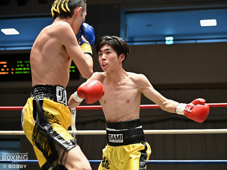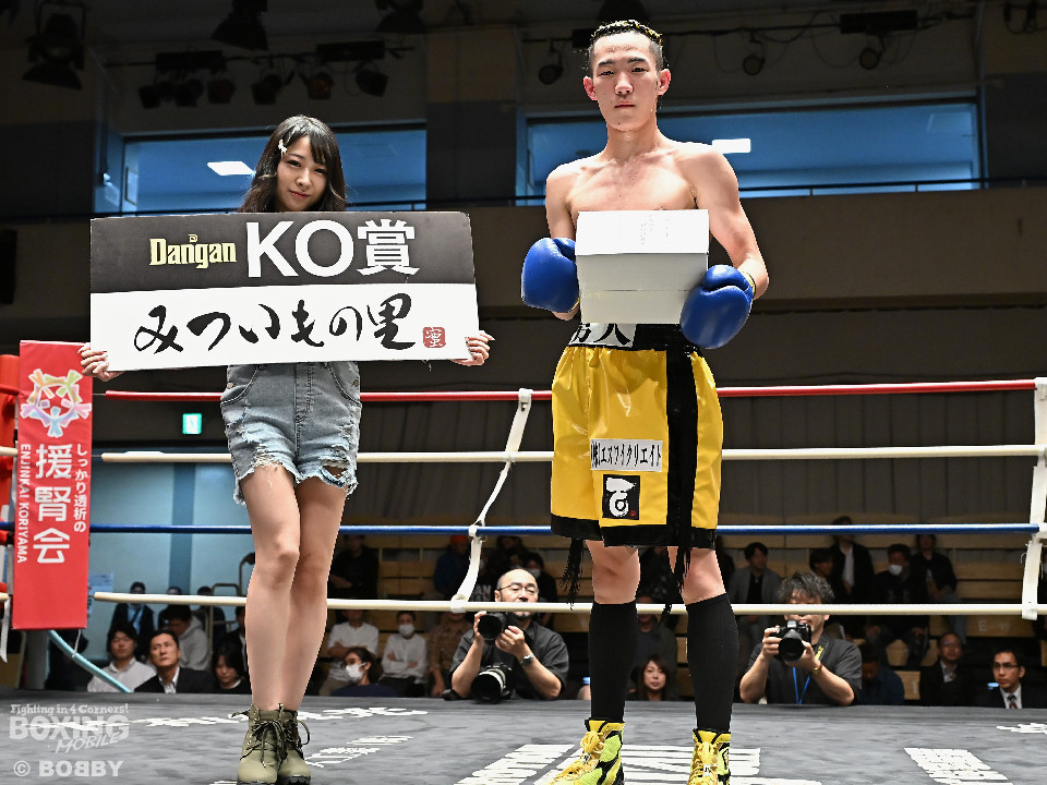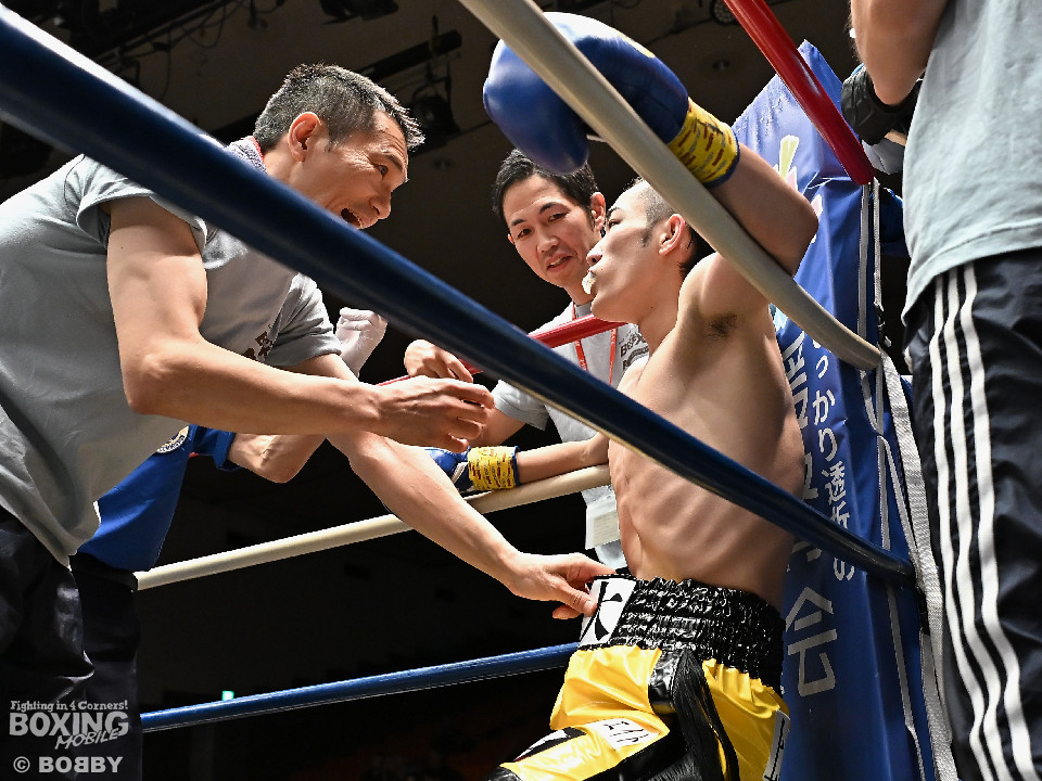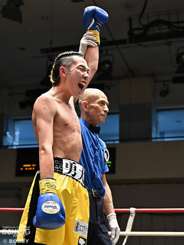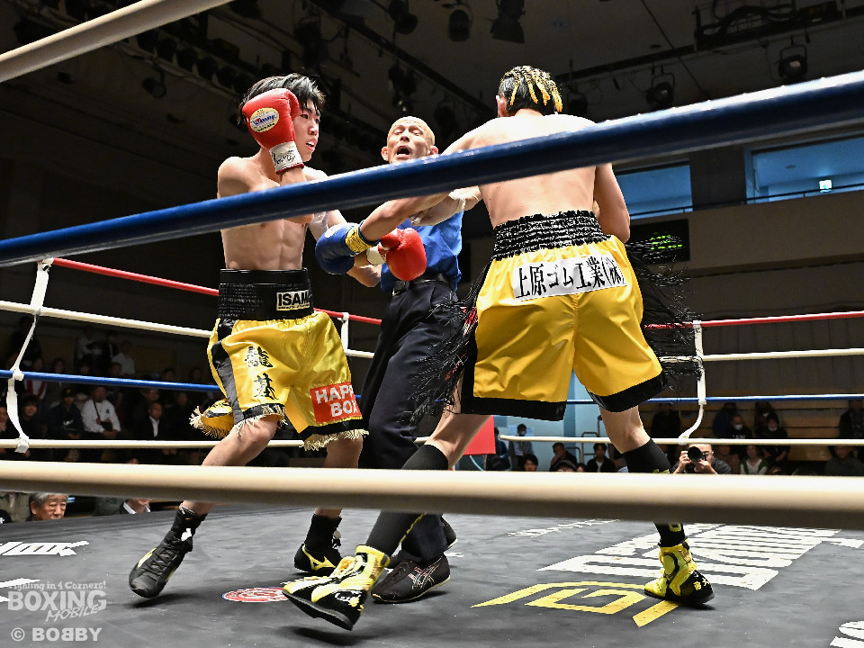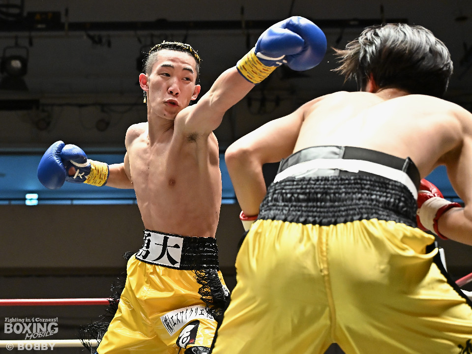 試合:上原がステップを刻みながらジャブを飛ばすと返しのパンチをバックステップで回避。ステップインから左フックをねじ込むとバランスを崩した須原を見てレフェリーはダウンを宣告した。2回、上原は前後の動きを意識しながら左フックを振り抜くとロープにもたれかかった須原を見てレフェリーはダウンを宣告。再開後、変則的な左右フックを冷静に対応した上原は左フックで倒してフィニッシュにつなげた。ダメージが深い須原は担架で運ばれた。18歳上原がデビュー戦をKO勝ちした。