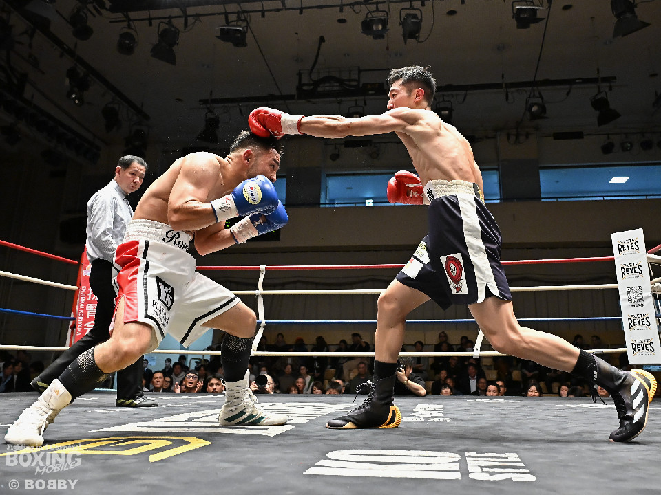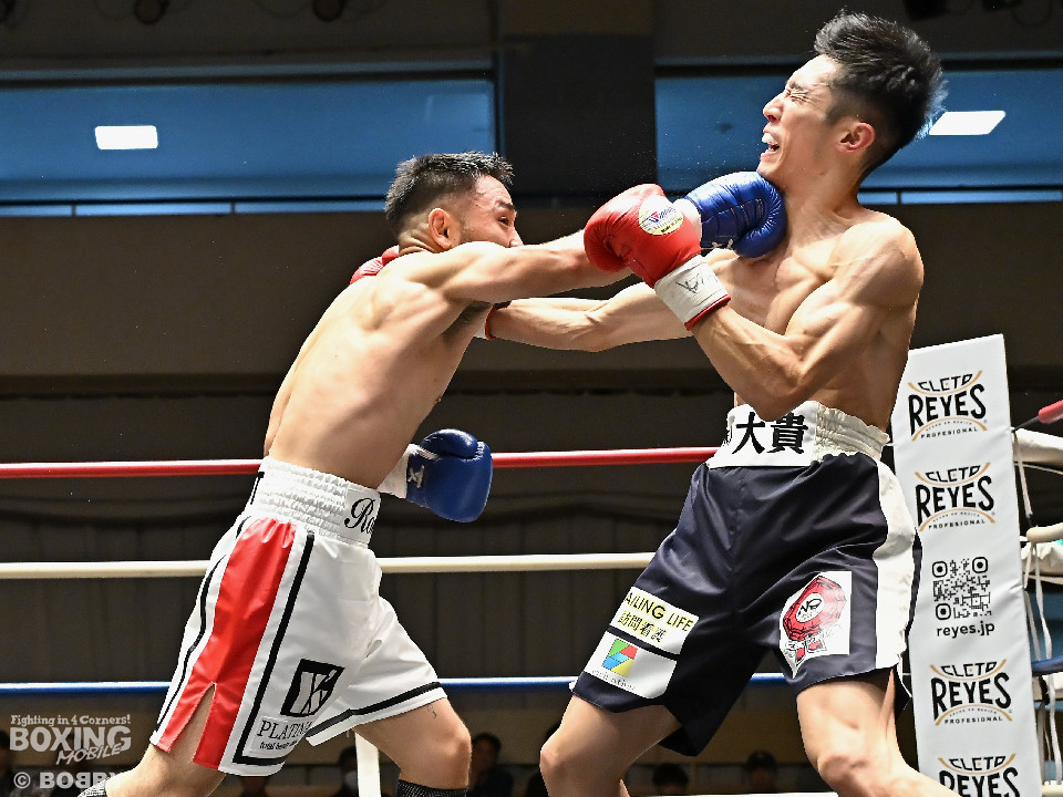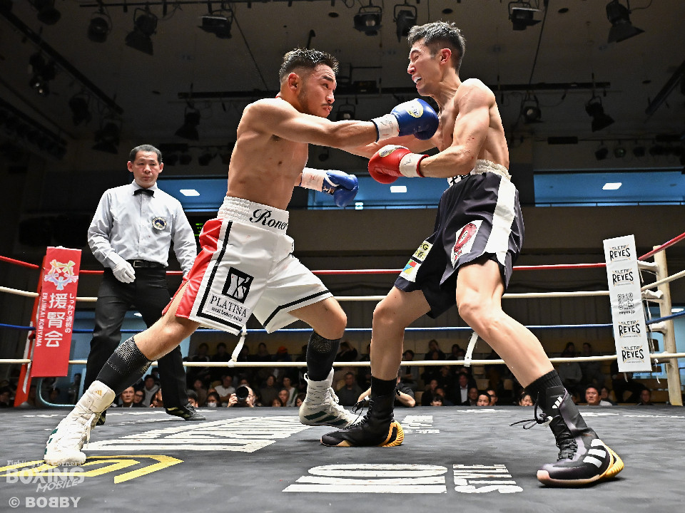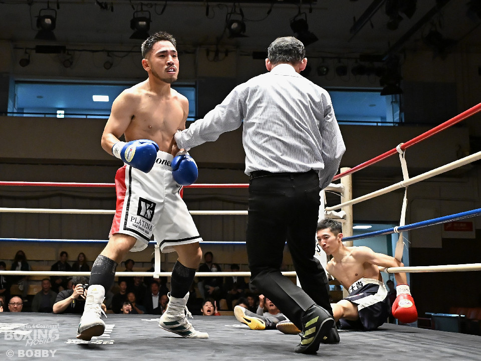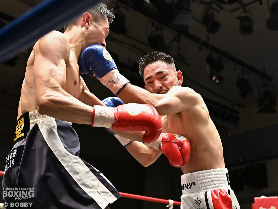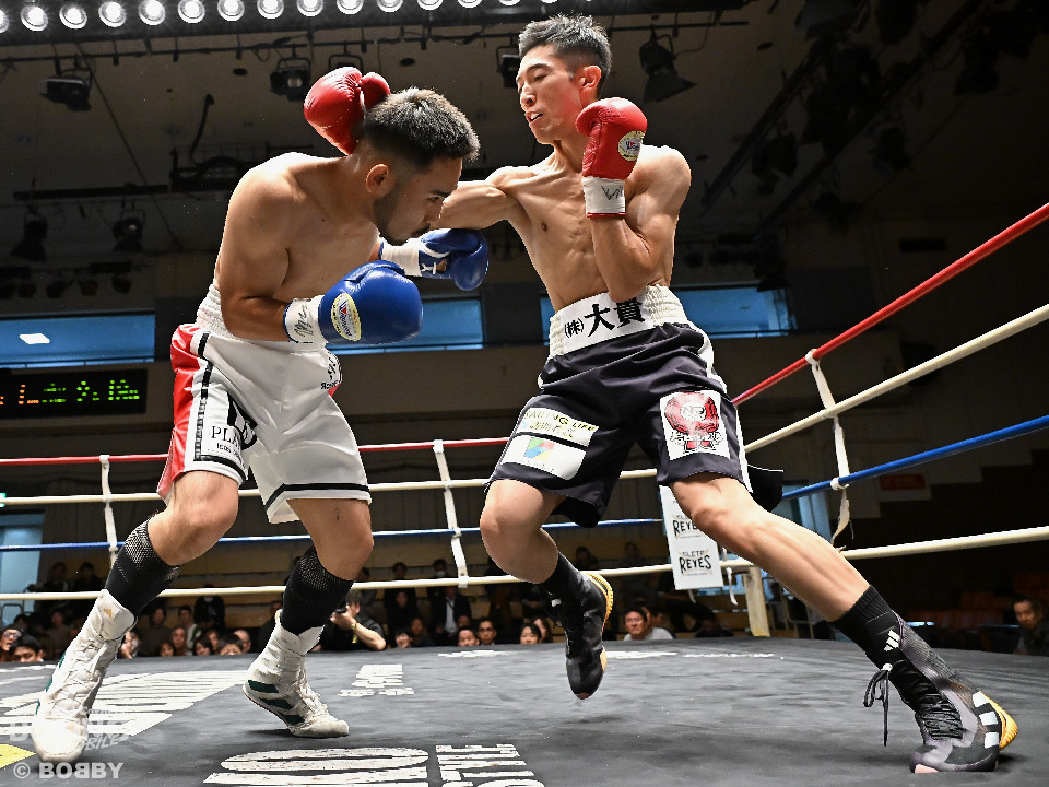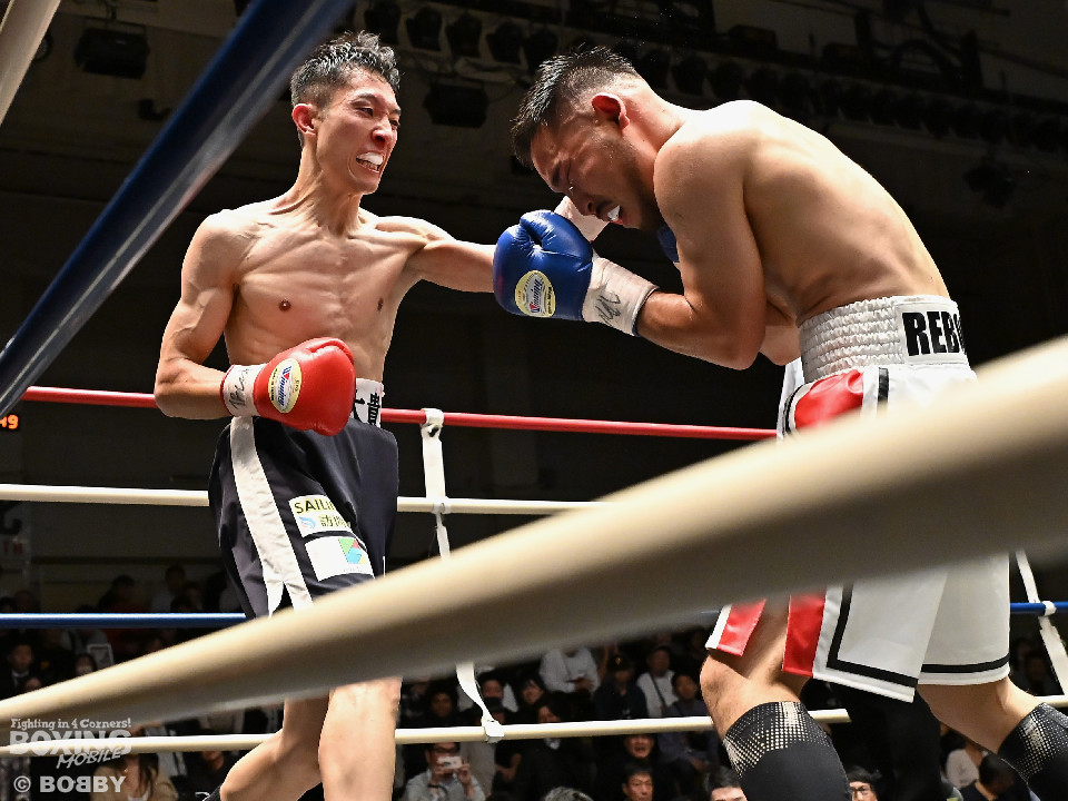 試合:サウスポー菅原がジャブからワンツー、左アッパーで迎え撃つとサイドに回り込んで的を絞らせず。2回、鶴田はプレスをかけて右ボディを突き刺し反撃。打ち合いを避けたい菅原は、左ストレートを再三ヒットするとワンツーで尻もちをつかせた。再開後、仕留めに行くが鶴田は必死の抵抗。3回、鶴田は距離を詰めて右フックで起死回生のダウンをゲット!今度は鶴田がグイグイと攻め立てた。4回、菅原はワンツーを軸に攻勢。驚異の粘りを見せた鶴田を突き放した。菅原がダウン応酬の激戦を制した。