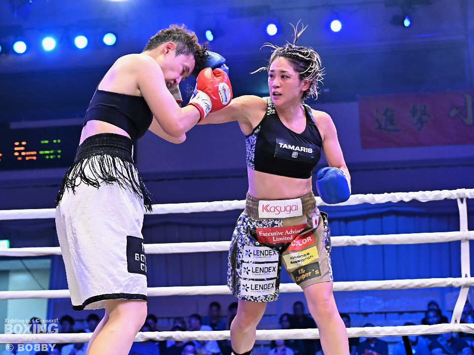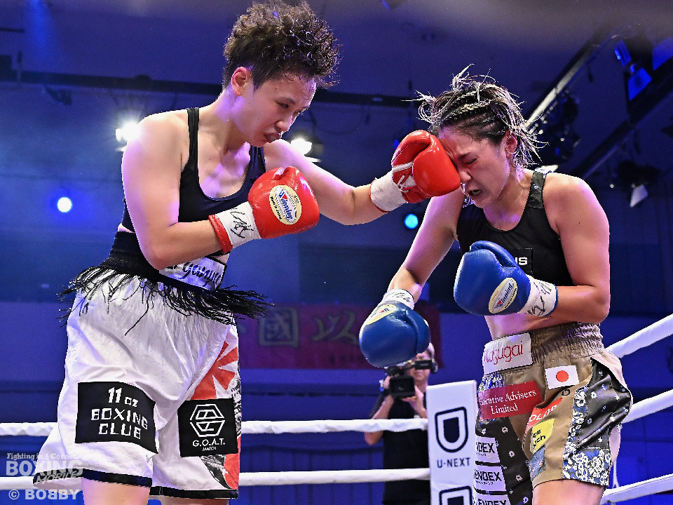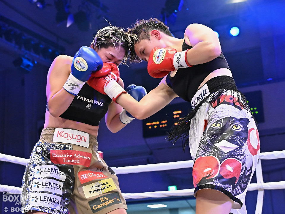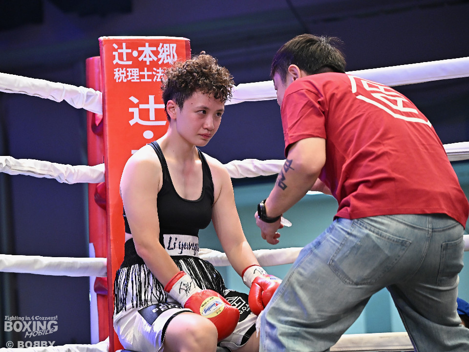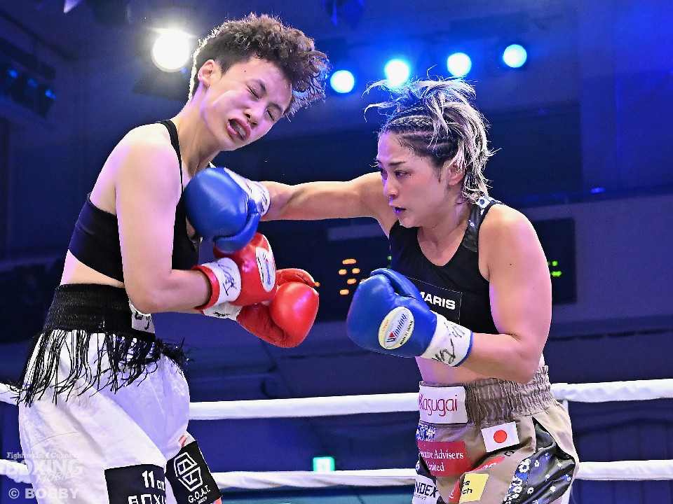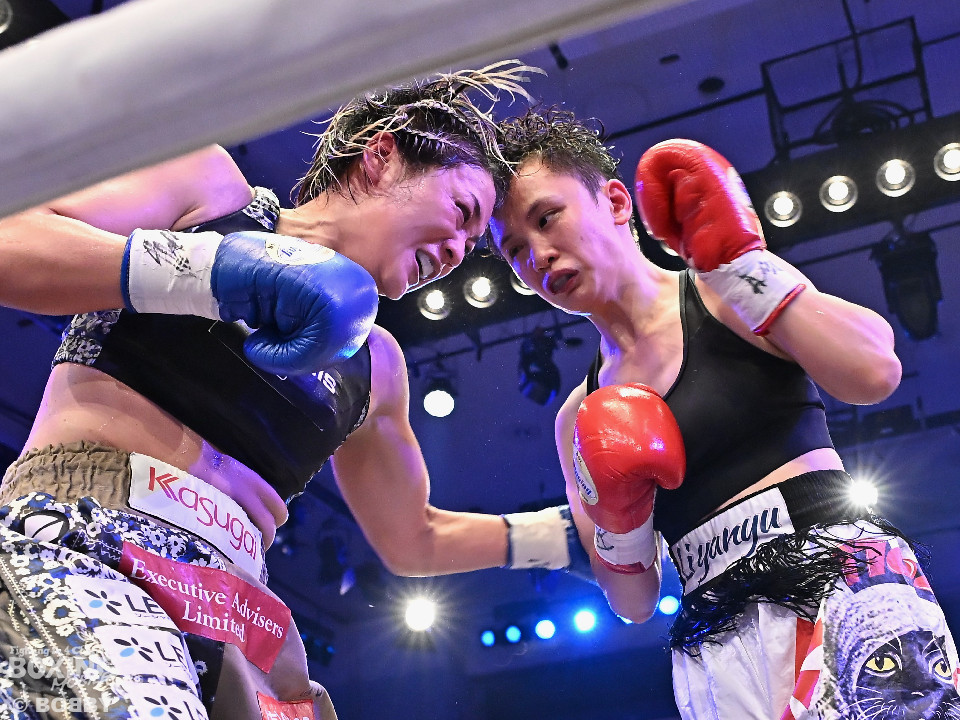 試合:前WBOアジアパシフィック女子フェザー級王者の藤原が左フックで迎え撃つが、李は強気に前に出て左右フックでアグレッシブな姿勢。2回、藤原は打ち下ろしの右ストレート、左ボディを好打。しつこい李を止めにかかった。3回、我慢比べの打ち合いが続く中、有効打で上回ったのは藤原。続く回も藤原のラウンド。ポジションを上手く入れ替えながら左ボディを突き刺した。6回、これでもかと左ボディ、ワンツーを打ち込む藤原だが、李は驚異的な粘りで手数を落とさず。7回、打ち合いは激して互角の展開。8回、藤原はもう一度ギアを上げると右ストレート、左ボディを叩きつけて突き放した。藤原が再起2戦目を飾った。