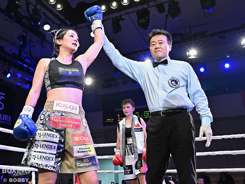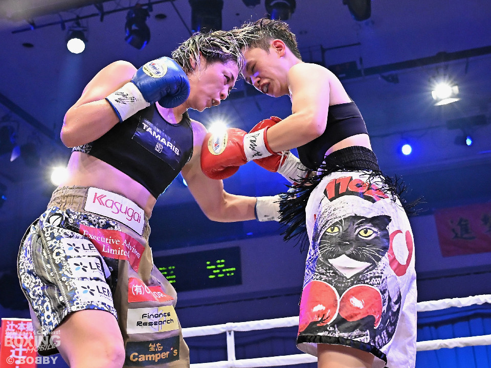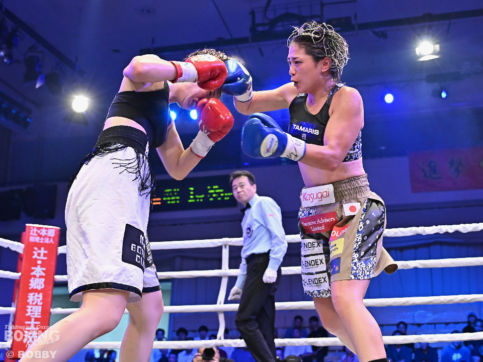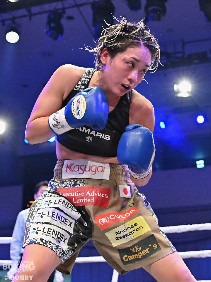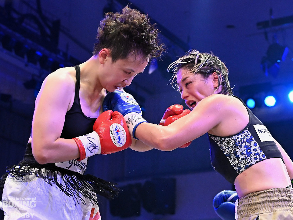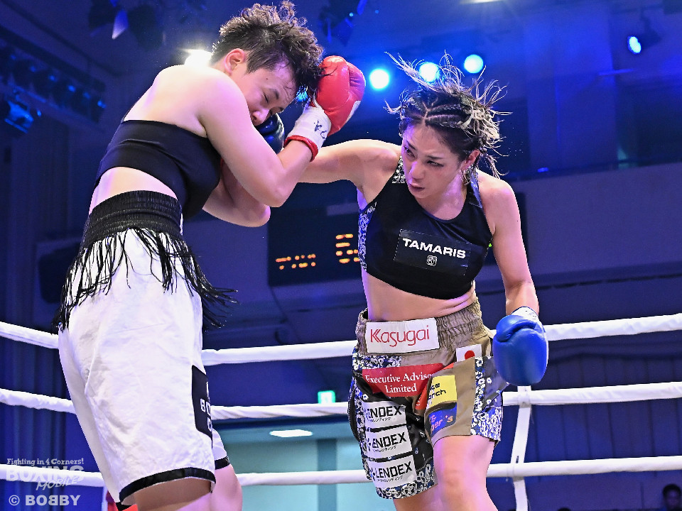 試合:前WBOアジアパシフィック女子フェザー級王者の藤原が左フックで迎え撃つが、李は強気に前に出て左右フックでアグレッシブな姿勢。2回、藤原は打ち下ろしの右ストレート、左ボディを好打。しつこい李を止めにかかった。3回、我慢比べの打ち合いが続く中、有効打で上回ったのは藤原。続く回も藤原のラウンド。ポジションを上手く入れ替えながら左ボディを突き刺した。6回、これでもかと左ボディ、ワンツーを打ち込む藤原だが、李は驚異的な粘りで手数を落とさず。7回、打ち合いは激して互角の展開。8回、藤原はもう一度ギアを上げると右ストレート、左ボディを叩きつけて突き放した。藤原が再起2戦目を飾った。