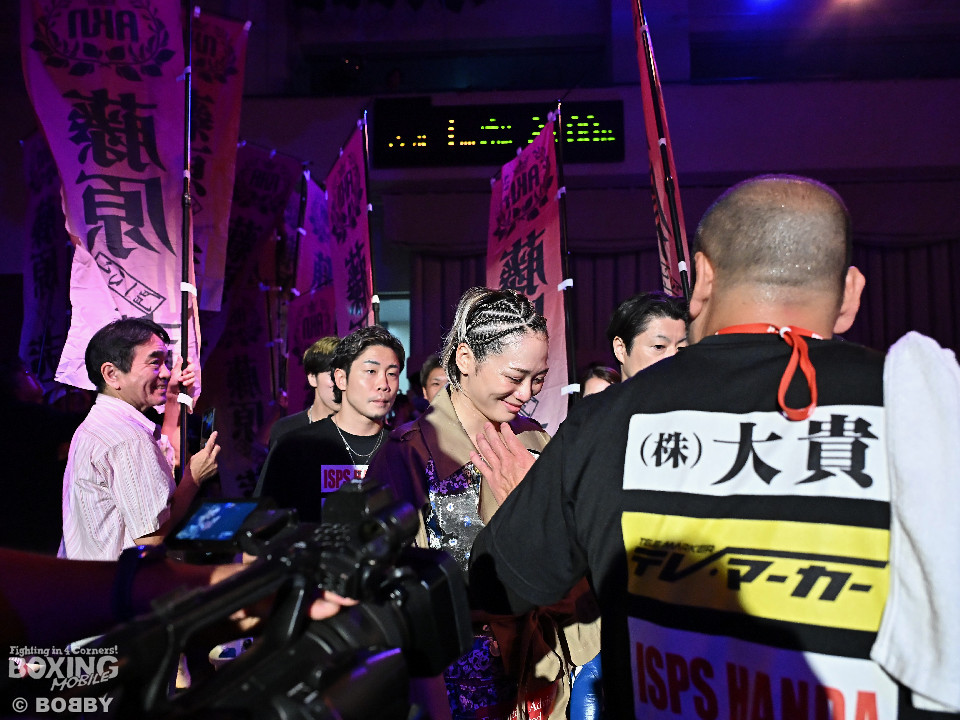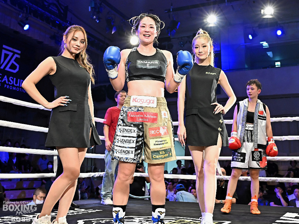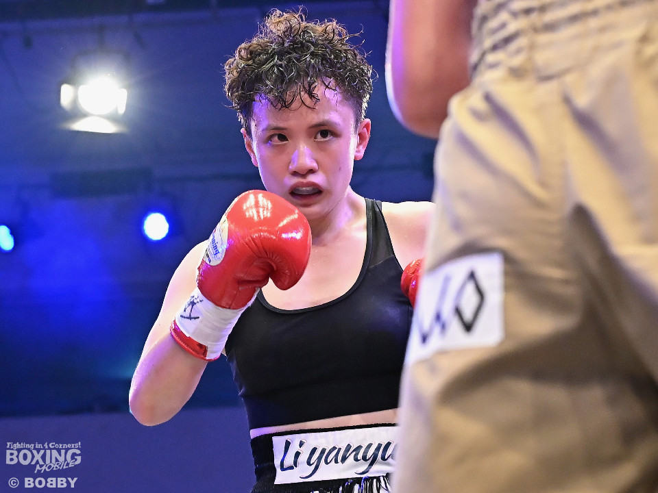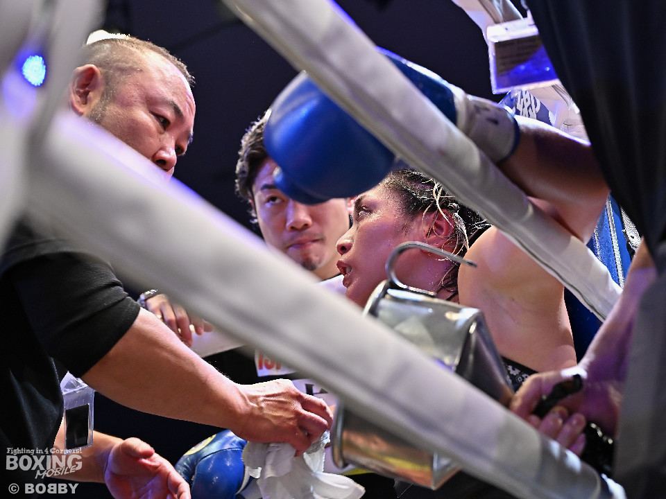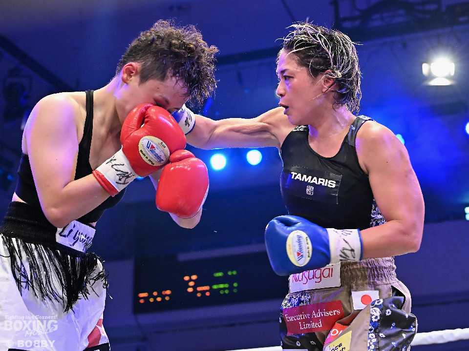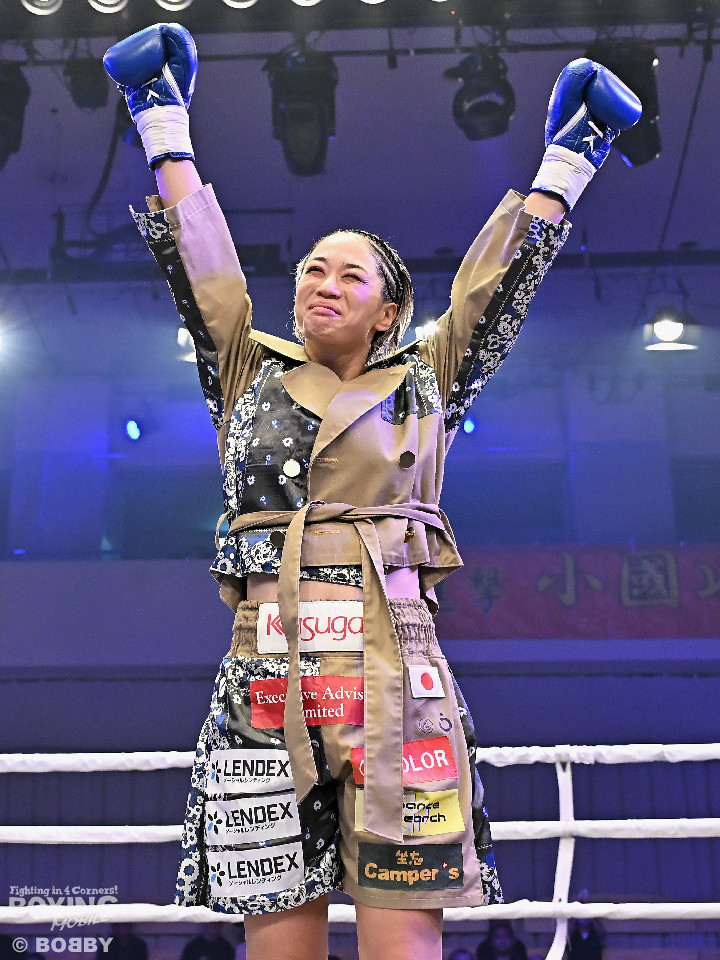 試合:前WBOアジアパシフィック女子フェザー級王者の藤原が左フックで迎え撃つが、李は強気に前に出て左右フックでアグレッシブな姿勢。2回、藤原は打ち下ろしの右ストレート、左ボディを好打。しつこい李を止めにかかった。3回、我慢比べの打ち合いが続く中、有効打で上回ったのは藤原。続く回も藤原のラウンド。ポジションを上手く入れ替えながら左ボディを突き刺した。6回、これでもかと左ボディ、ワンツーを打ち込む藤原だが、李は驚異的な粘りで手数を落とさず。7回、打ち合いは激して互角の展開。8回、藤原はもう一度ギアを上げると右ストレート、左ボディを叩きつけて突き放した。藤原が再起2戦目を飾った。