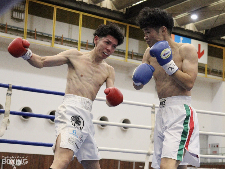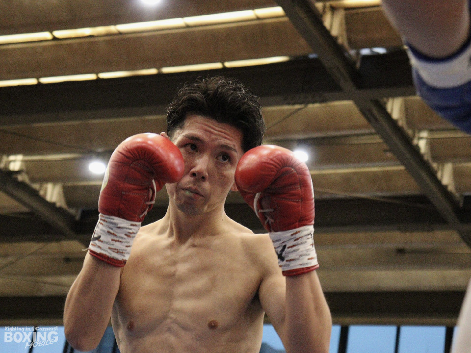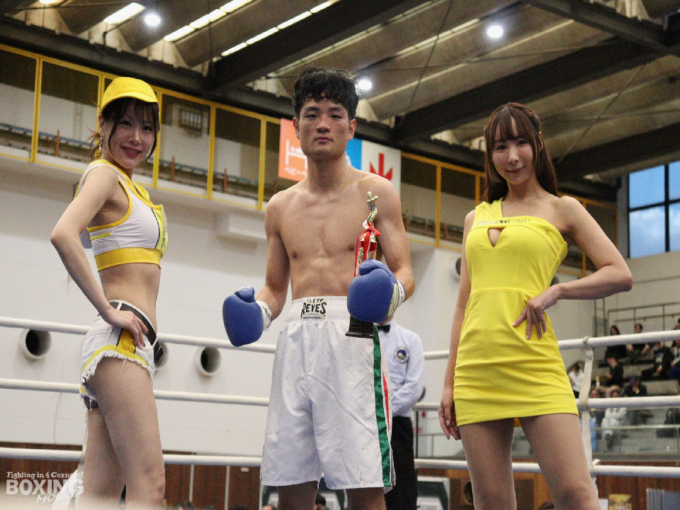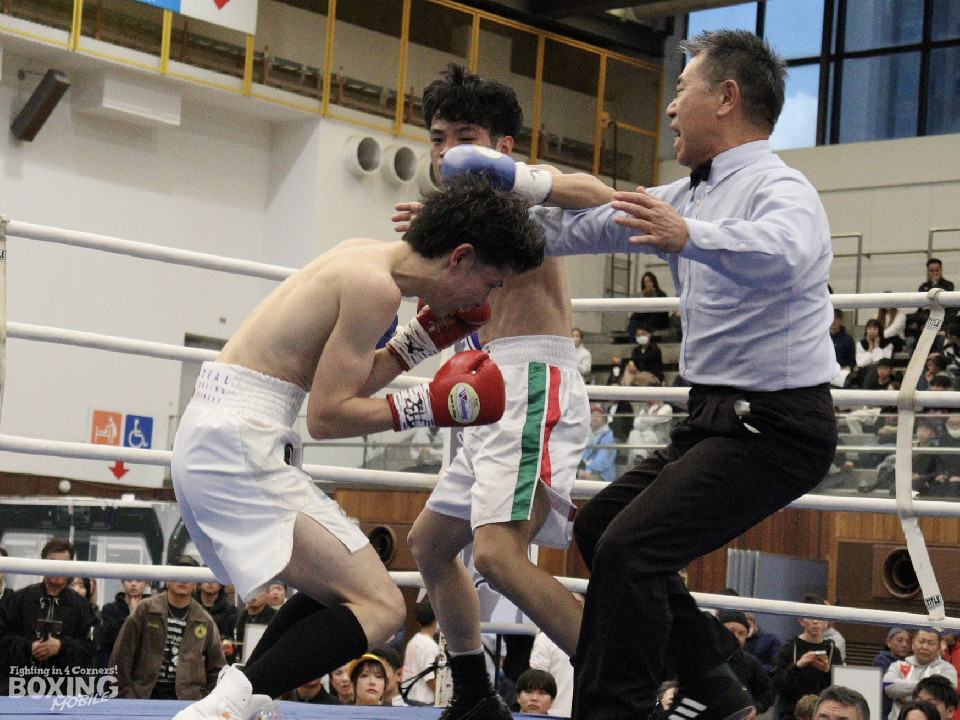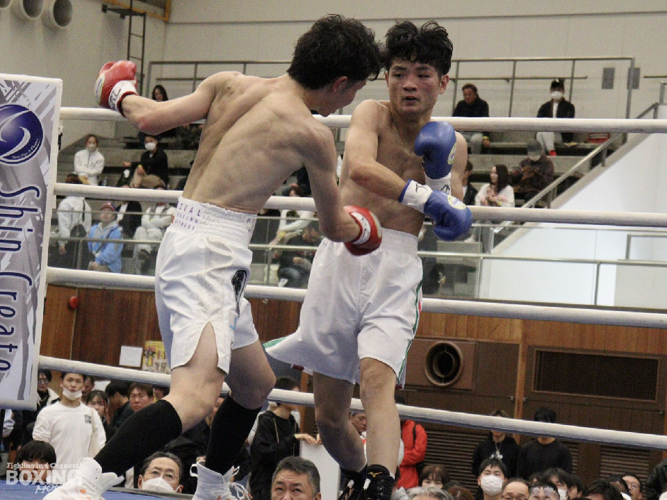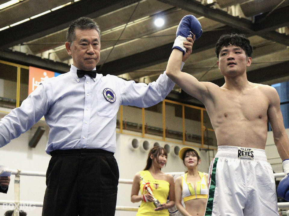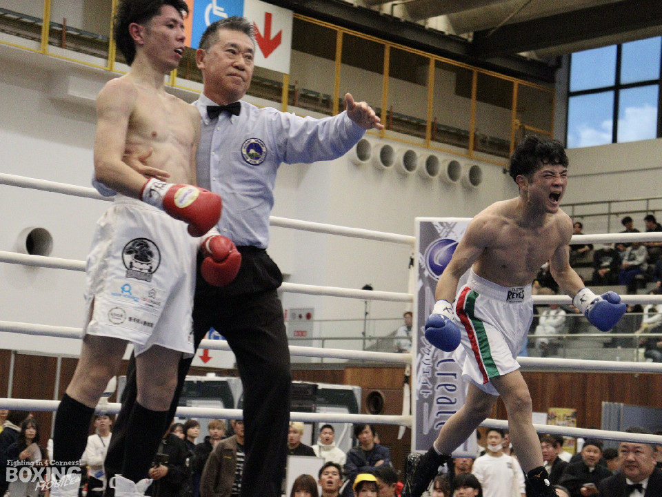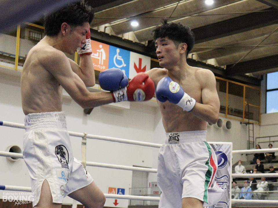 試合:田平が距離を潰して右ボディストレートから切り込むが、菊地はリターンの右ショートで対抗。ラウンド中盤、ワンツーで腰を沈めさせるとパンチをまとめてペースを握った。2回、ボディの打ち合いで体力を削り合う中、菊地の回転力が上回ると右フックでグラつかせてレフェリーストップに持ち込んだ。