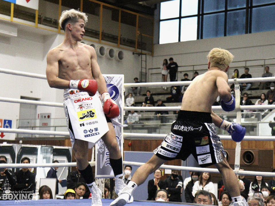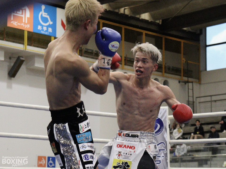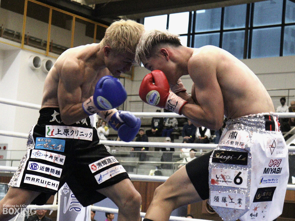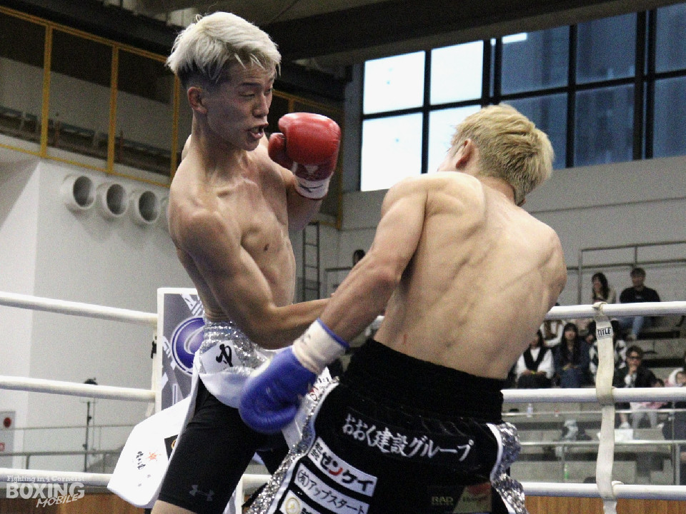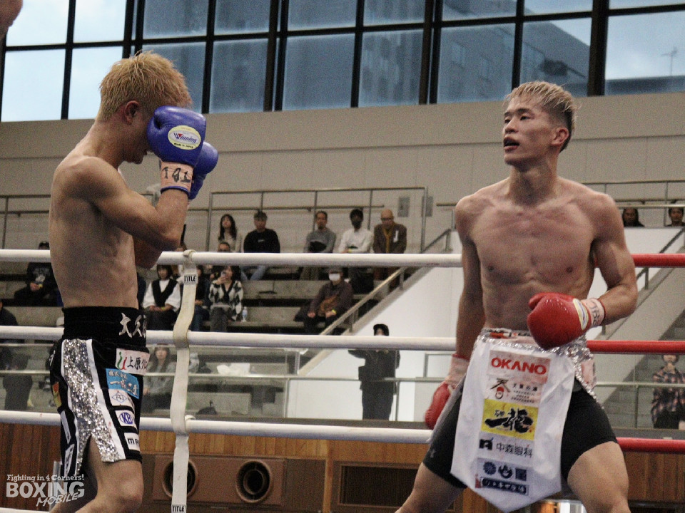 試合:日本フェザー級最強挑戦者決定戦、地元の岡本と東京からの乗り込んできた大久が来年のチャンピオンカーニバル出場を懸けて拳を交えた。初回、岡本がシャープなジャブを飛ばしながら距離を探ると、大久はリターンの左フックをヒット。それならばと岡本は打ち下ろしの右ストレート決めて譲らず。2回、岡本は右アッパーで迎え撃ち鼻血を流させるとジャブを軸にリズム感を構築。3回、大久は左フックを繰り出すが空を切る。それでもプレスをかけて単発の左フックをヒット。スリリングな攻防が続いた。4回、岡本はボディワークでかわすとジャブを軸にコントロール。5回、岡本は左ボディを好打すると上下のコンビネーションで攻勢。大久も打ち返したが被弾。6回、岡本は打ち合いに応じず、ステップインから左ボディ、ワンツーを好打し見栄えの良さをアピール。7回、流れを決めたい大久だが、岡本は上手く休みながら折を見てワンツー左ボディをヒット。8回、強引に打って出た大久だが、岡本はメリハリのある動きで決定打を許さなかった。2~8ポイント差をつけた岡本が挑戦権を獲得した。