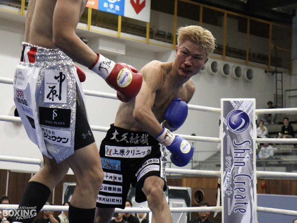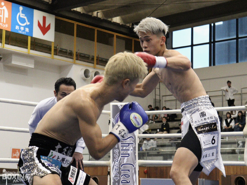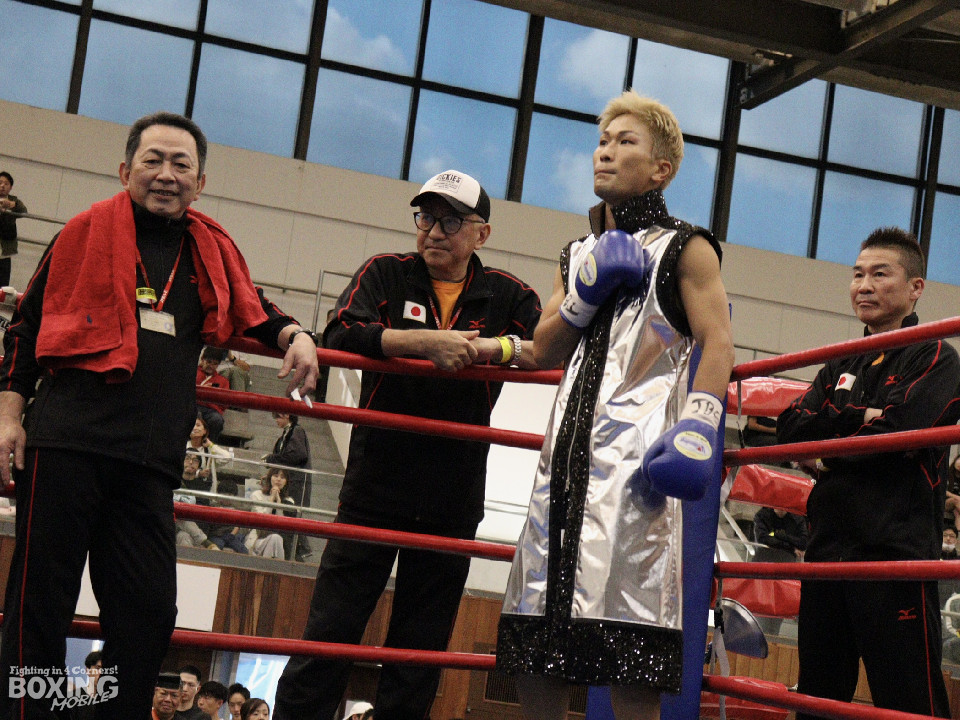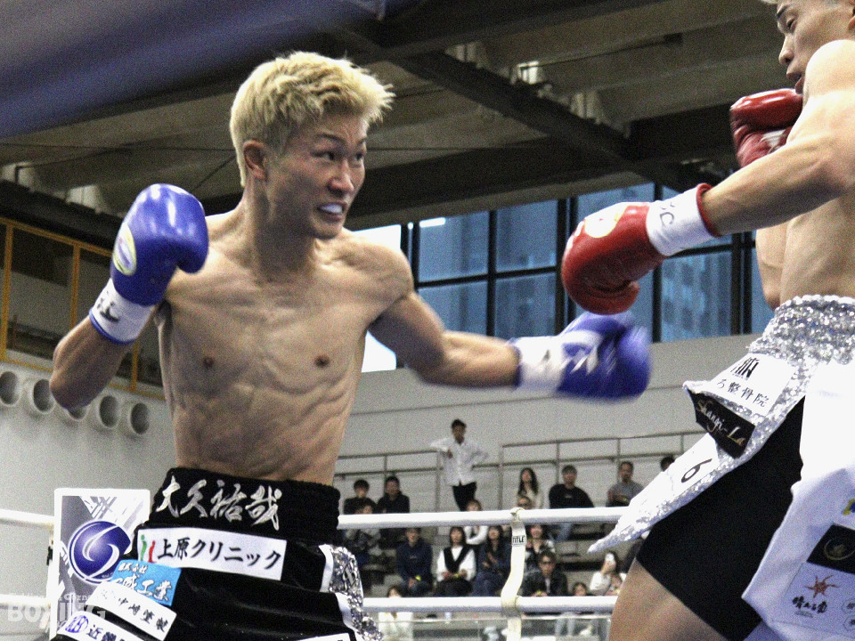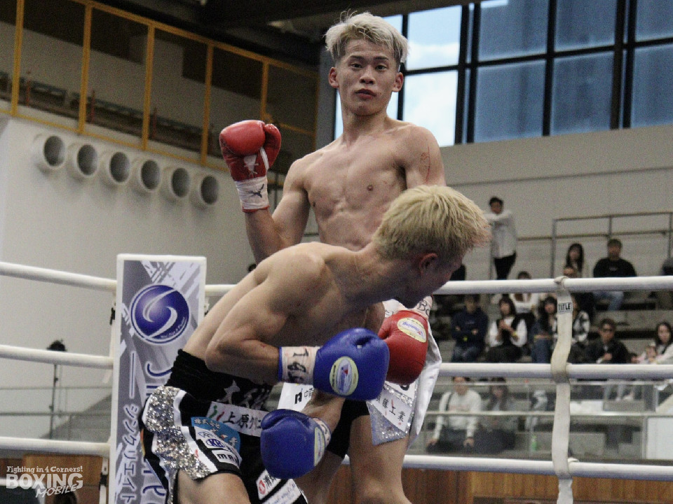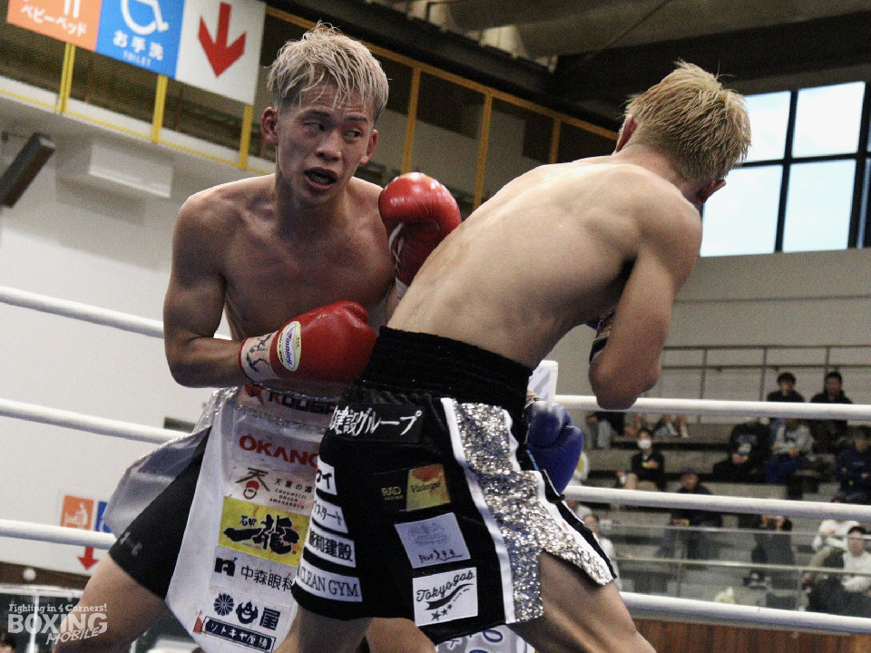 試合:日本フェザー級最強挑戦者決定戦、地元の岡本と東京からの乗り込んできた大久が来年のチャンピオンカーニバル出場を懸けて拳を交えた。初回、岡本がシャープなジャブを飛ばしながら距離を探ると、大久はリターンの左フックをヒット。それならばと岡本は打ち下ろしの右ストレート決めて譲らず。2回、岡本は右アッパーで迎え撃ち鼻血を流させるとジャブを軸にリズム感を構築。3回、大久は左フックを繰り出すが空を切る。それでもプレスをかけて単発の左フックをヒット。スリリングな攻防が続いた。4回、岡本はボディワークでかわすとジャブを軸にコントロール。5回、岡本は左ボディを好打すると上下のコンビネーションで攻勢。大久も打ち返したが被弾。6回、岡本は打ち合いに応じず、ステップインから左ボディ、ワンツーを好打し見栄えの良さをアピール。7回、流れを決めたい大久だが、岡本は上手く休みながら折を見てワンツー左ボディをヒット。8回、強引に打って出た大久だが、岡本はメリハリのある動きで決定打を許さなかった。2~8ポイント差をつけた岡本が挑戦権を獲得した。