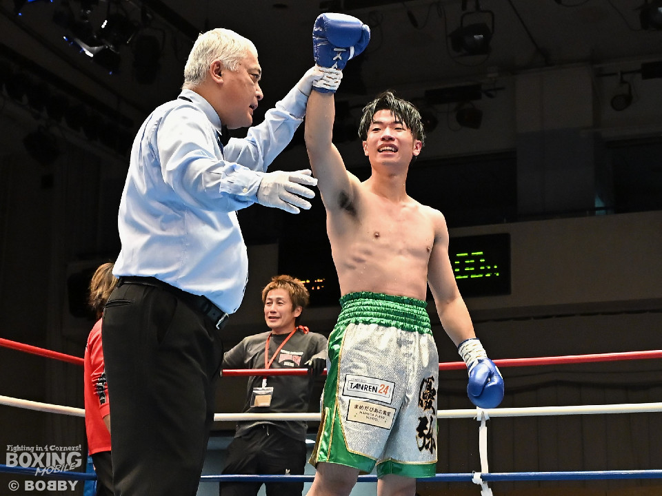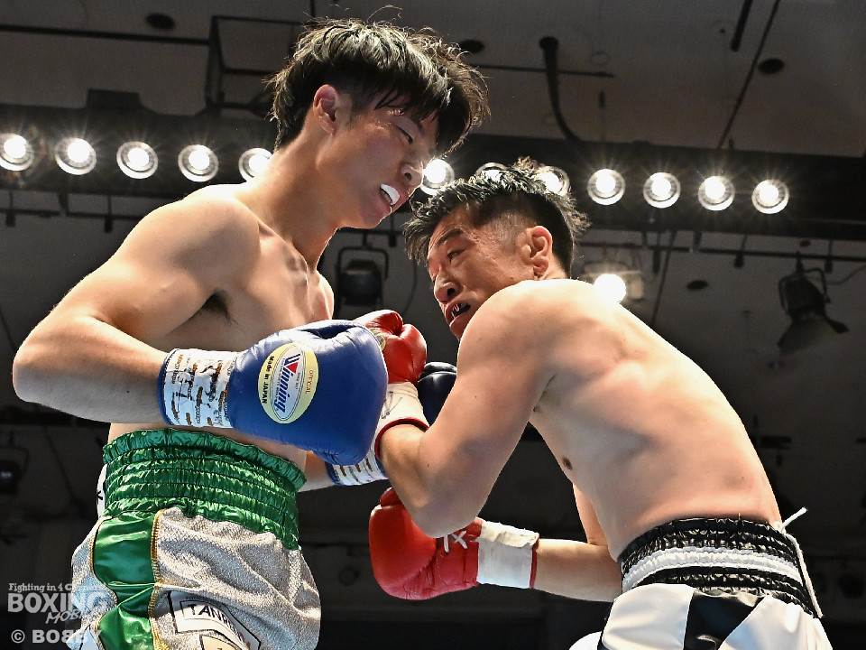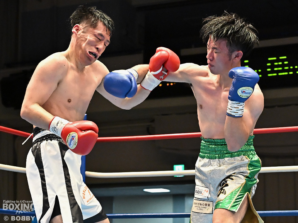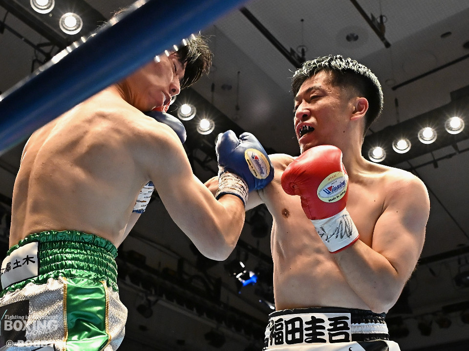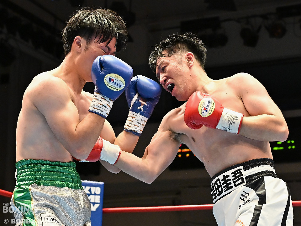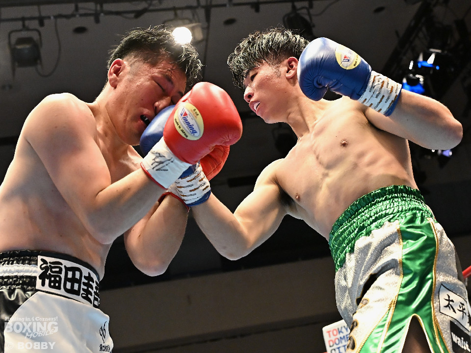 試合:開始ゴング直後から互いに連打を繰り出す打撃戦となった初回、豆田の右で福田がダウン。再開後はダメージを見せない福田も連打で反撃。豆田も負けじと連打を返した。2回、福田はパンチを上下に散らし、連打で豆田をロープに押し込むと連打をまとめた。3回、連打で前に出る福田に対し足を使ってジャブから組み立てた豆田はボディから連打につなげた。4回、連打で押す福田に対し、豆田はボディからワンツーにつなげ、ノーモーションの右をヒットした。結果は三者のの支持を集めた豆田が初勝利を飾った。