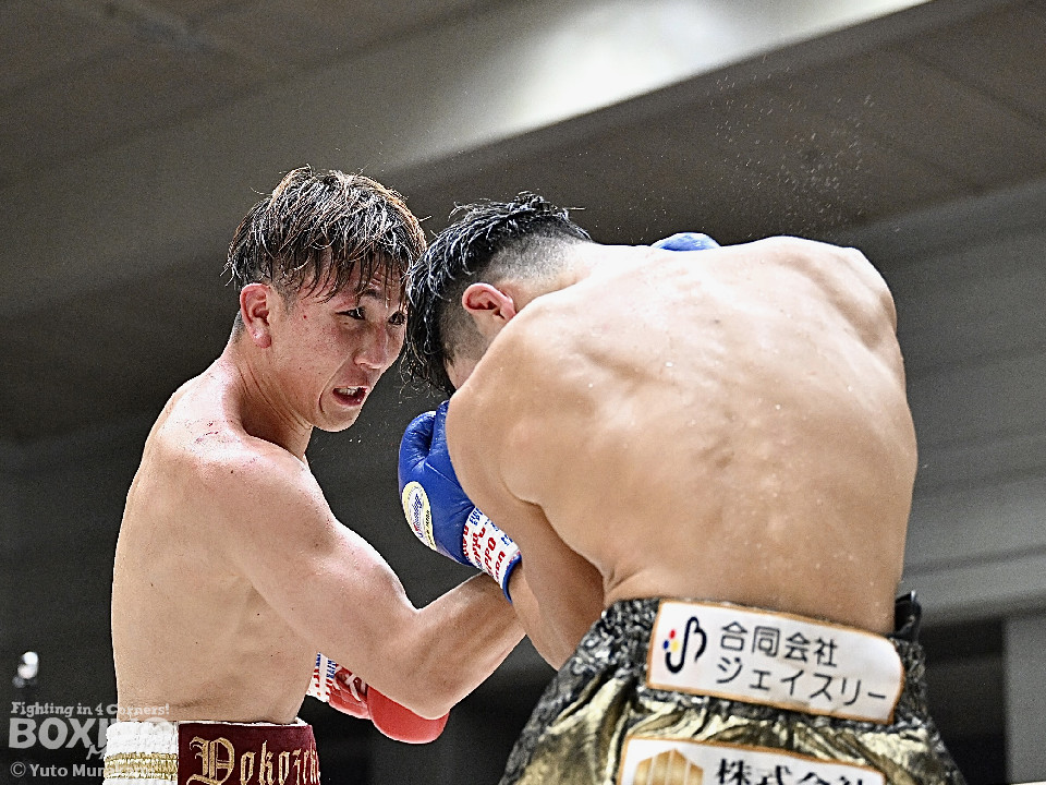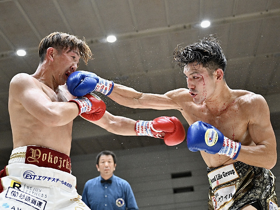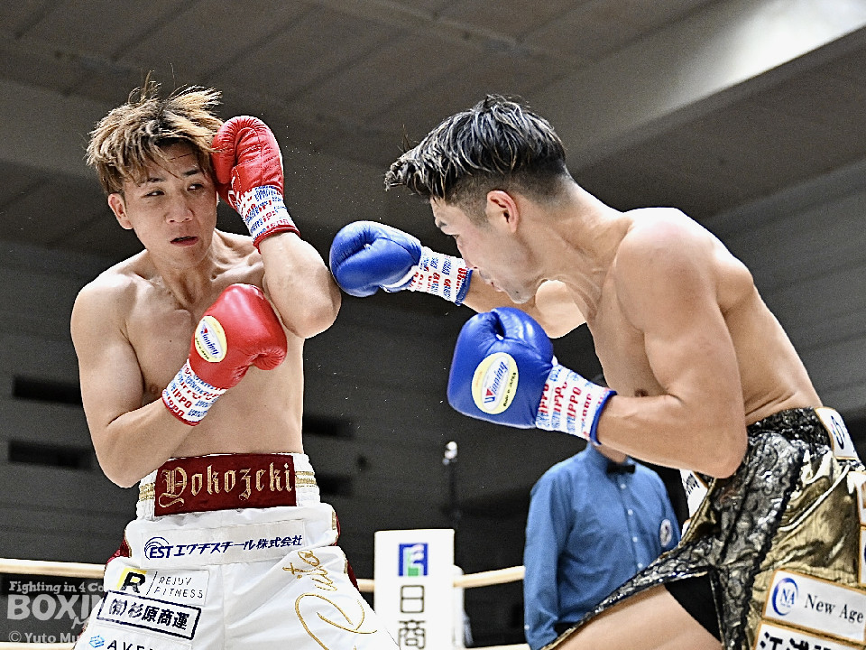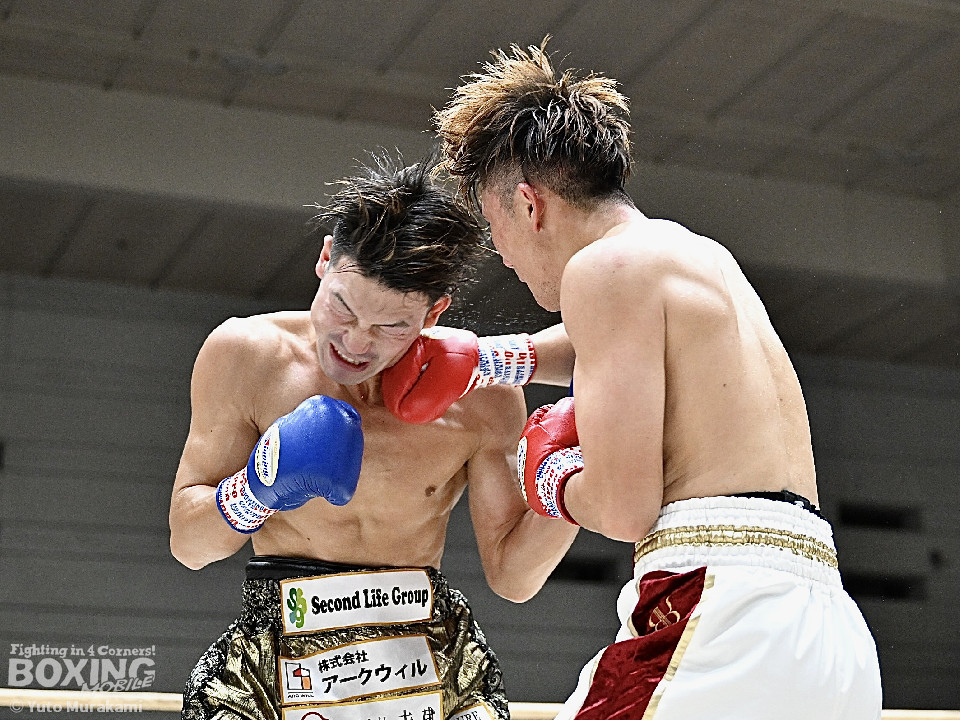 試合:浜田がジャブを飛ばしながら左ショートフックで先制攻撃。アグレッシブな姿勢を見せて上々のスタートを切った。2回、佐伯は上下に打ち分けるとプレスをかけて反撃。3回、激しいパンチの交換、浜田が左フックをねじ込めば佐伯もすぐさまワンツーを叩き込み譲らず。4回、偶然のバッティングで浜田は左目上をカット。浜田の右ストレートから返しの左フックの見栄えがいい。5回、佐伯はジリジリと距離を詰めてワンツーをヒット。パンチを交錯させる中、有効打で上回った。6回、佐伯は左フックで顔を弾き攻勢。頭がぶつかり浜田は右目上をカットした。7回も佐伯のラウンド。真正面から打ち合う中、打ち勝った。8回、浜田が距離を潰して左フックを叩きつければ、佐伯も負けじと応戦。火が出るような打ち合いで会場を盛り上げた。ジャッジ1者は佐伯につけたが残り2者は引き分けとした。