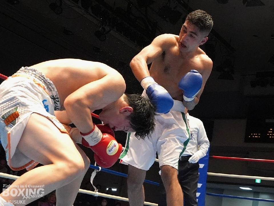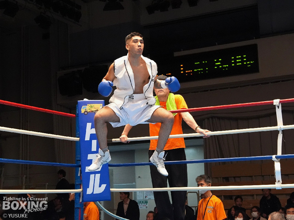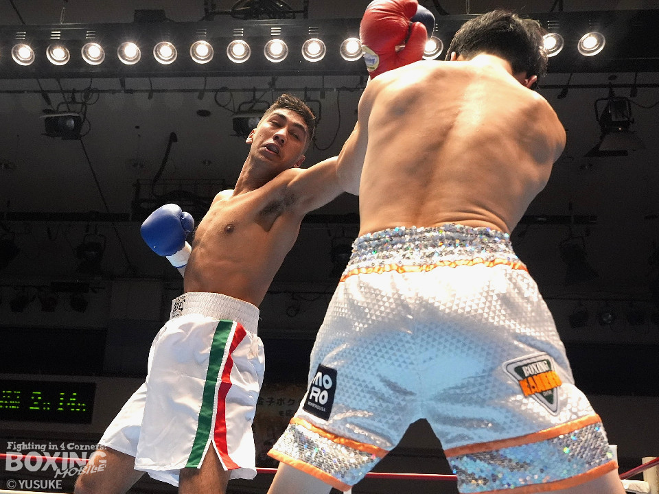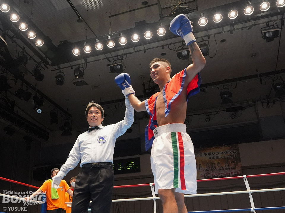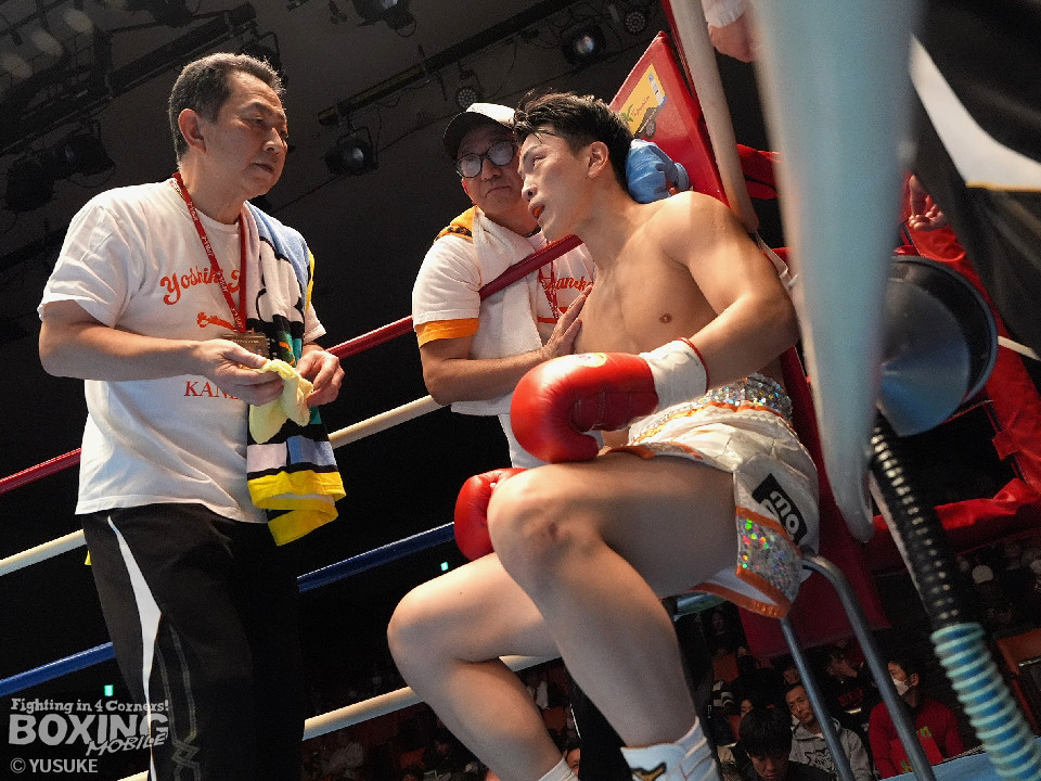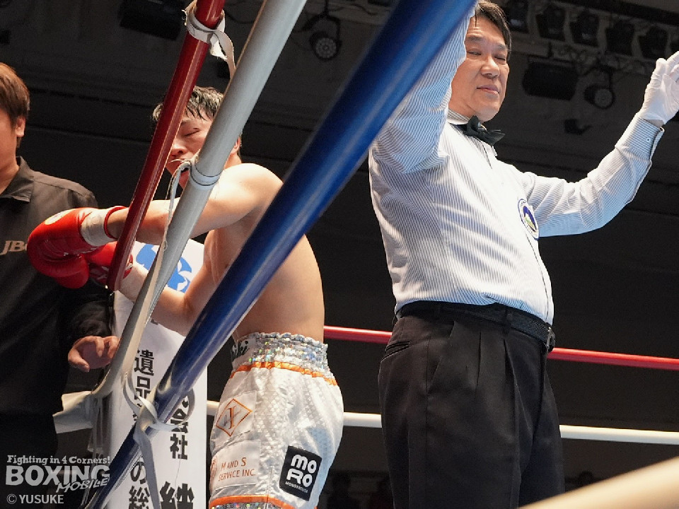 試合:多破が長いリーチを活かしたジャブから組み立てると左フックをヒット。2回、多破は打ち終わりにワンツを決めるとテンポの良い動きを披露。後手に回った金子は左ボディで食い下がった。3回、金子はプッシュしながら右ショートでガクッと腰を沈めさせて反撃。ロープを背負った多破は左ボディを突き刺した。4回、多破は右カウンターを好打すると上下に打ち分け攻勢。金子はヒッティングで左右上を腫らした。5回開始早々、レフェリーは2度目のドクターチェックを要請。これ以上の試合続行を不能としたレフェリーが試合を止めた。多破が日本ランキングの座を守った。