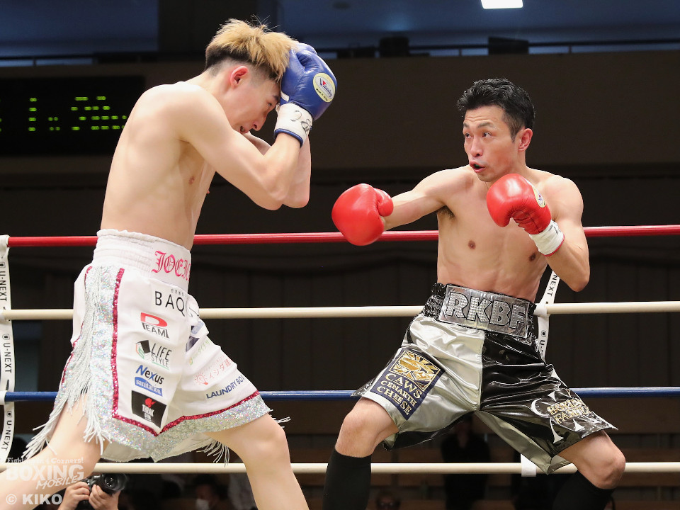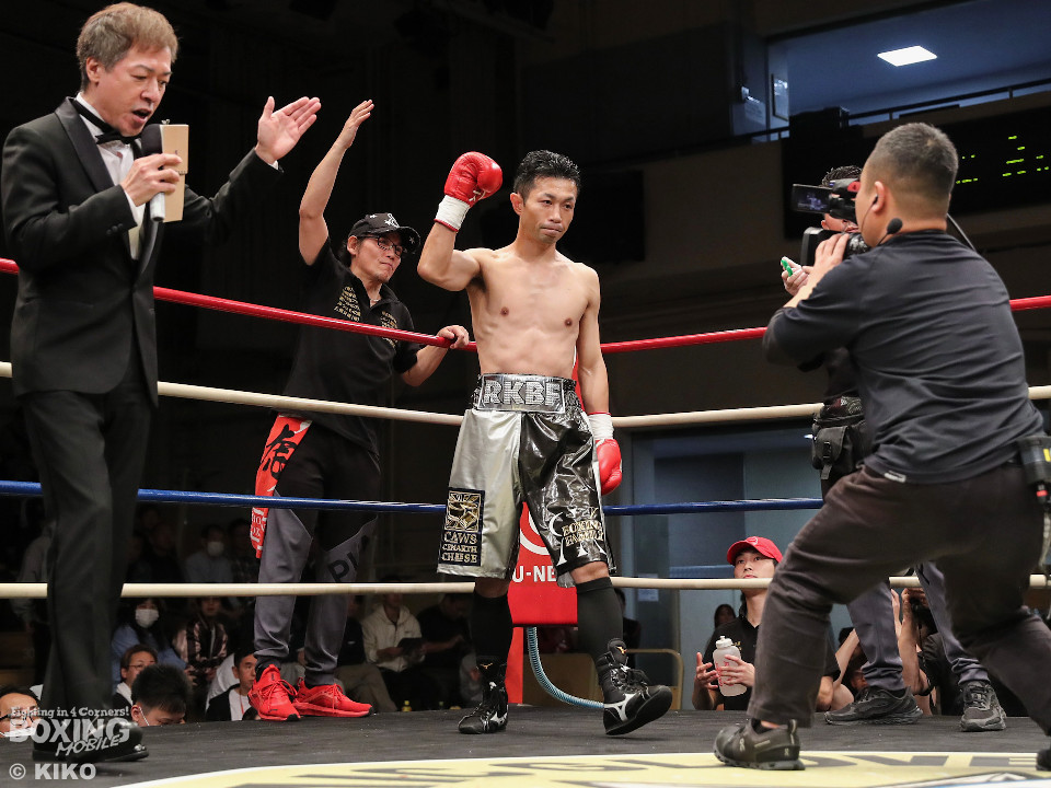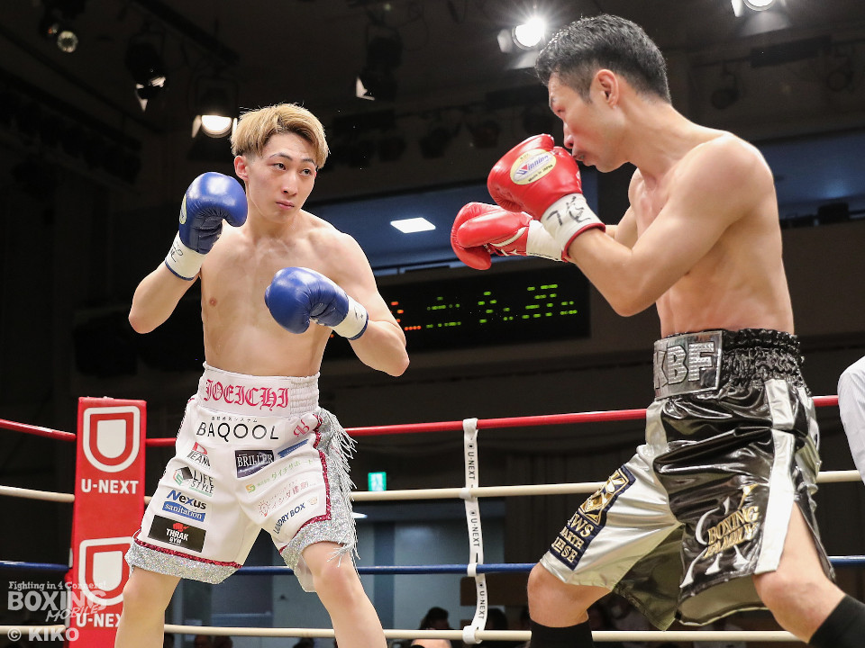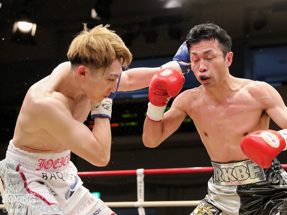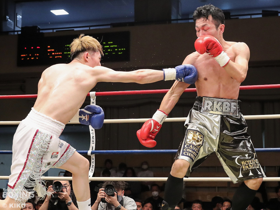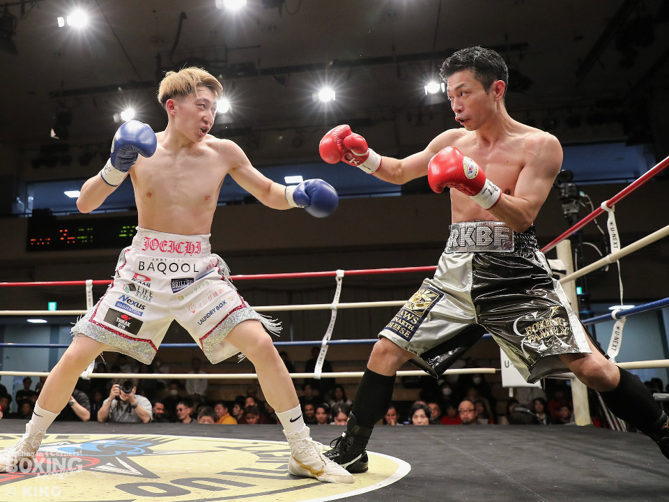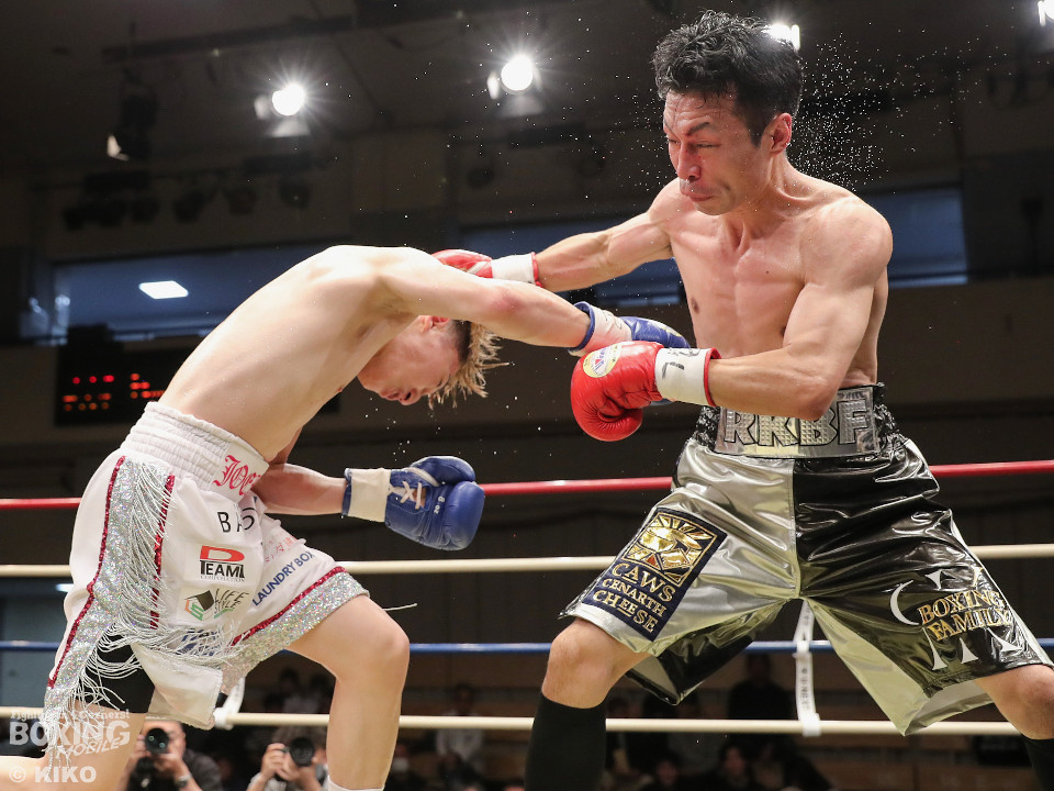 試合:前の手で距離の探り合いからスタート。サウスポー八谷が遅れて出てくる左オーバーハンドをヒット。2回も八谷は独特のタイミングの左で見栄えの良さをアピール。しかし、佐藤に焦りは見られず。3回、佐藤は前に出てきたところに右ショートを合わせてダウンをゲット。4回、お互いに警戒してか決定打を打ち込めず。5回、中間距離で激しいペース争いが続く中、試合終了30秒を切ったところで八谷がワンツー、右フックで攻勢をアピールした。36歳の八谷が東日本新人王に就いた。