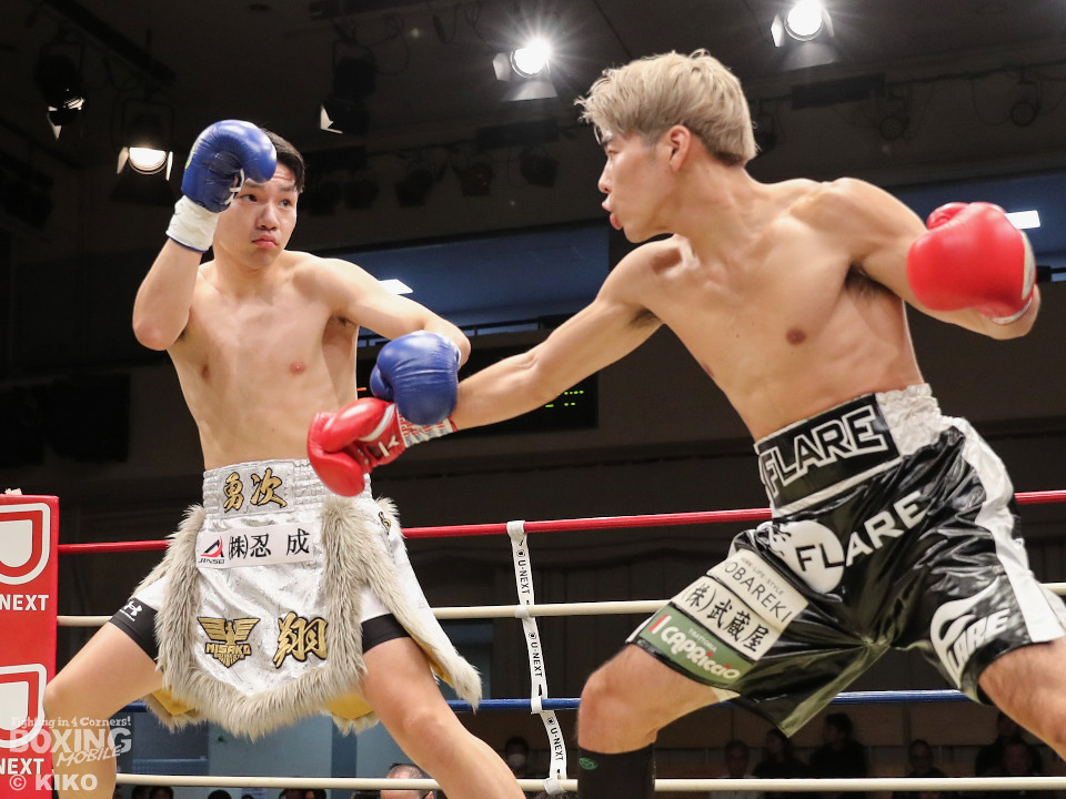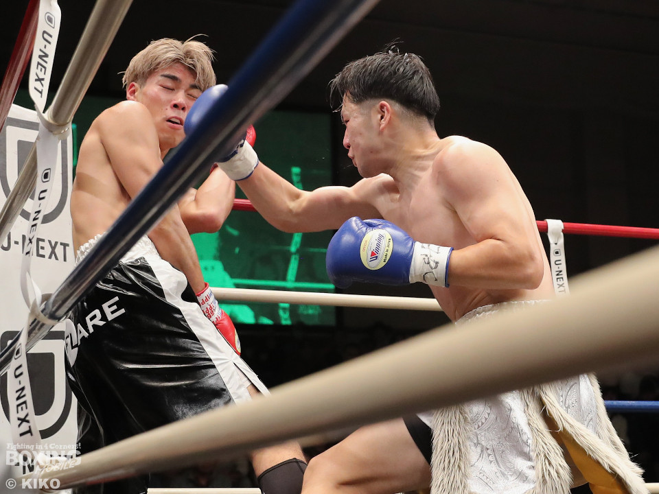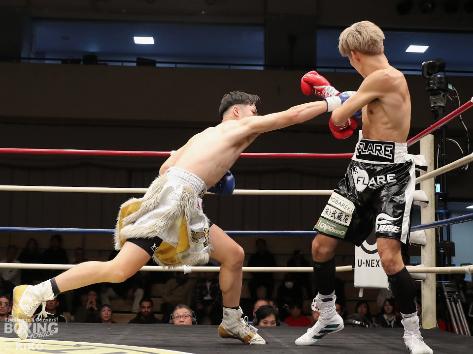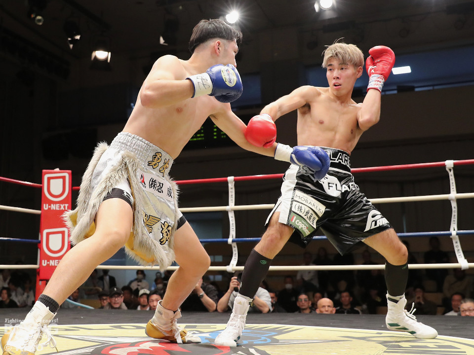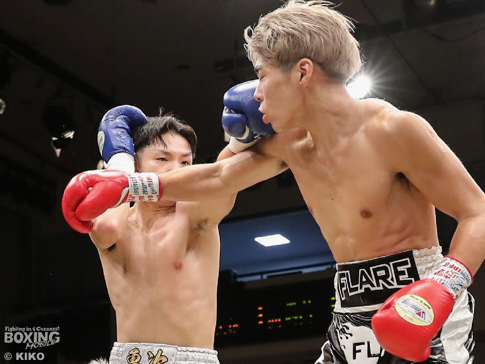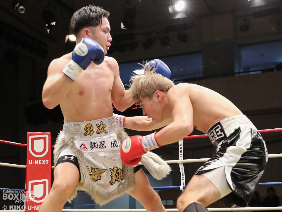 試合:保谷がプレスをかけて右フックを叩きつけると右カウンターでダウンを奪取。絶好のスタートを切った。2回も保谷は思い切りの良い右スイングでポイントを加点。3回、サウスポー岡田は左ストレートにつなげたいが、あと一歩が踏み込めず。4回、保谷はジリジリと距離を詰めて右ストレートを軸に攻め立てた。5回、保谷はジャブからワンツーをヒット。最後までスピードで上回った。保谷がフルマークの判定勝ちを飾った。