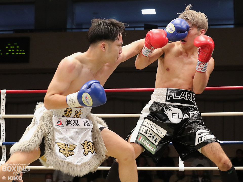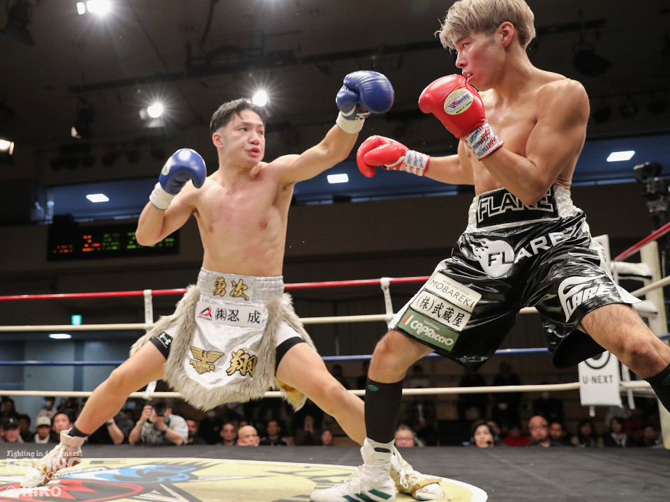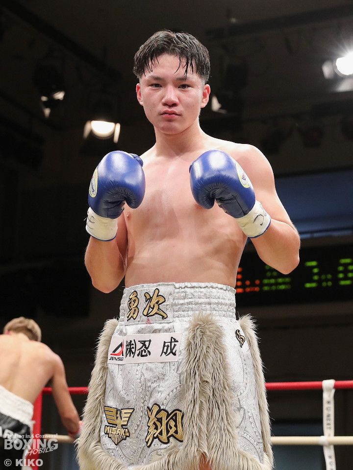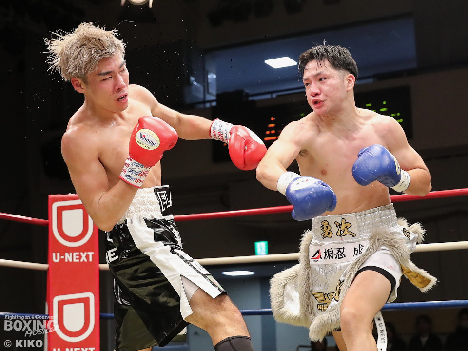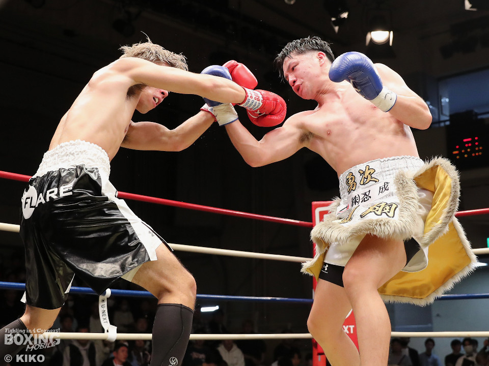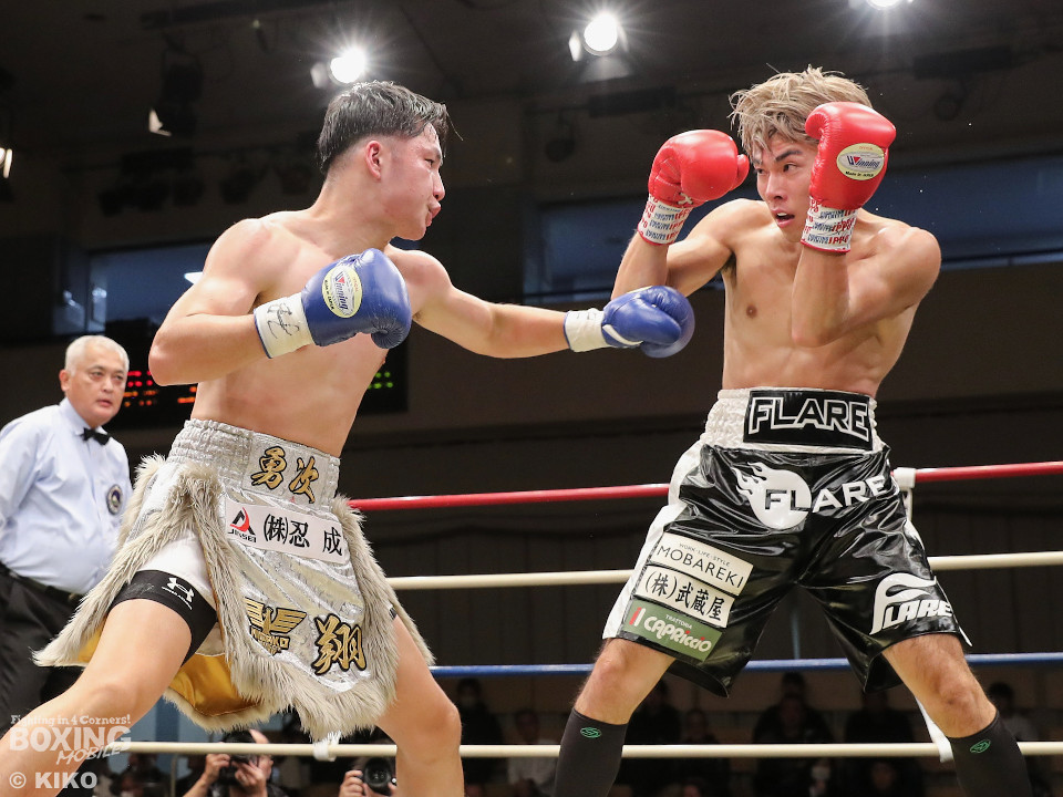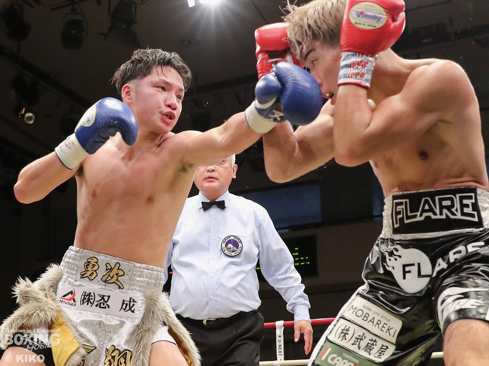 試合:保谷がプレスをかけて右フックを叩きつけると右カウンターでダウンを奪取。絶好のスタートを切った。2回も保谷は思い切りの良い右スイングでポイントを加点。3回、サウスポー岡田は左ストレートにつなげたいが、あと一歩が踏み込めず。4回、保谷はジリジリと距離を詰めて右ストレートを軸に攻め立てた。5回、保谷はジャブからワンツーをヒット。最後までスピードで上回った。保谷がフルマークの判定勝ちを飾った。