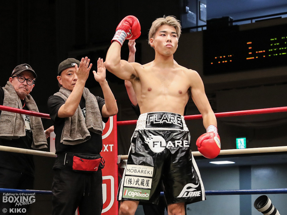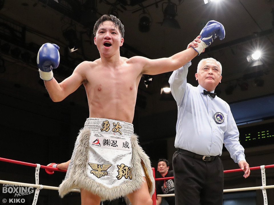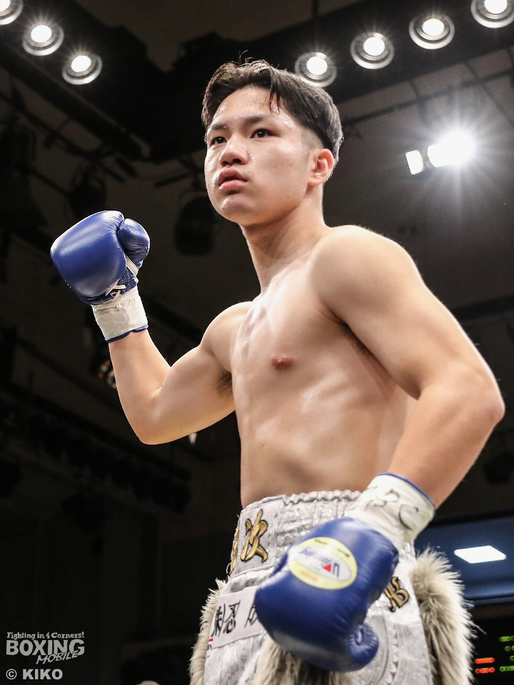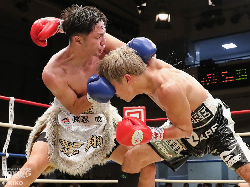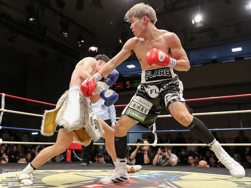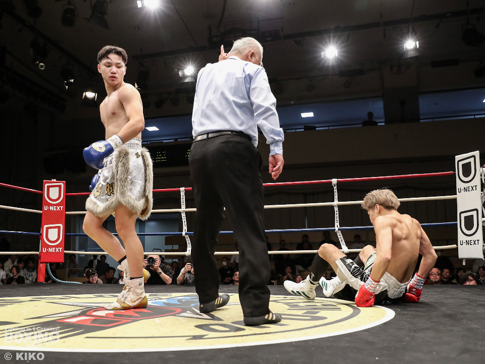 試合:保谷がプレスをかけて右フックを叩きつけると右カウンターでダウンを奪取。絶好のスタートを切った。2回も保谷は思い切りの良い右スイングでポイントを加点。3回、サウスポー岡田は左ストレートにつなげたいが、あと一歩が踏み込めず。4回、保谷はジリジリと距離を詰めて右ストレートを軸に攻め立てた。5回、保谷はジャブからワンツーをヒット。最後までスピードで上回った。保谷がフルマークの判定勝ちを飾った。