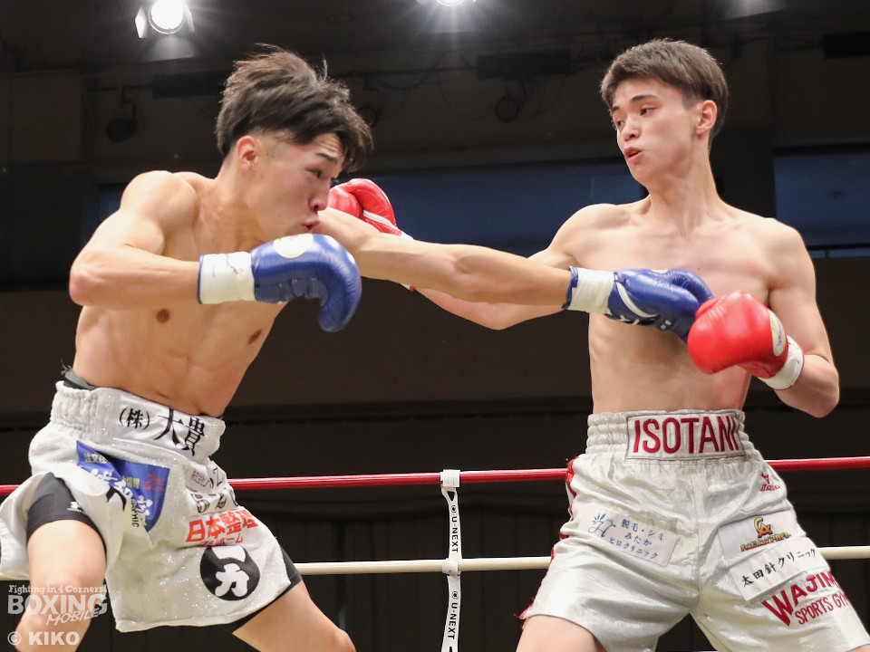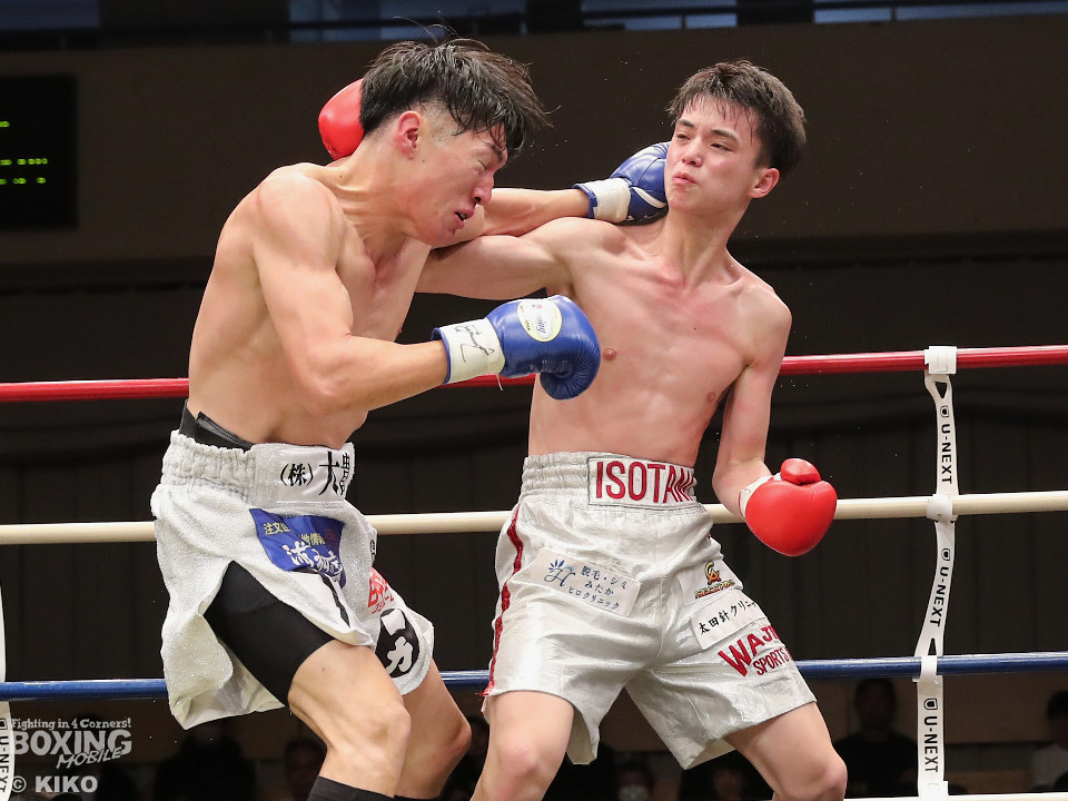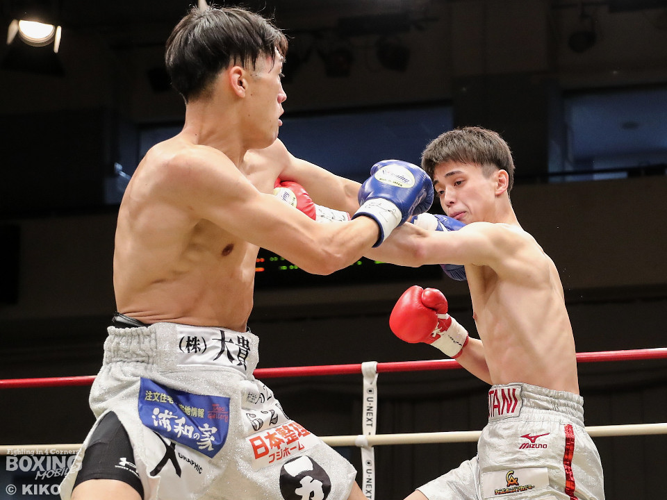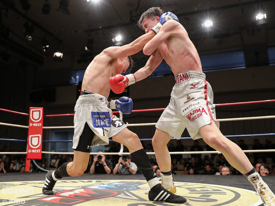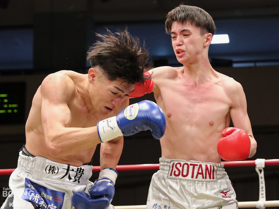 試合:サウスポー磯谷が単発の左ストレートで先制。落合はジリジリと距離を詰めてワンツーで対抗。2回、落合はステップインから右フックから右ボディを好打。3回、落合は距離を潰して右ボディを突き刺すと左フックでバランスを崩させて攻勢を印象付けた。左ストレートで突き放したい磯谷だが、思い通りの展開を作れず。4回、磯谷がノーモーションの左ストレート決めれば、落合もワンツーで顔を弾きペースを渡さず。5回、落合はプレスをかけてワンツー連打で攻勢。しかし、試合終了間際、磯谷は打ち下ろしの左ストレートで意地を見せた。採点は割れたが落合に軍配が上がった。