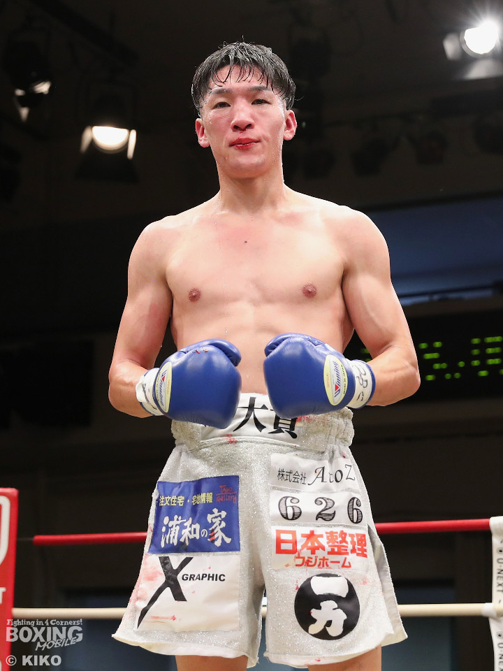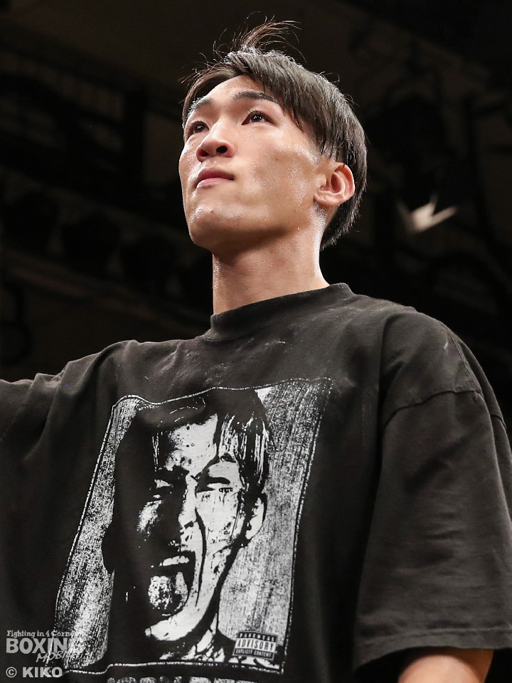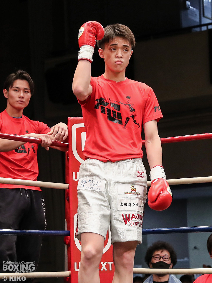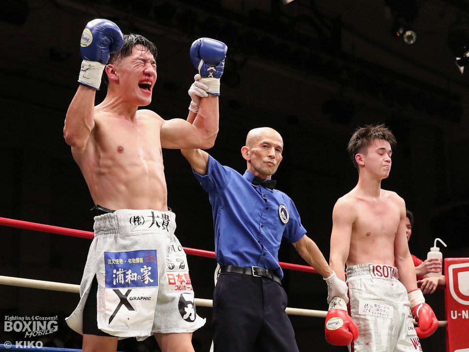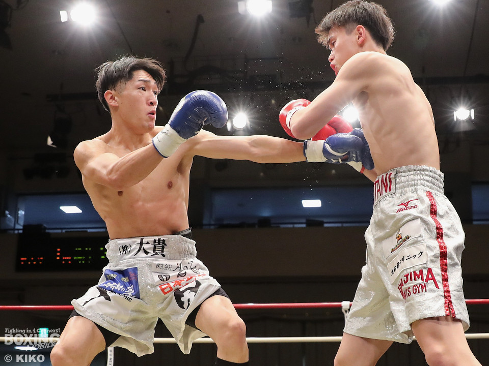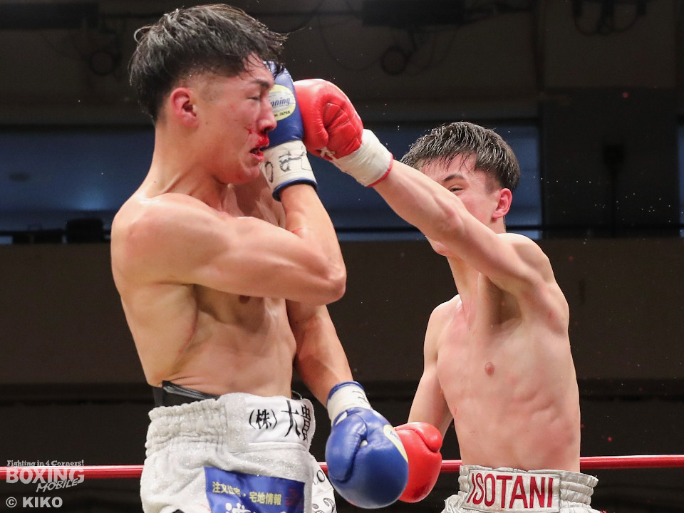 試合:サウスポー磯谷が単発の左ストレートで先制。落合はジリジリと距離を詰めてワンツーで対抗。2回、落合はステップインから右フックから右ボディを好打。3回、落合は距離を潰して右ボディを突き刺すと左フックでバランスを崩させて攻勢を印象付けた。左ストレートで突き放したい磯谷だが、思い通りの展開を作れず。4回、磯谷がノーモーションの左ストレート決めれば、落合もワンツーで顔を弾きペースを渡さず。5回、落合はプレスをかけてワンツー連打で攻勢。しかし、試合終了間際、磯谷は打ち下ろしの左ストレートで意地を見せた。採点は割れたが落合に軍配が上がった。