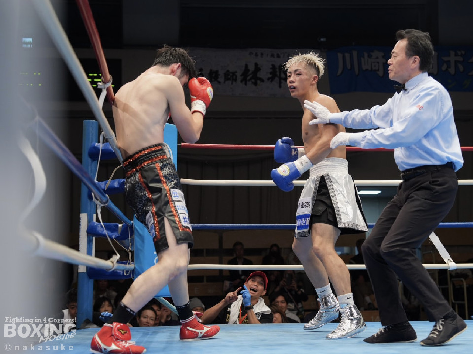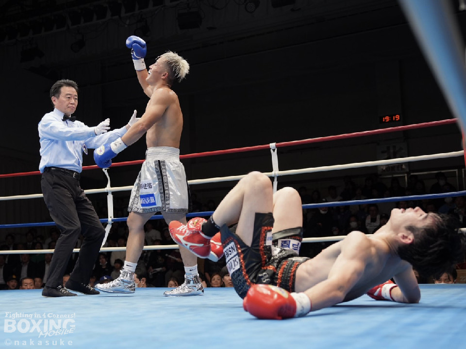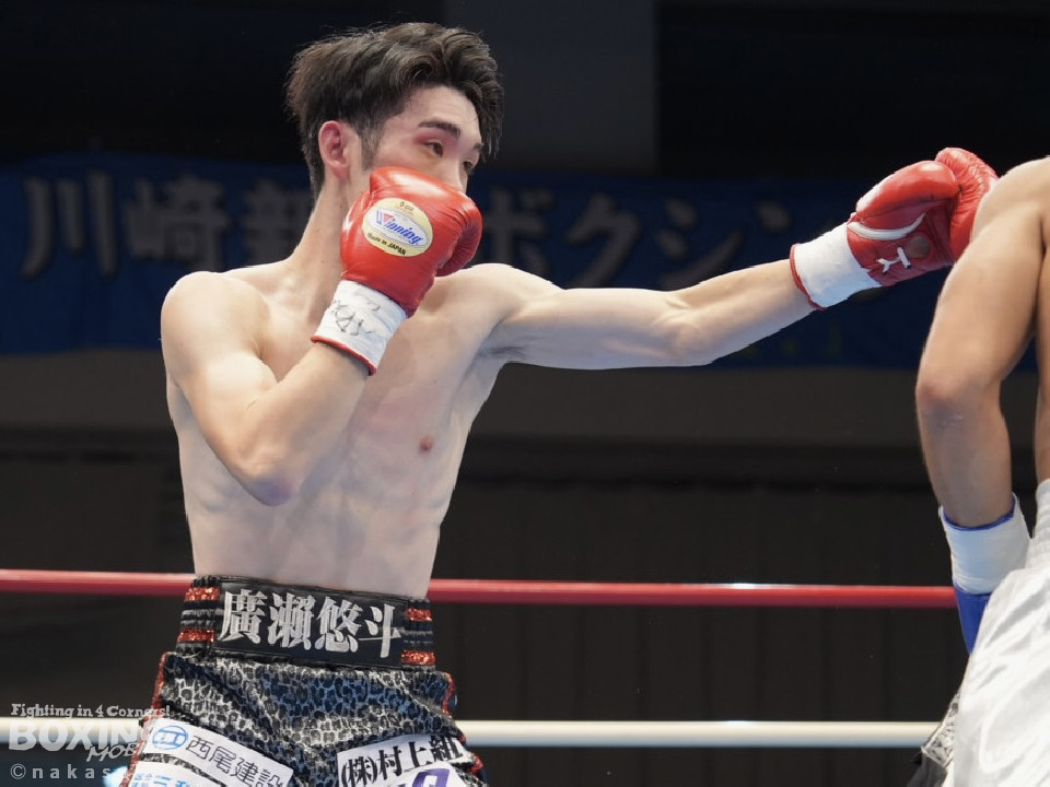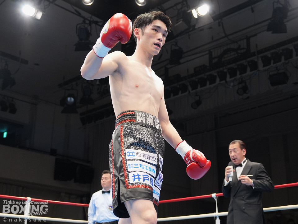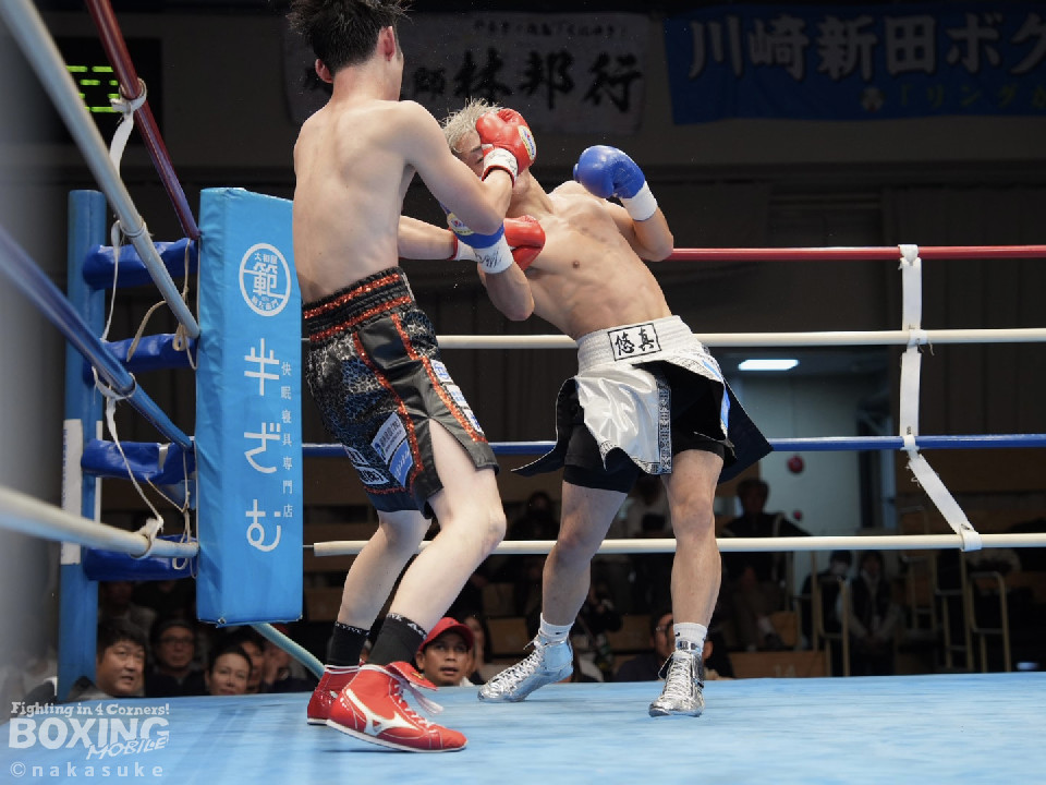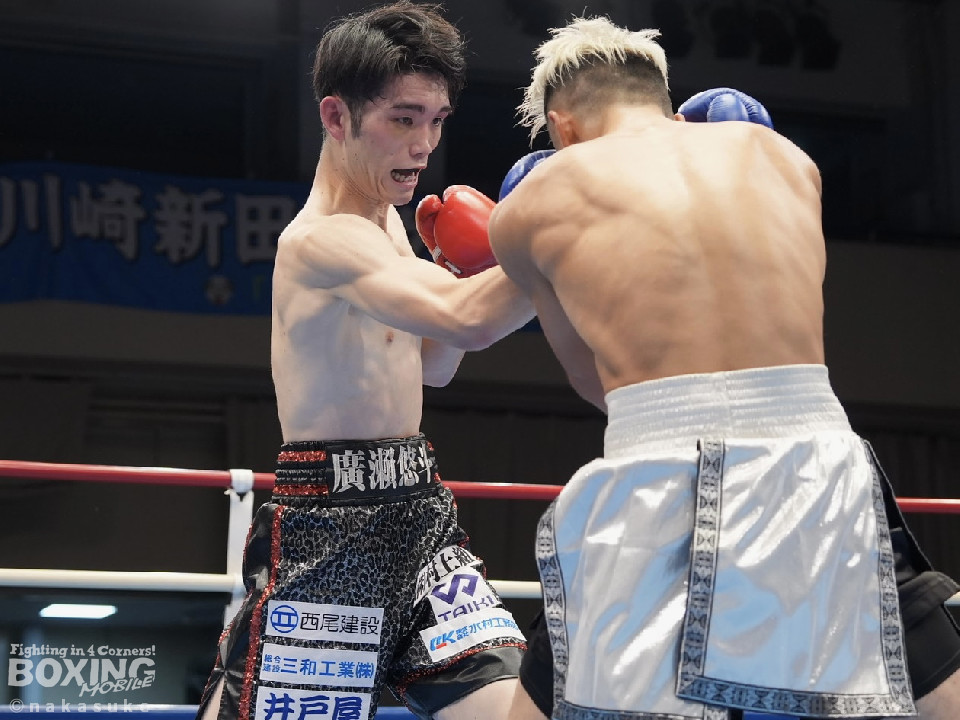 試合:堀田がジャブから右オーバーハンドにつなげると、左フックをヒット。後手に回った廣瀬だが右クロスを返した。2回、廣瀬は左ボディを突き刺すと、ワンツーを好打。3回、堀田は力強い右フック、左ボディで攻め立てると左ボディで一瞬動きを止めて攻勢。4回、堀田はボディを徹底して攻めると死角からの右アッパーでダウンを奪取。再開後、右アッパーで顔を弾いたところでレフェリーが割って入った。堀田が4連続KOでB級(6回戦)昇格を決めた。