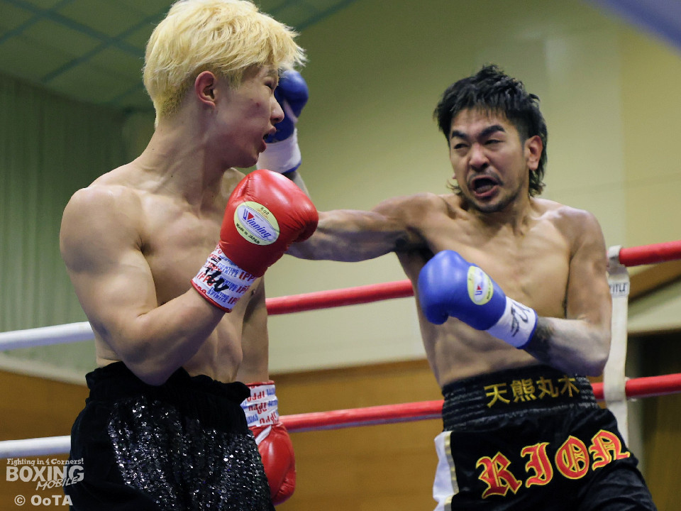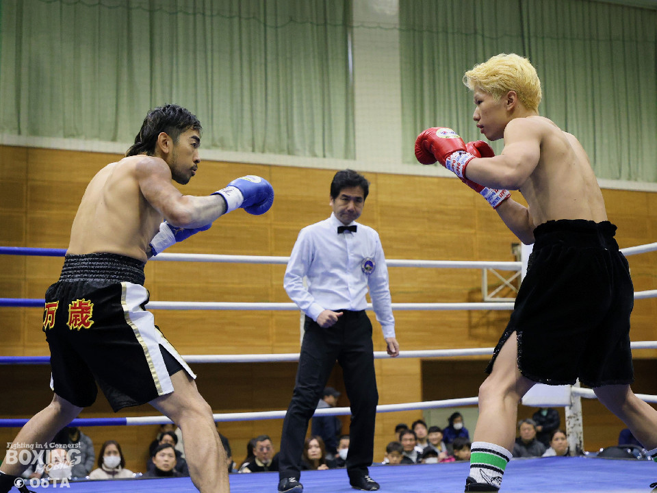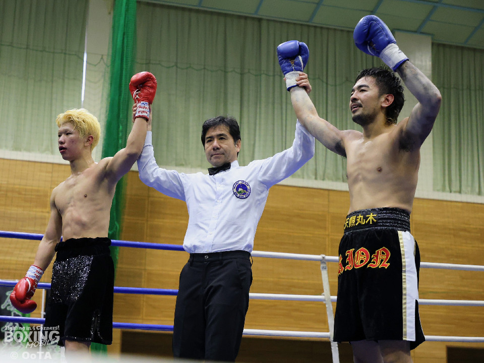 試合:互いに前の手を交錯させて様子を見る小田とサウスポーのバンザイ。独特なペースの小田が打ち合いに引き込むと、打ち終わりを狙って一気呵成に連打でコーナーに押し込んだ。2回、フェイントを織り交ぜる小田に攻め手を作りきれないバンザイだが、細かくポジションを変えて攻めの姿勢を崩さず。続く3回は縦の出入りを活かしたバンザイが左ストレートを伸ばして展開を変えた。互いに持ち味を出してペースを奪い合う中で試合終了のゴング。ドロー判定がコールされた。