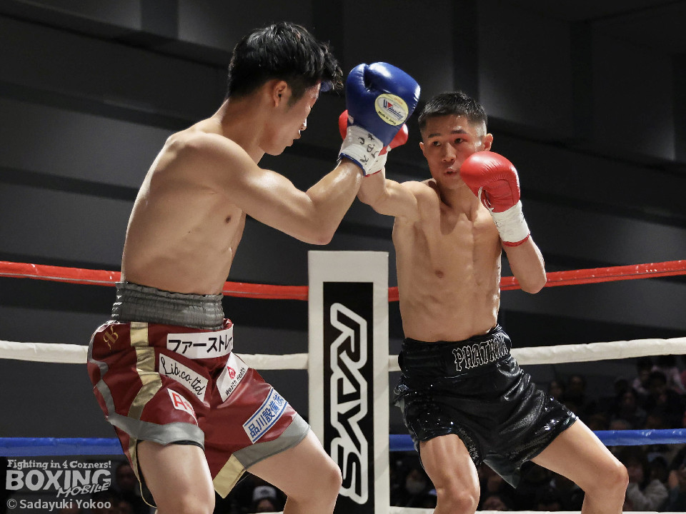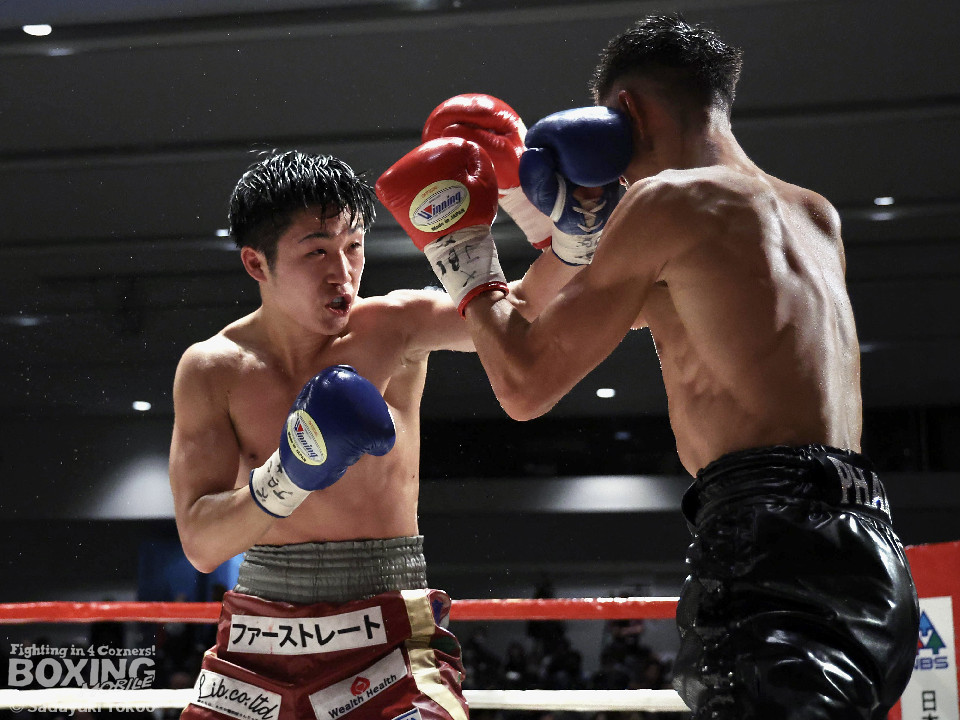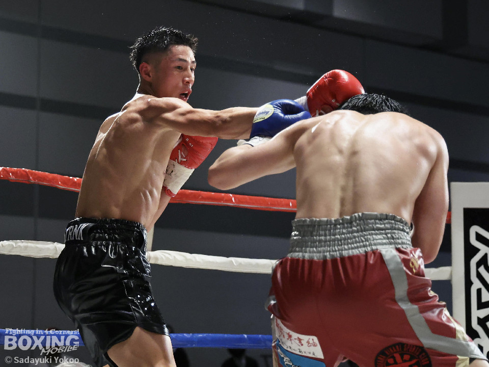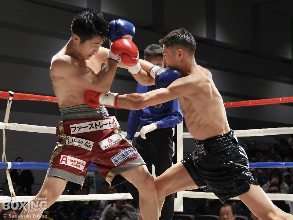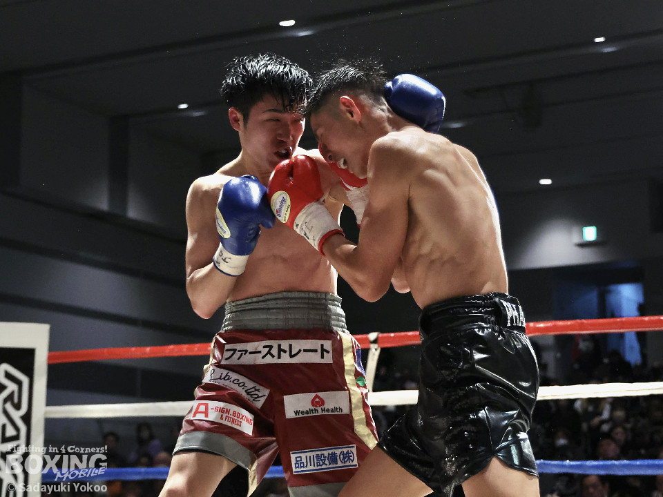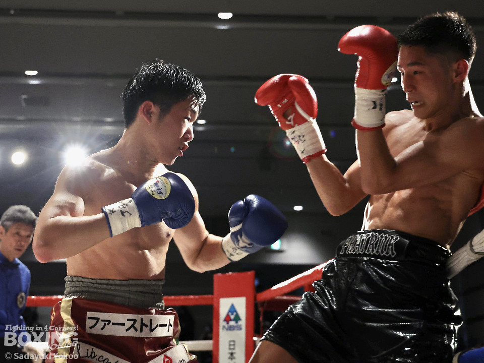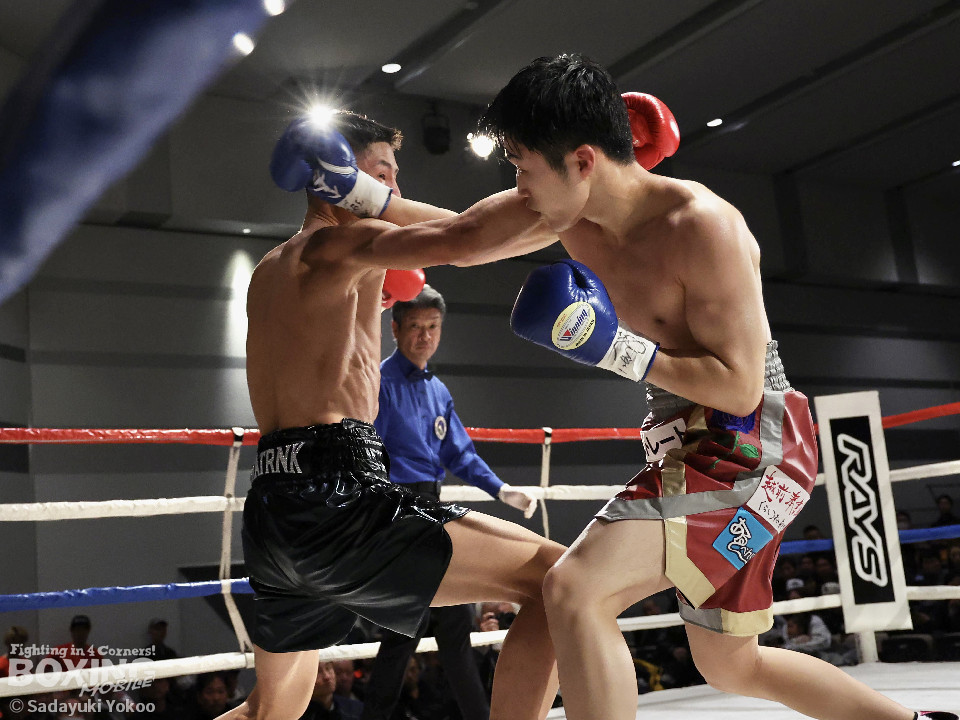 試合:山森がジャブを飛ばしながら右ボディストレートで先制。2回、サウスポー原田は前の手で距離を作りながら単発の左ストレートをヒット。3回、距離がかみ合わずお互いに決定打を決められず。4回、原田は左カウンターで迎え撃つと出入りを活かしたボクシングを披露。混戦状態の中、ジャッジにポイントをアピール。5回、距離を詰めたい山森だが、クリンチで攻撃を遮断され思い通りの展開を作れず。6回、山森はプレスをかけて右ボディストレートから左フックで顔を弾き見栄えの良さをアピール。7回、左ショートをねじ込む原田としつこく距離を潰しにいく山森の構図。8回、ボディに的を絞った山森だが、原田は距離を取りながら要所で左ストレートを決めて突き放した。原田が判定勝ちでランキングの座を守った。
