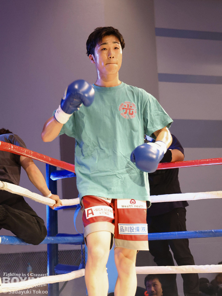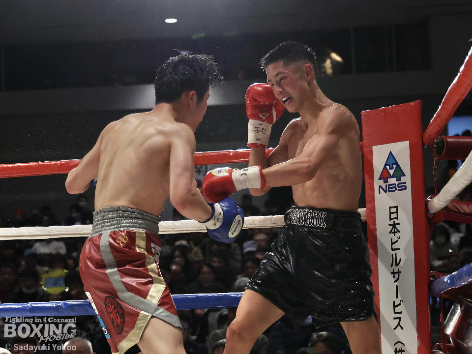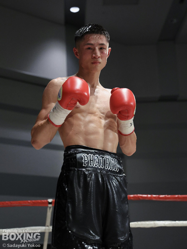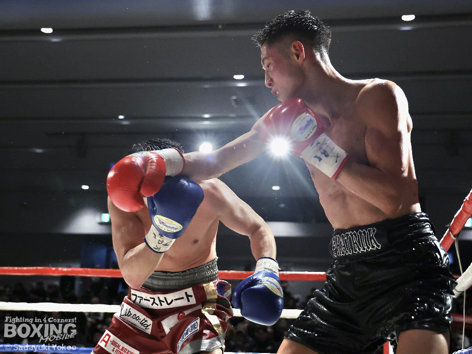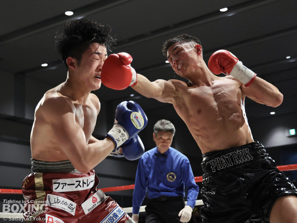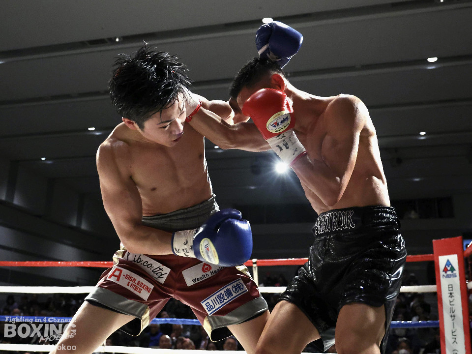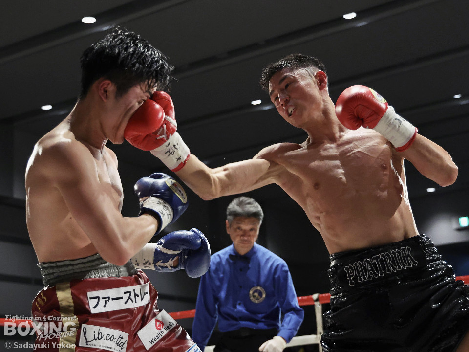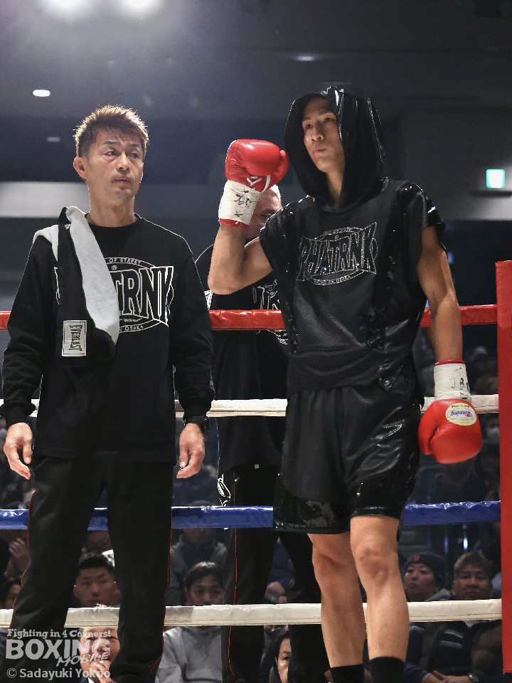 試合:山森がジャブを飛ばしながら右ボディストレートで先制。2回、サウスポー原田は前の手で距離を作りながら単発の左ストレートをヒット。3回、距離がかみ合わずお互いに決定打を決められず。4回、原田は左カウンターで迎え撃つと出入りを活かしたボクシングを披露。混戦状態の中、ジャッジにポイントをアピール。5回、距離を詰めたい山森だが、クリンチで攻撃を遮断され思い通りの展開を作れず。6回、山森はプレスをかけて右ボディストレートから左フックで顔を弾き見栄えの良さをアピール。7回、左ショートをねじ込む原田としつこく距離を潰しにいく山森の構図。8回、ボディに的を絞った山森だが、原田は距離を取りながら要所で左ストレートを決めて突き放した。原田が判定勝ちでランキングの座を守った。