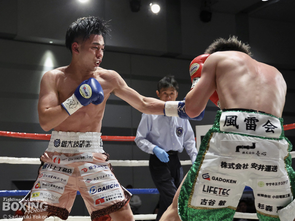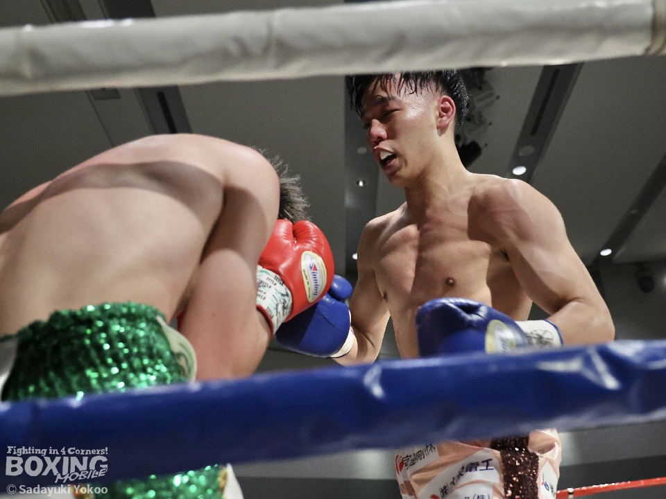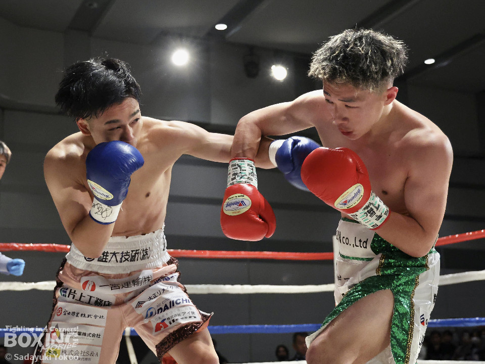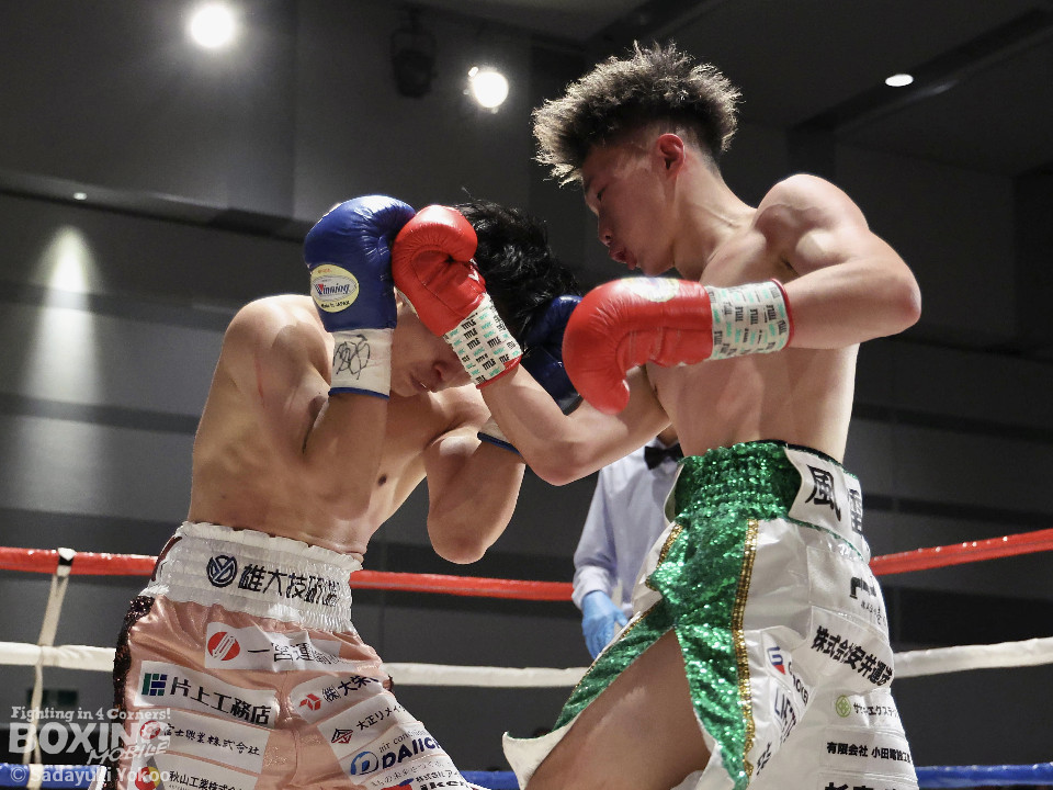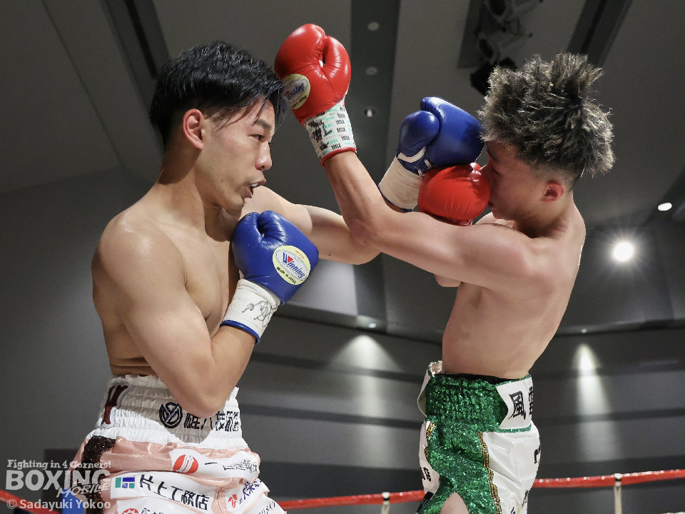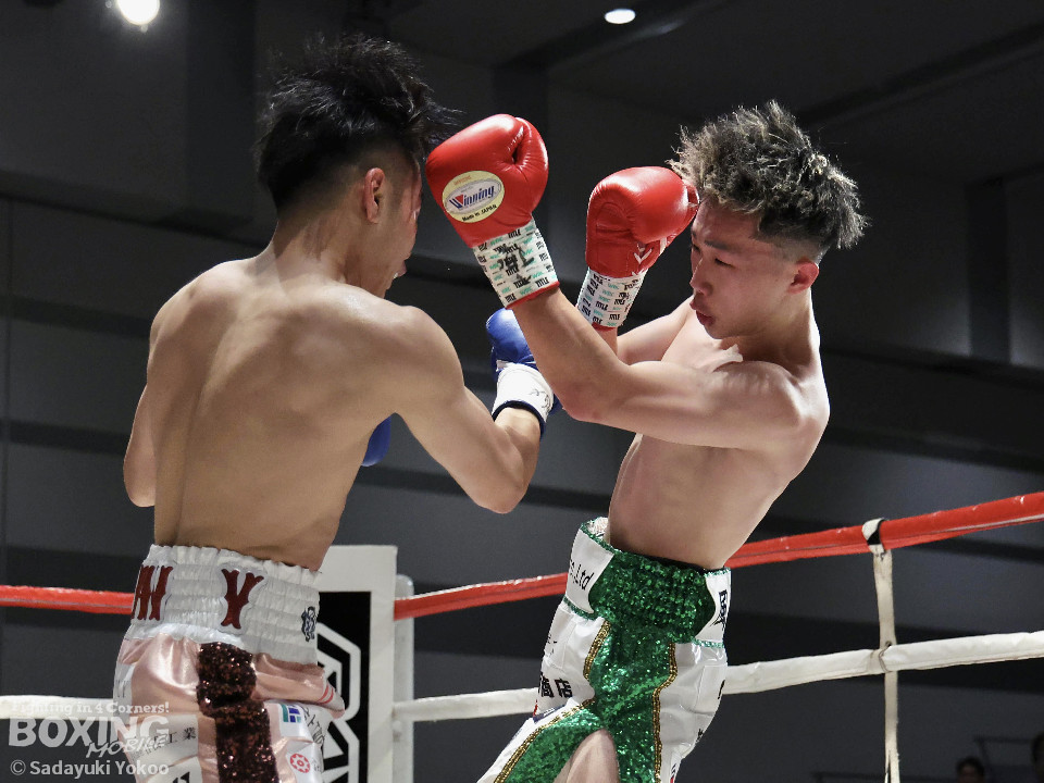 試合:竹本がコンパクトな左のダブルのコンビネーションをヒット。高田も右フックを合わせるが、竹本のショートの左フックの見栄えがいい。2回、回転力を上げた高田だが、竹本は慌てる素振りを見せず、要所で左ボディで応戦。火花が出るような打ち合いで会場を盛り上げた。打ち合いは激しさを増す中、竹本は右アッパー、左ボディを好打。4回、壮絶な打撃戦が続く中、竹本が角度を活かした左ボディで見栄えの良さをアピールした。竹本が今年10月以来の再起戦を飾った。