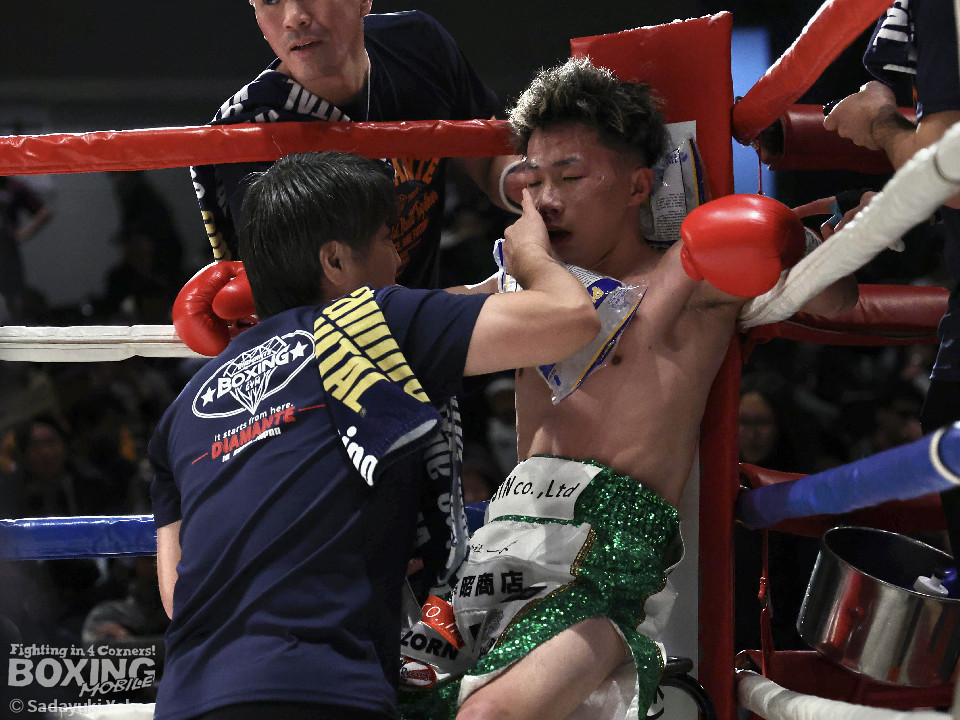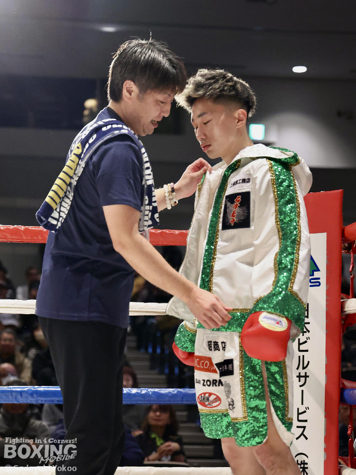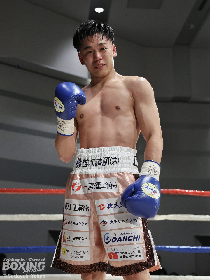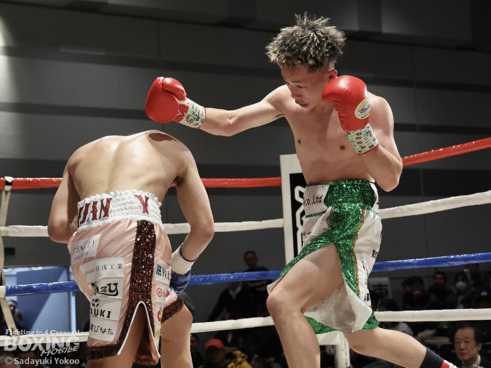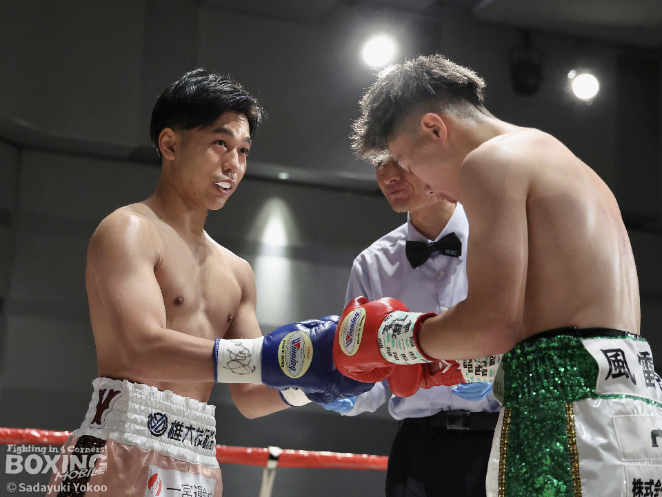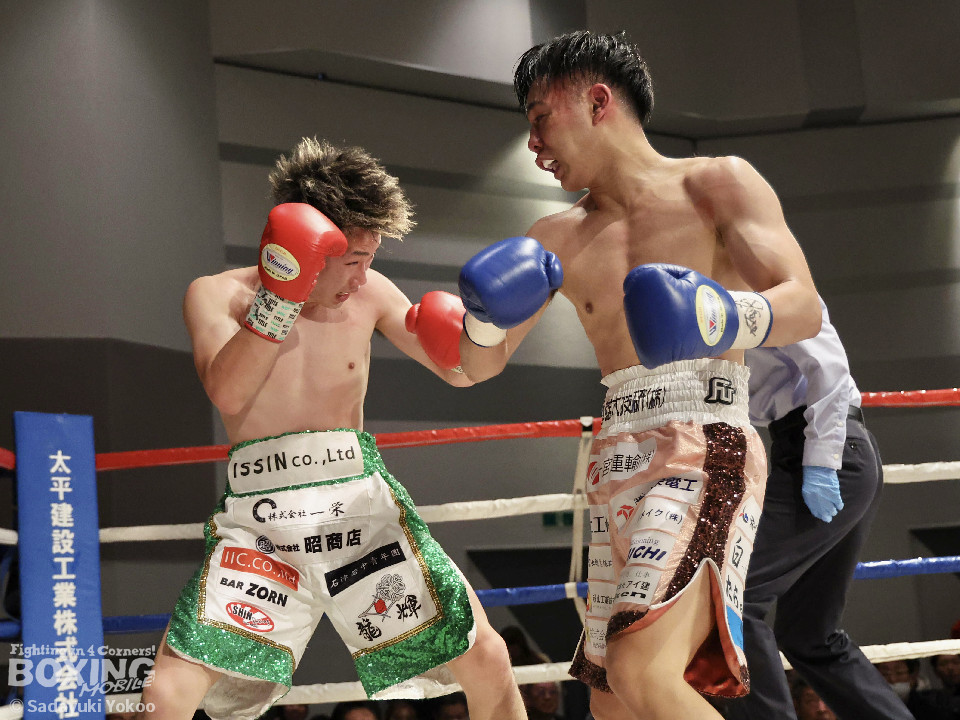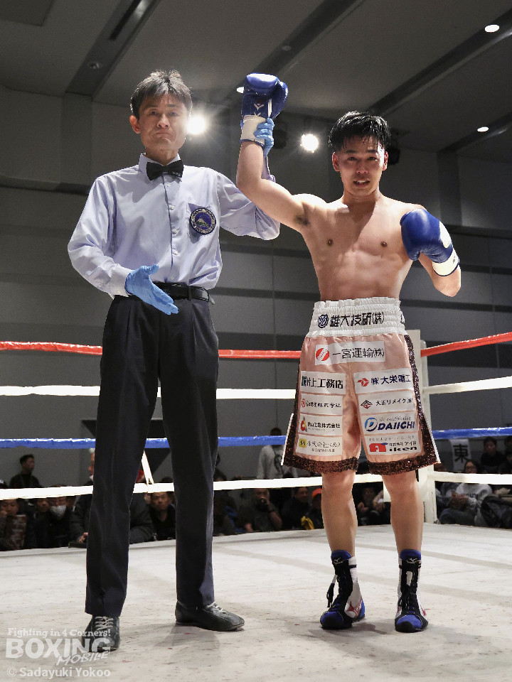 試合:竹本がコンパクトな左のダブルのコンビネーションをヒット。高田も右フックを合わせるが、竹本のショートの左フックの見栄えがいい。2回、回転力を上げた高田だが、竹本は慌てる素振りを見せず、要所で左ボディで応戦。火花が出るような打ち合いで会場を盛り上げた。打ち合いは激しさを増す中、竹本は右アッパー、左ボディを好打。4回、壮絶な打撃戦が続く中、竹本が角度を活かした左ボディで見栄えの良さをアピールした。竹本が今年10月以来の再起戦を飾った。