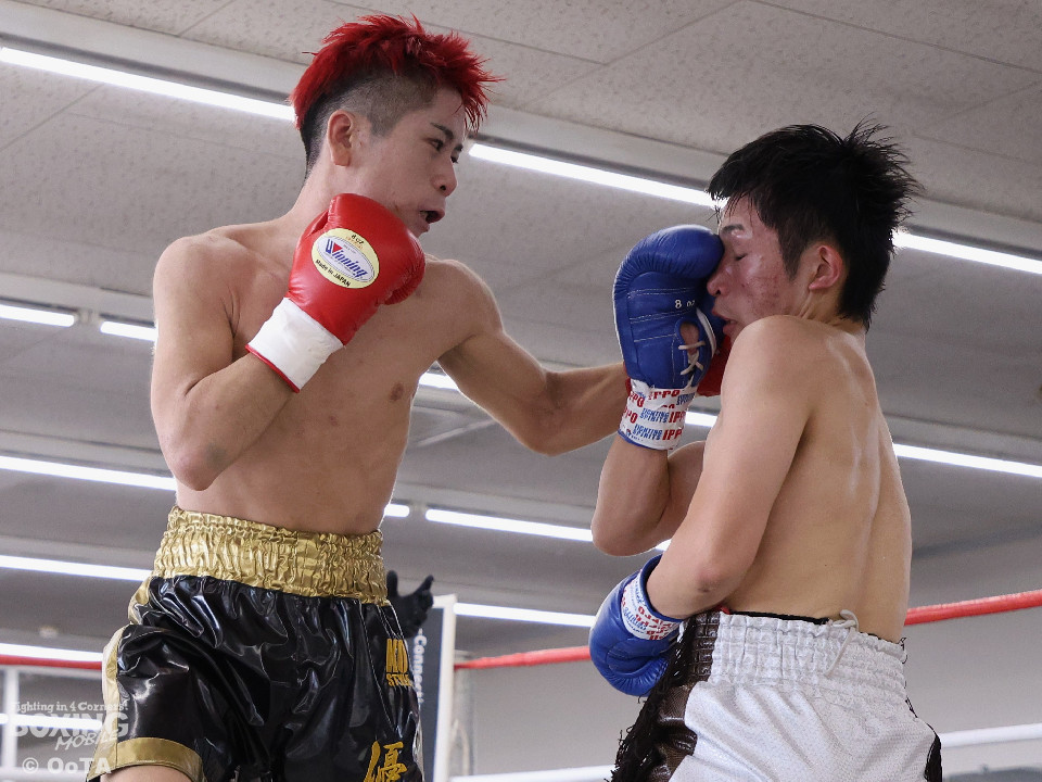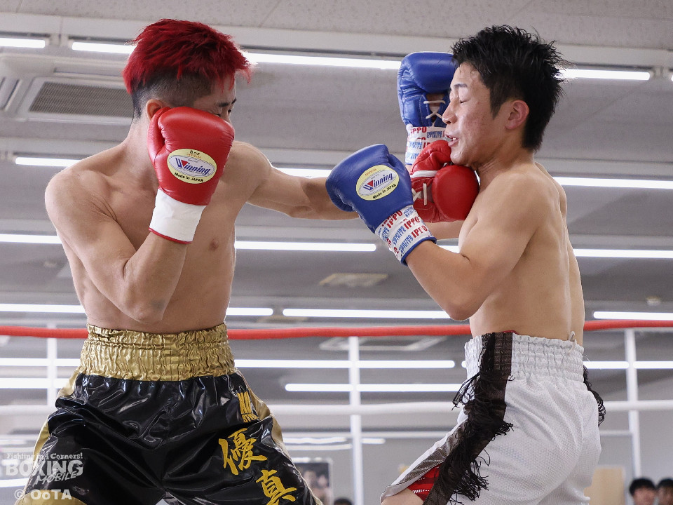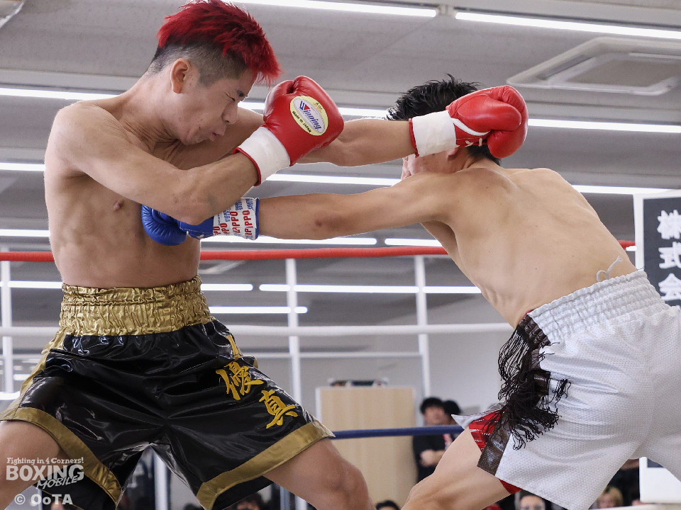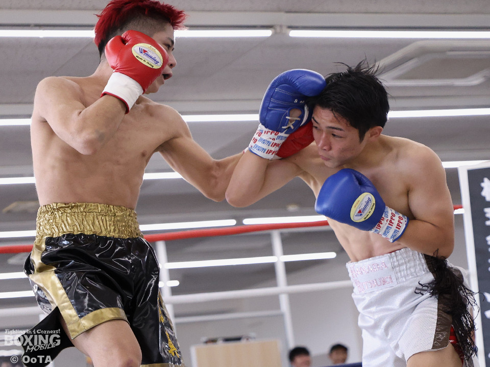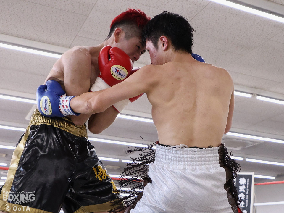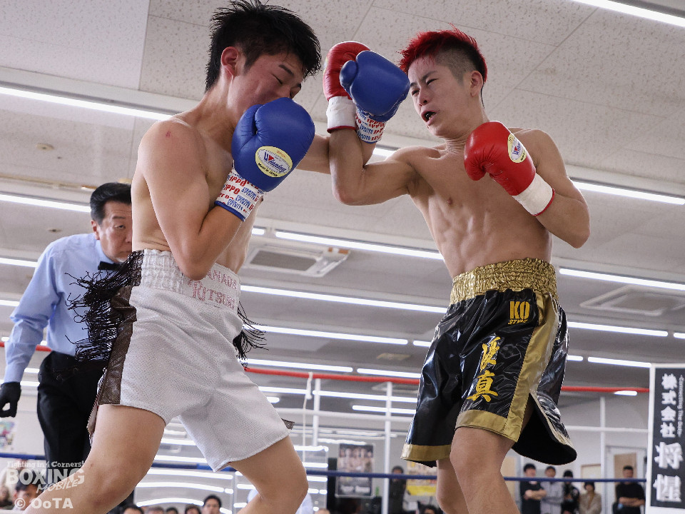 試合:花田がジャブを丁寧に突き、距離を把握してペースを握る。対する児玉も接近戦で左右に強打を振るって反撃。2回、丁寧に打ち合いのペースをたぐり寄せる花田がボディにもパンチを散らし、クリーンヒット数を伸ばした。続く3回も猛追する児玉を下がらせた花田だが、展開を打開しきるには至らず。最終回、児玉が左フックで動きを止めたが、花田もインファイトのテクニックを総動員してポイントの挽回を狙った。判定へと持ち込まれた結果は甲乙をつけられず。ドロー判定がコールされた。