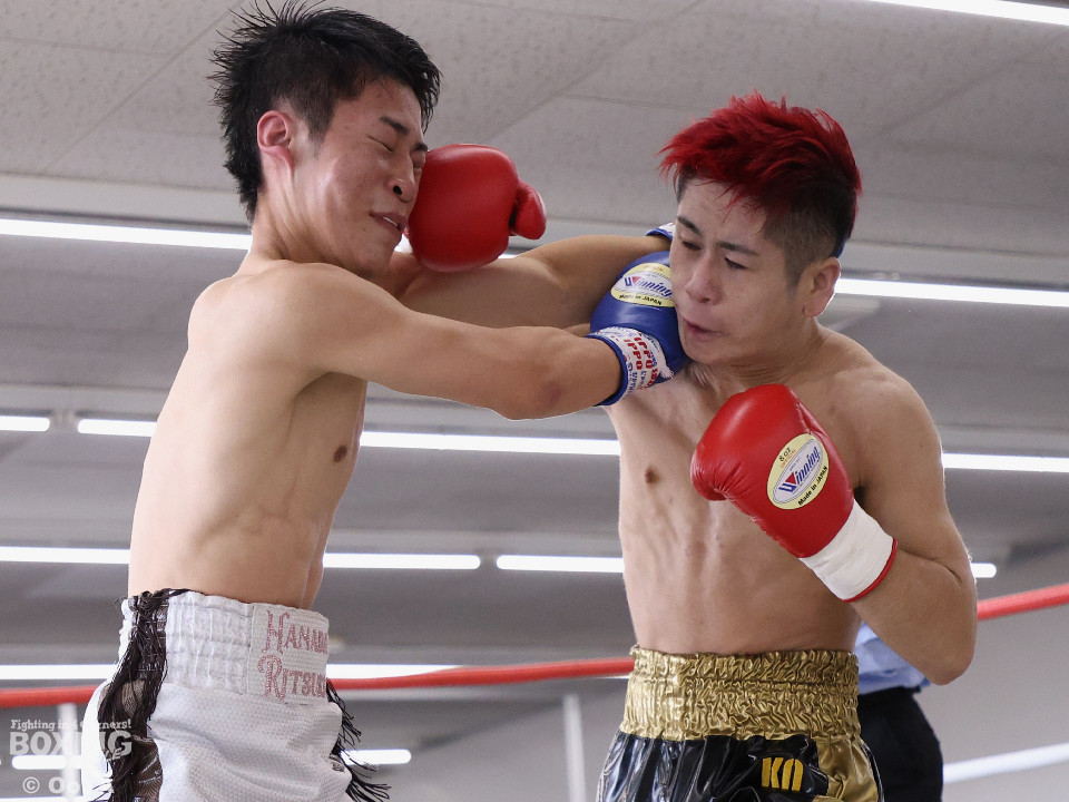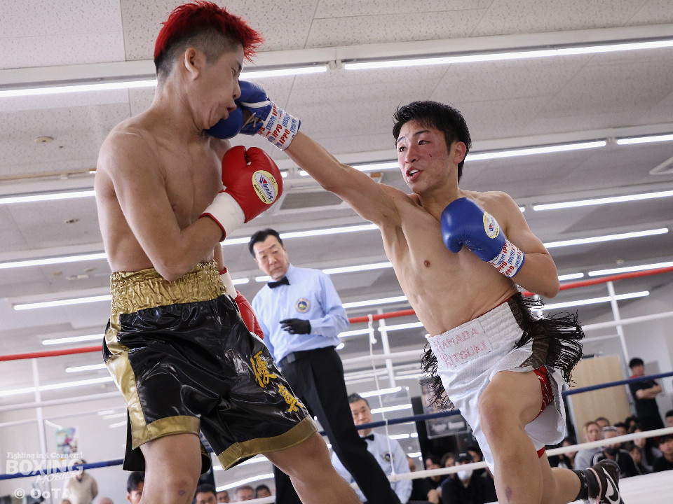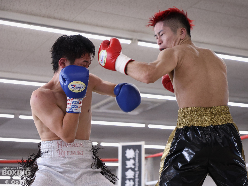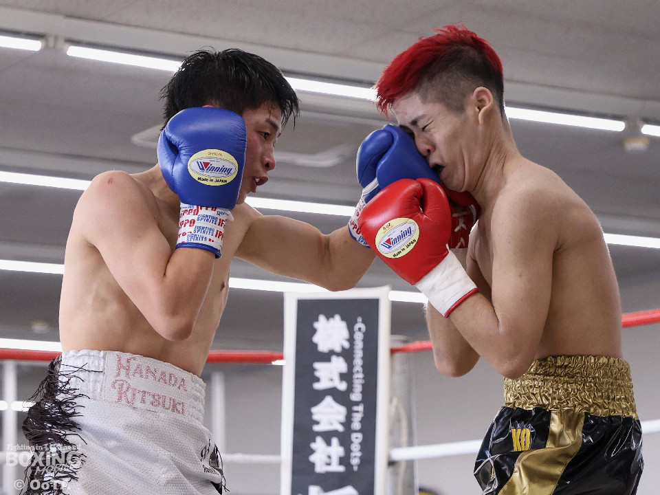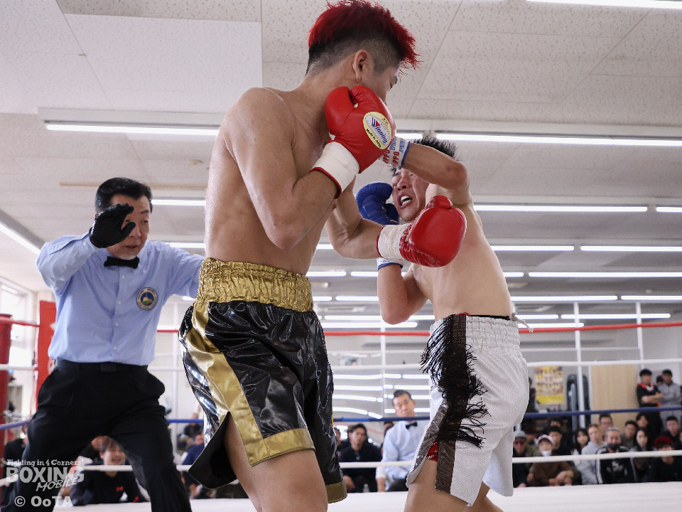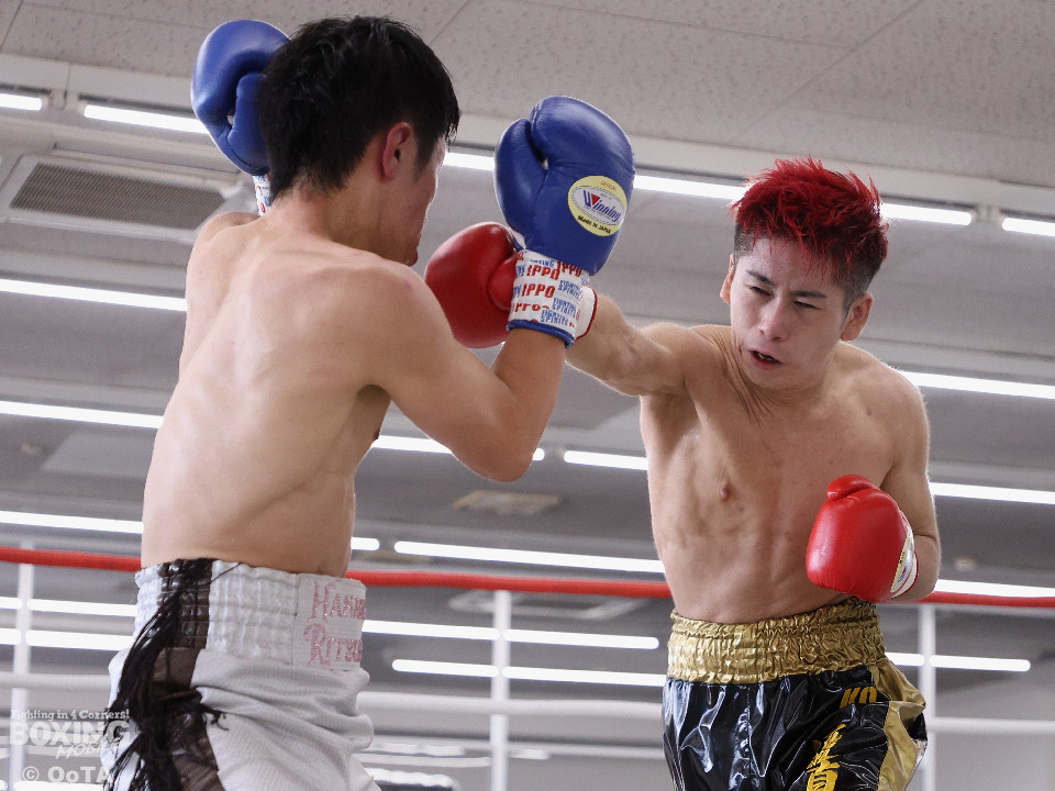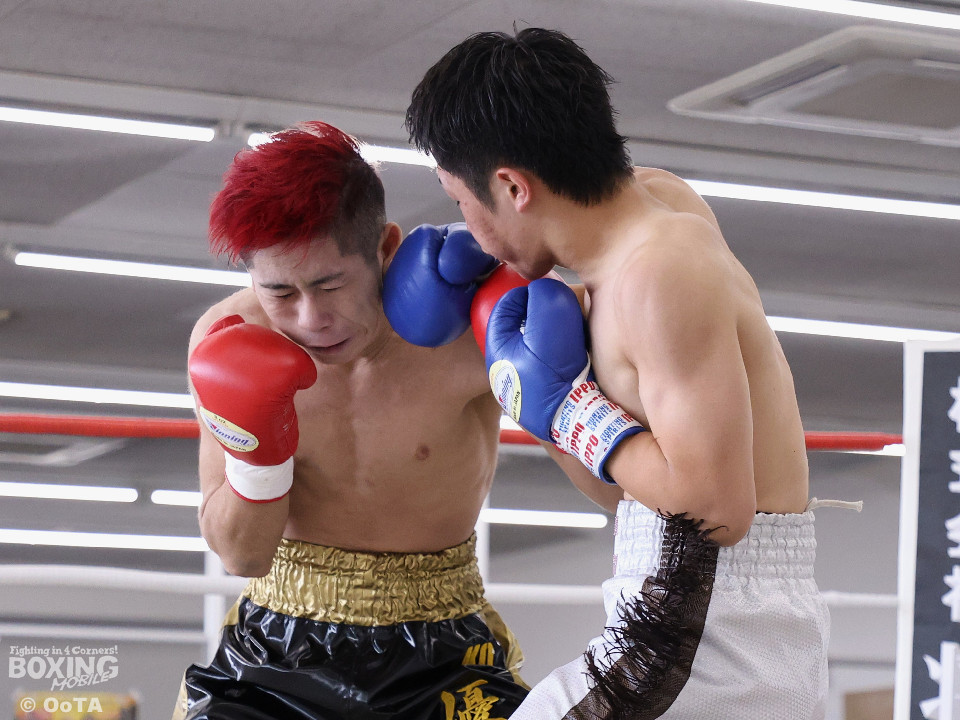 試合:花田がジャブを丁寧に突き、距離を把握してペースを握る。対する児玉も接近戦で左右に強打を振るって反撃。2回、丁寧に打ち合いのペースをたぐり寄せる花田がボディにもパンチを散らし、クリーンヒット数を伸ばした。続く3回も猛追する児玉を下がらせた花田だが、展開を打開しきるには至らず。最終回、児玉が左フックで動きを止めたが、花田もインファイトのテクニックを総動員してポイントの挽回を狙った。判定へと持ち込まれた結果は甲乙をつけられず。ドロー判定がコールされた。