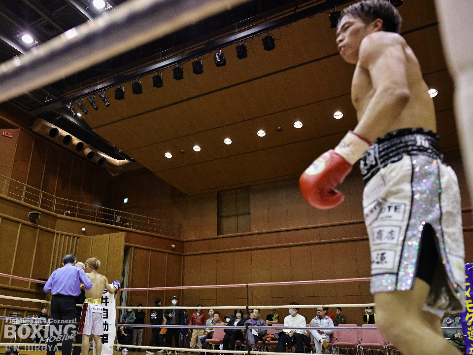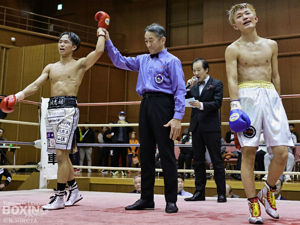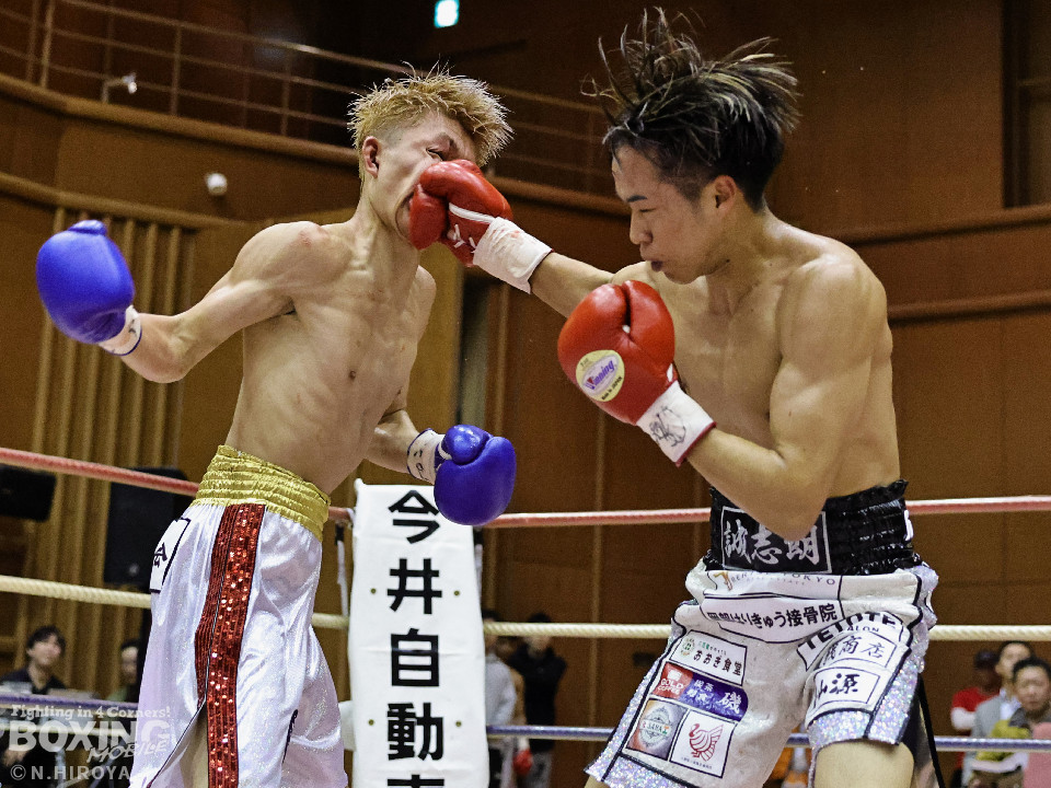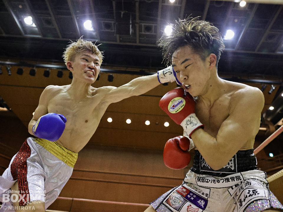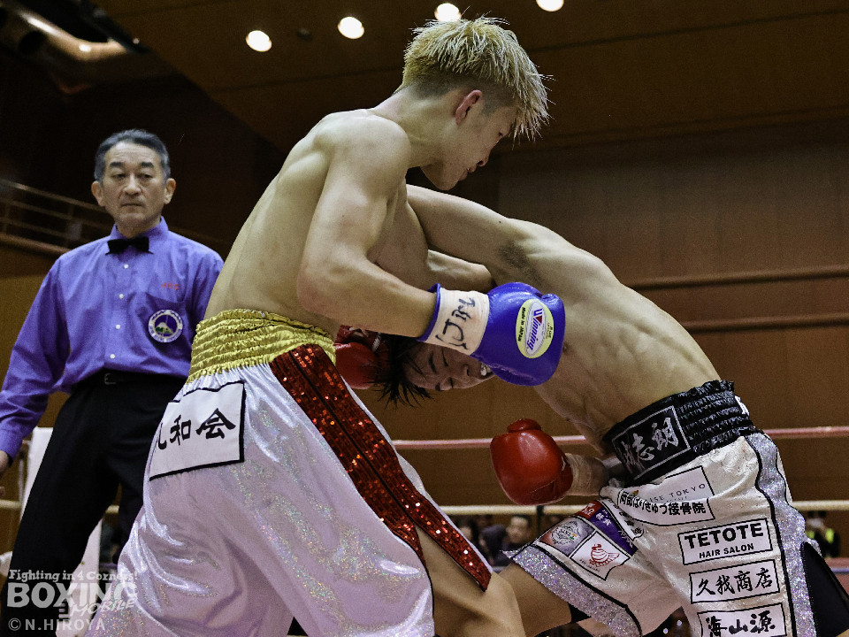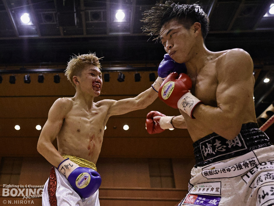 試合:サウスポー同士の一戦は、中間距離でジャブの差し合いからスタート。ラウンド終盤、井上がワンツー、右ボディをヒット。2回、横山はジャブからワンツーにつなげるが、井上は右フックを合わせてペースを渡さず。3回、横山はプレスをかけてワンツー右ボディで反撃。しかし、井上もここは負けじと左ストレートで左目下と左耳を切り裂いた。4回、回転力を活かした連打でお互いの意地がぶつかり合った。終始、有効打で上回った井上が2勝目を挙げた。