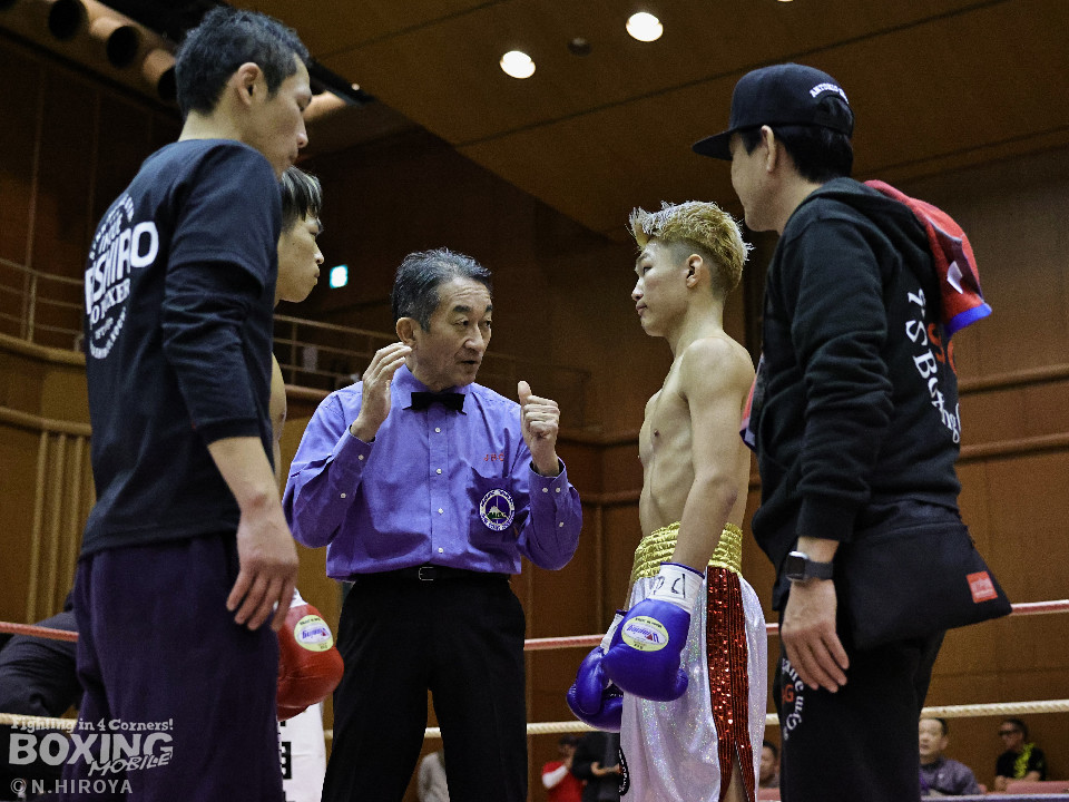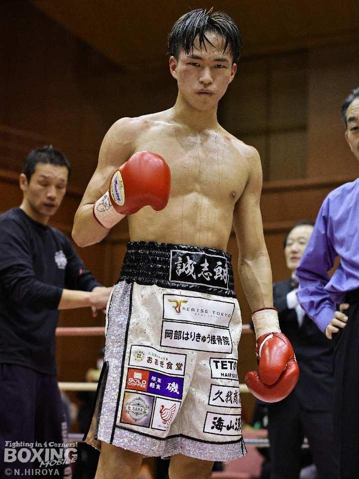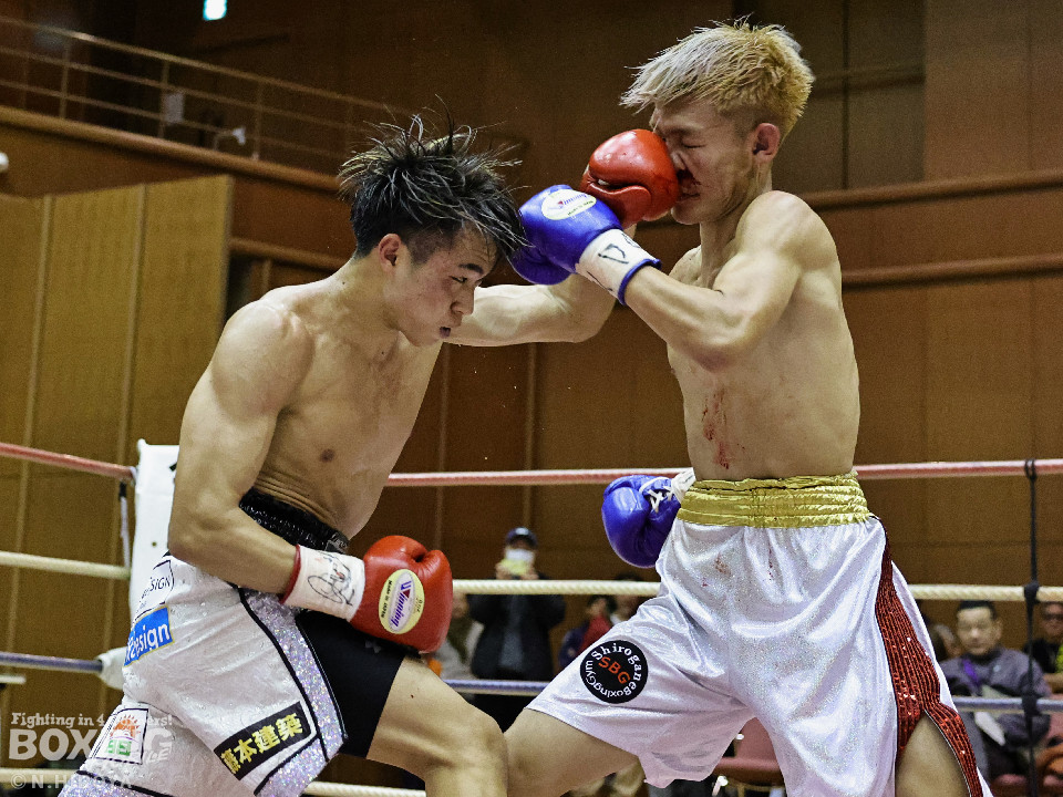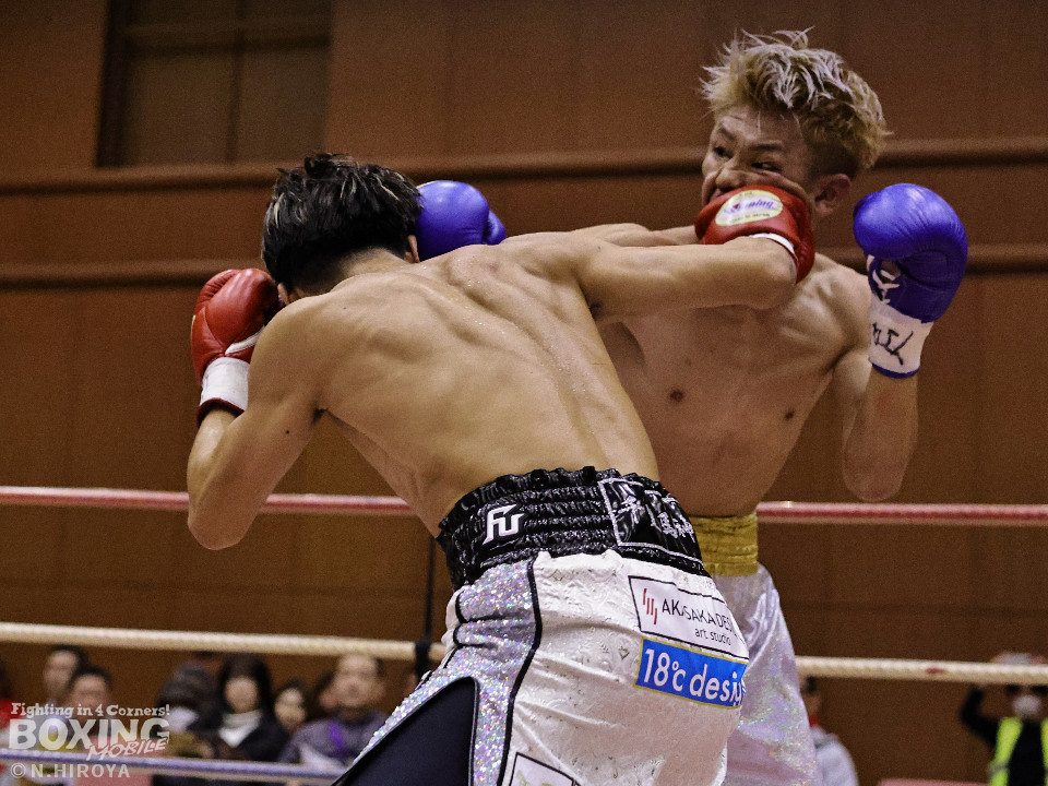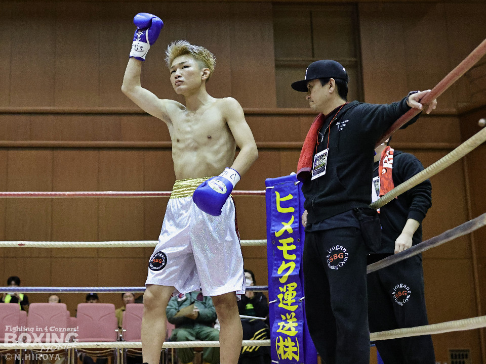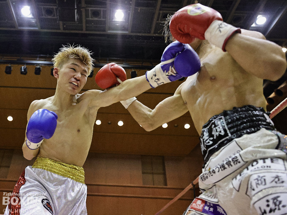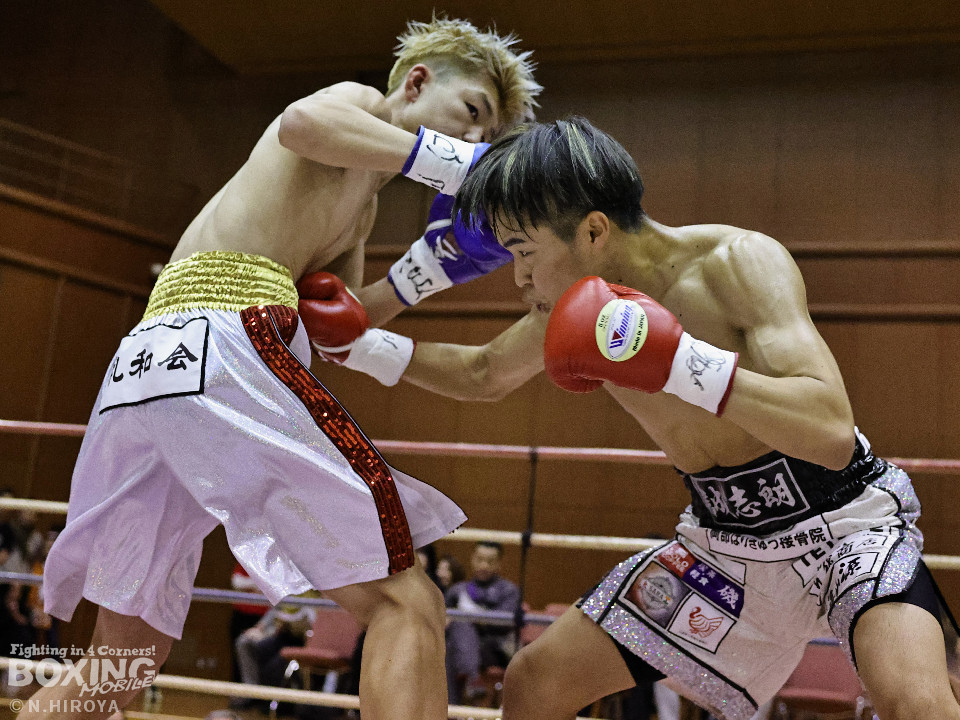 試合:サウスポー同士の一戦は、中間距離でジャブの差し合いからスタート。ラウンド終盤、井上がワンツー、右ボディをヒット。2回、横山はジャブからワンツーにつなげるが、井上は右フックを合わせてペースを渡さず。3回、横山はプレスをかけてワンツー右ボディで反撃。しかし、井上もここは負けじと左ストレートで左目下と左耳を切り裂いた。4回、回転力を活かした連打でお互いの意地がぶつかり合った。終始、有効打で上回った井上が2勝目を挙げた。