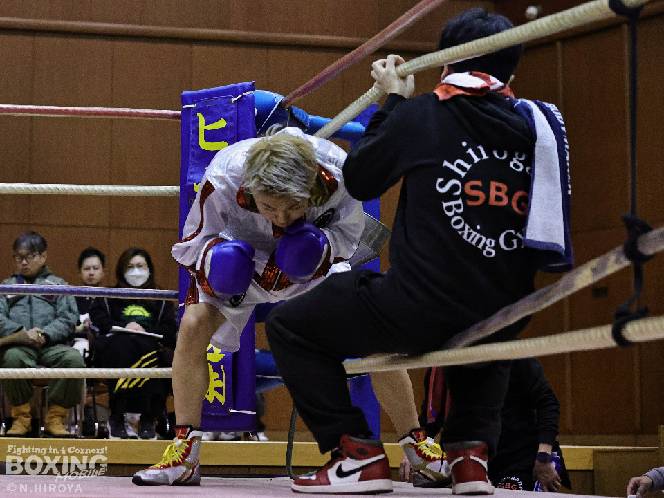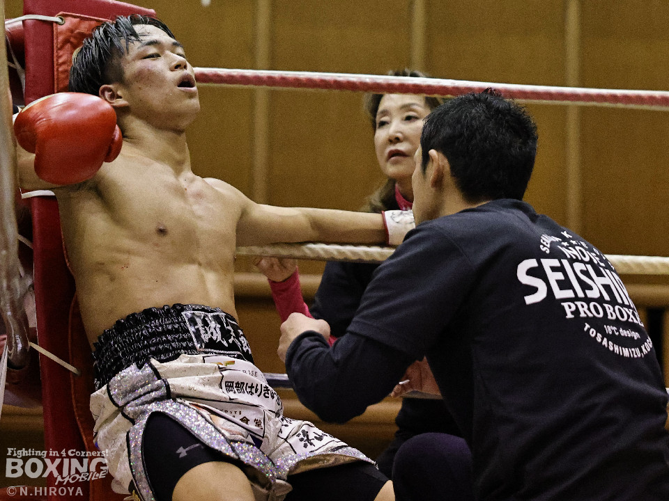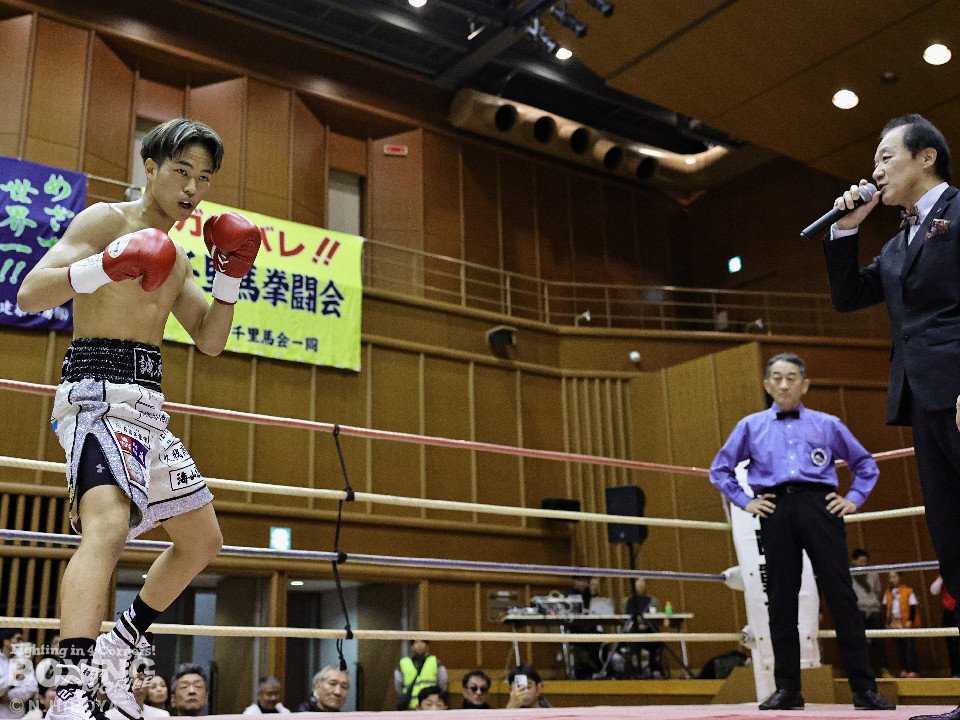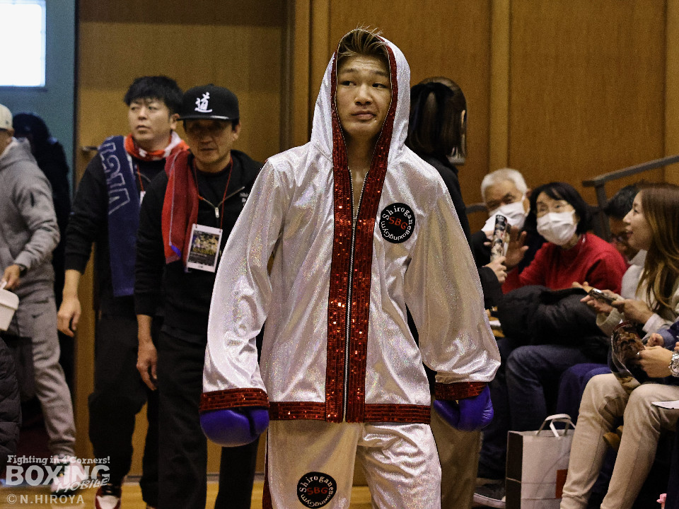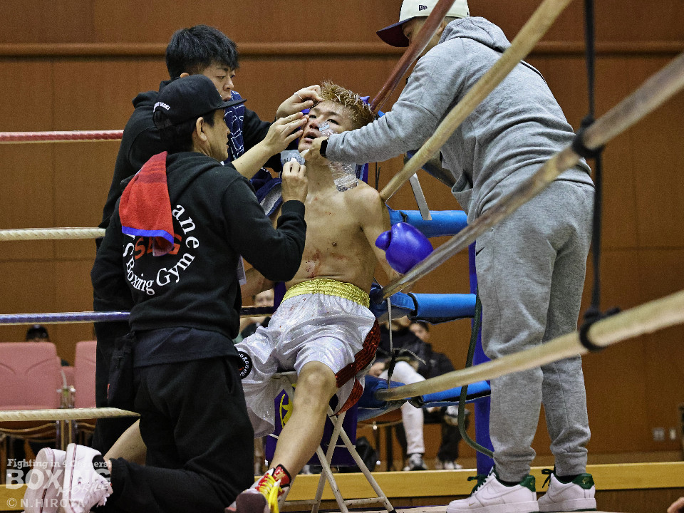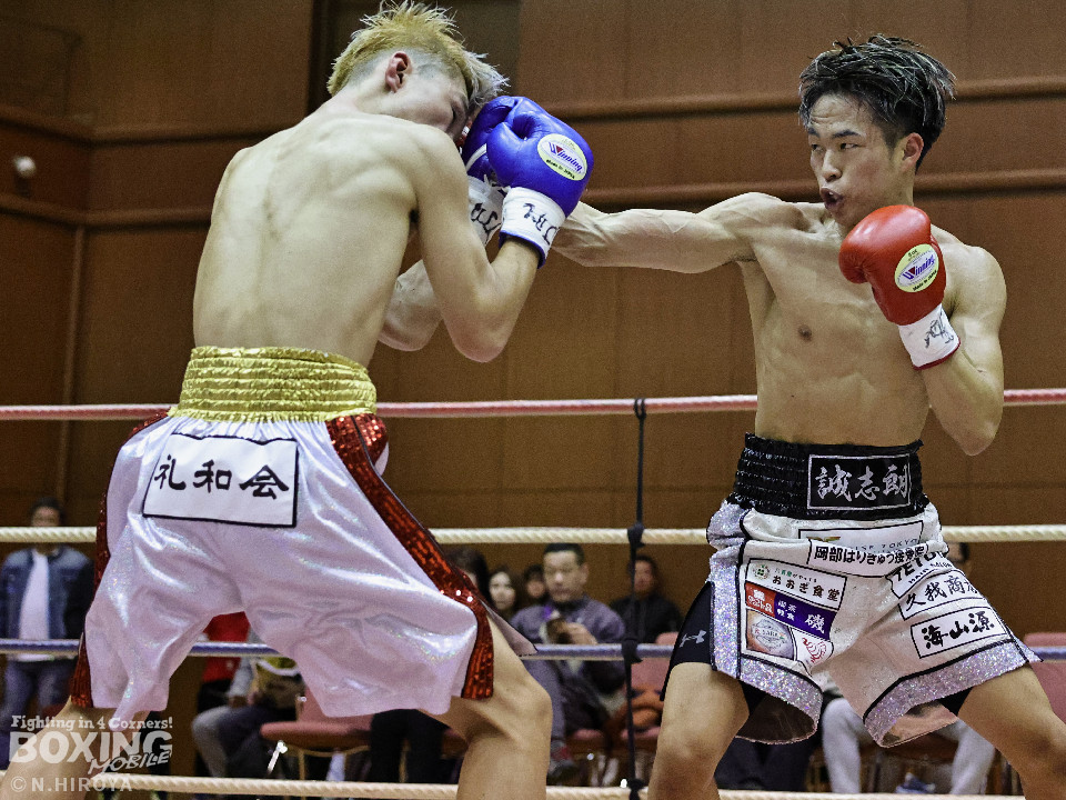 試合:サウスポー同士の一戦は、中間距離でジャブの差し合いからスタート。ラウンド終盤、井上がワンツー、右ボディをヒット。2回、横山はジャブからワンツーにつなげるが、井上は右フックを合わせてペースを渡さず。3回、横山はプレスをかけてワンツー右ボディで反撃。しかし、井上もここは負けじと左ストレートで左目下と左耳を切り裂いた。4回、回転力を活かした連打でお互いの意地がぶつかり合った。終始、有効打で上回った井上が2勝目を挙げた。