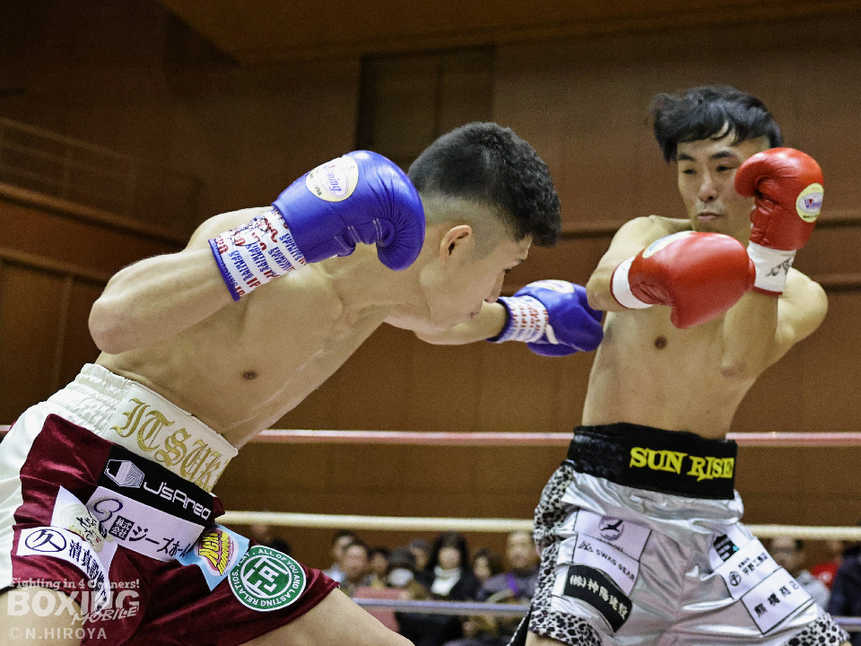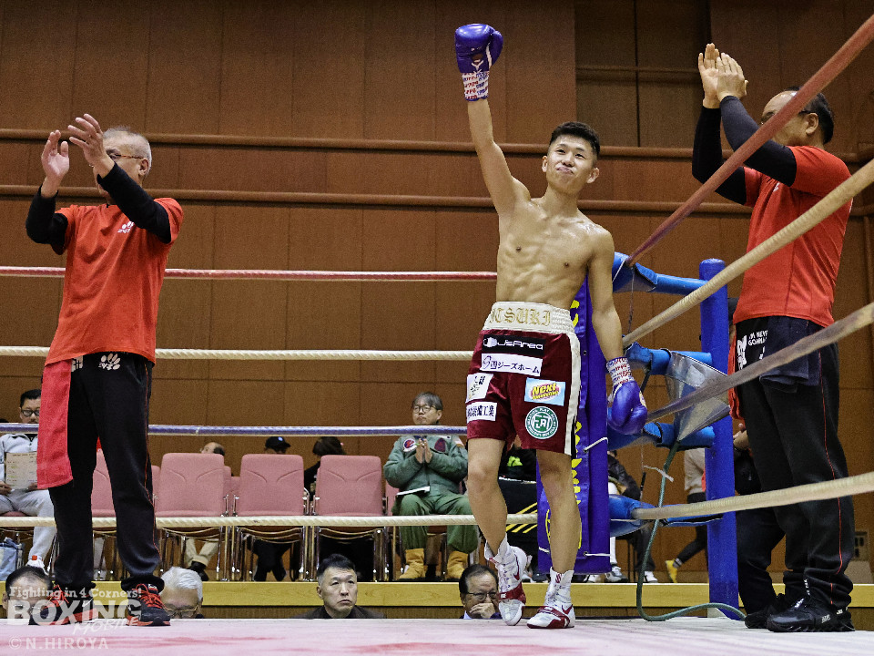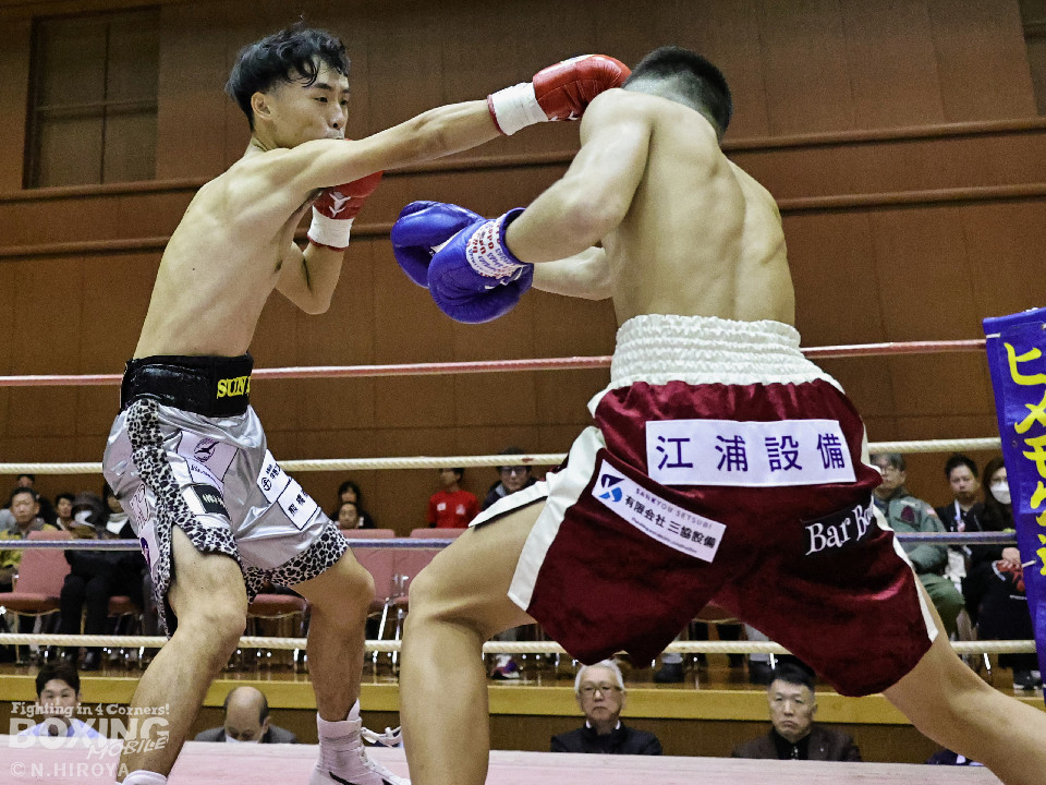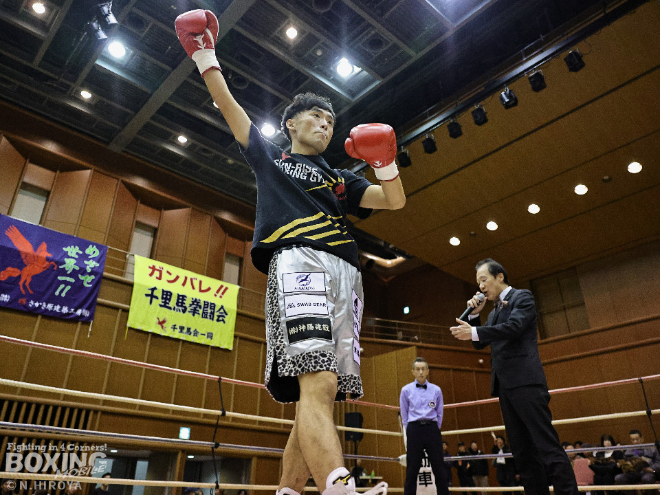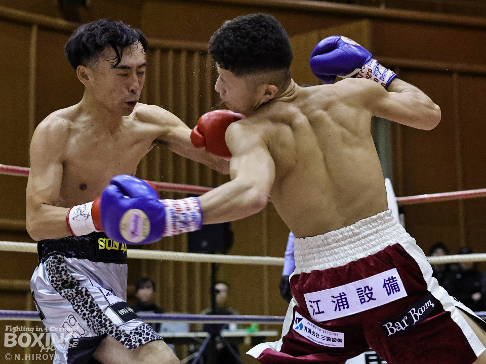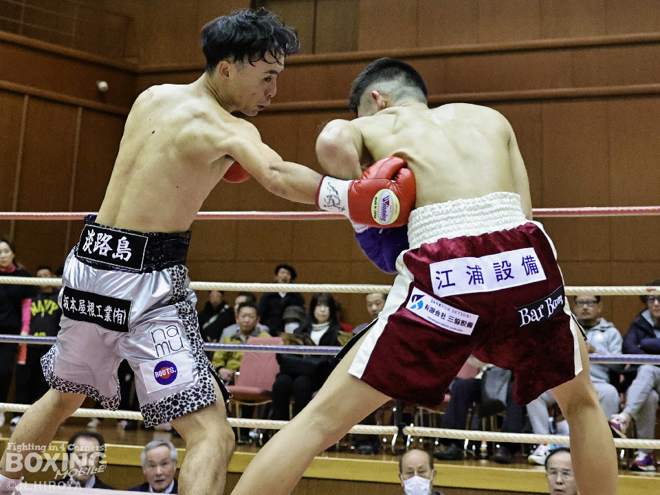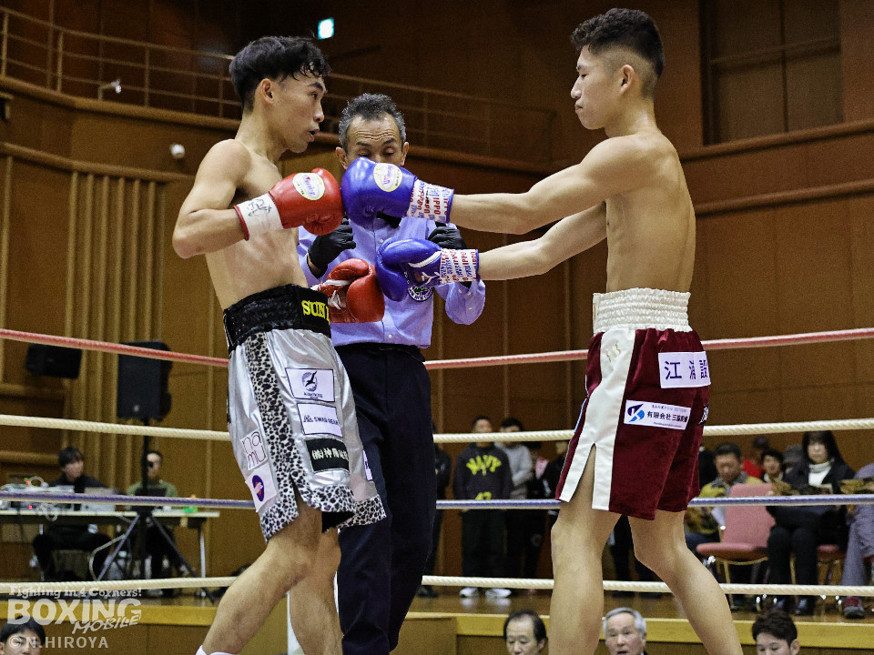 試合:サウスポー龍虎がノーガードで独特のタイミングからの左フックで切り込むのに対し、江浦は距離で外すと右カウンターを狙った。2回、前の手でタイミングの探り合い。お互いに慎重なため決定打を決められず。次のラウンドも距離が遠くジャッジ泣かせの展開。4回、明確なポイントが欲しい龍虎は左ストレートから仕掛けるが空振り。江浦は打ち終わりに右フックを決めた。江浦が判定勝ちでB級(6回戦)昇格を決めた。