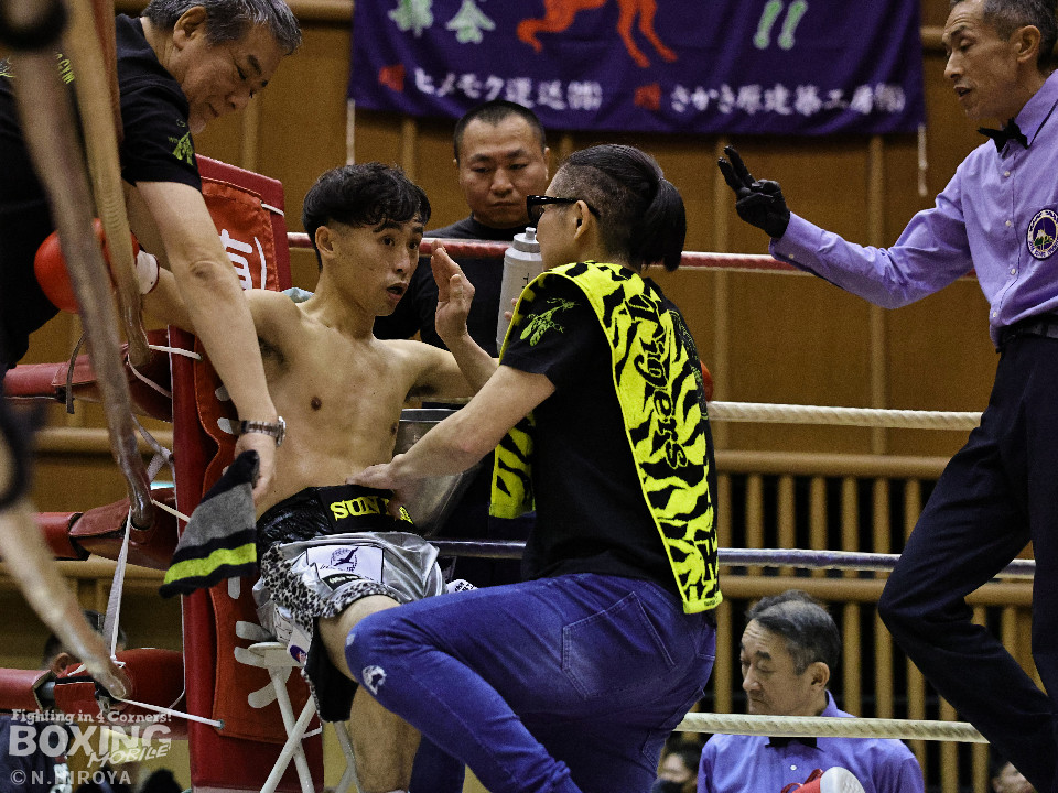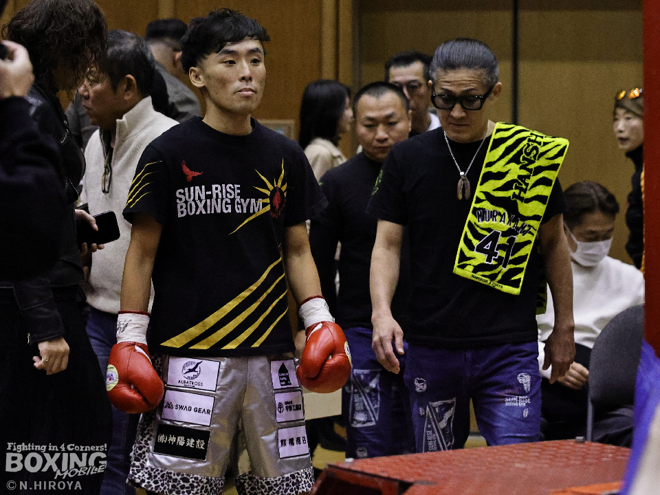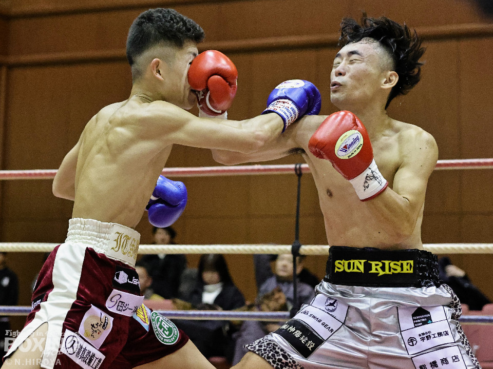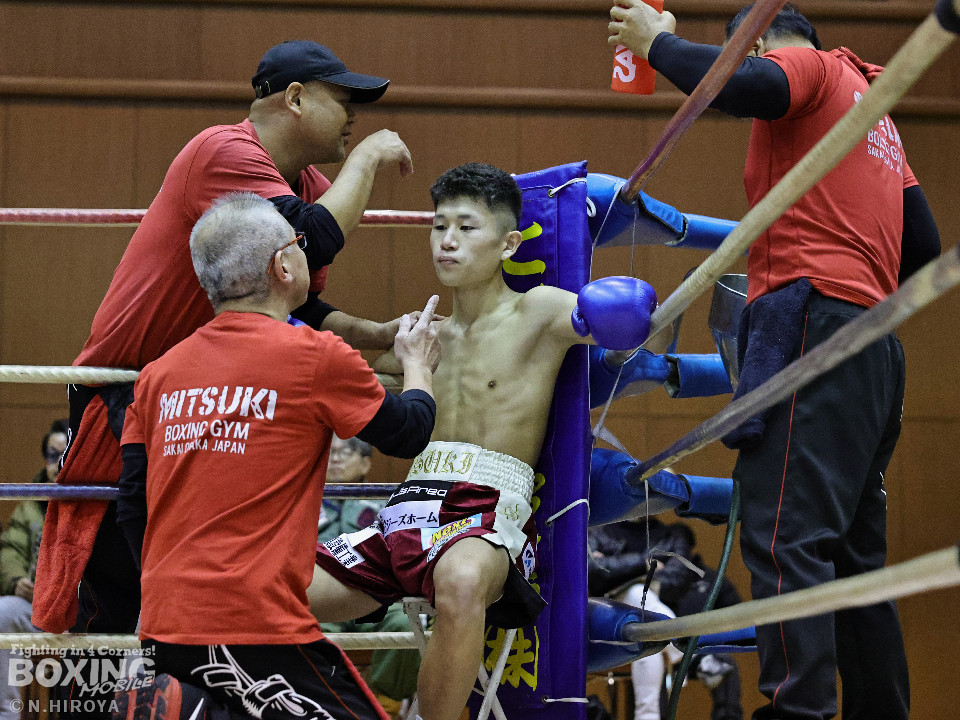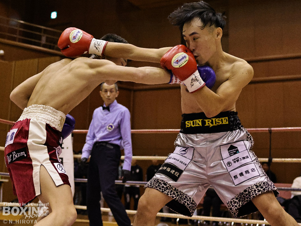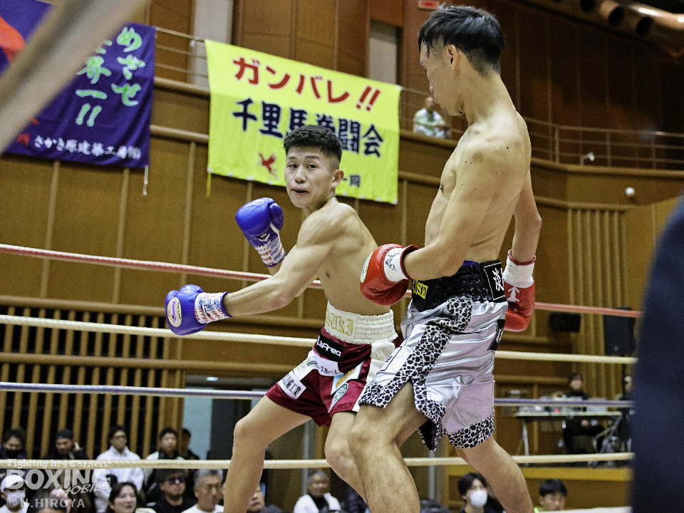 試合:サウスポー龍虎がノーガードで独特のタイミングからの左フックで切り込むのに対し、江浦は距離で外すと右カウンターを狙った。2回、前の手でタイミングの探り合い。お互いに慎重なため決定打を決められず。次のラウンドも距離が遠くジャッジ泣かせの展開。4回、明確なポイントが欲しい龍虎は左ストレートから仕掛けるが空振り。江浦は打ち終わりに右フックを決めた。江浦が判定勝ちでB級(6回戦)昇格を決めた。