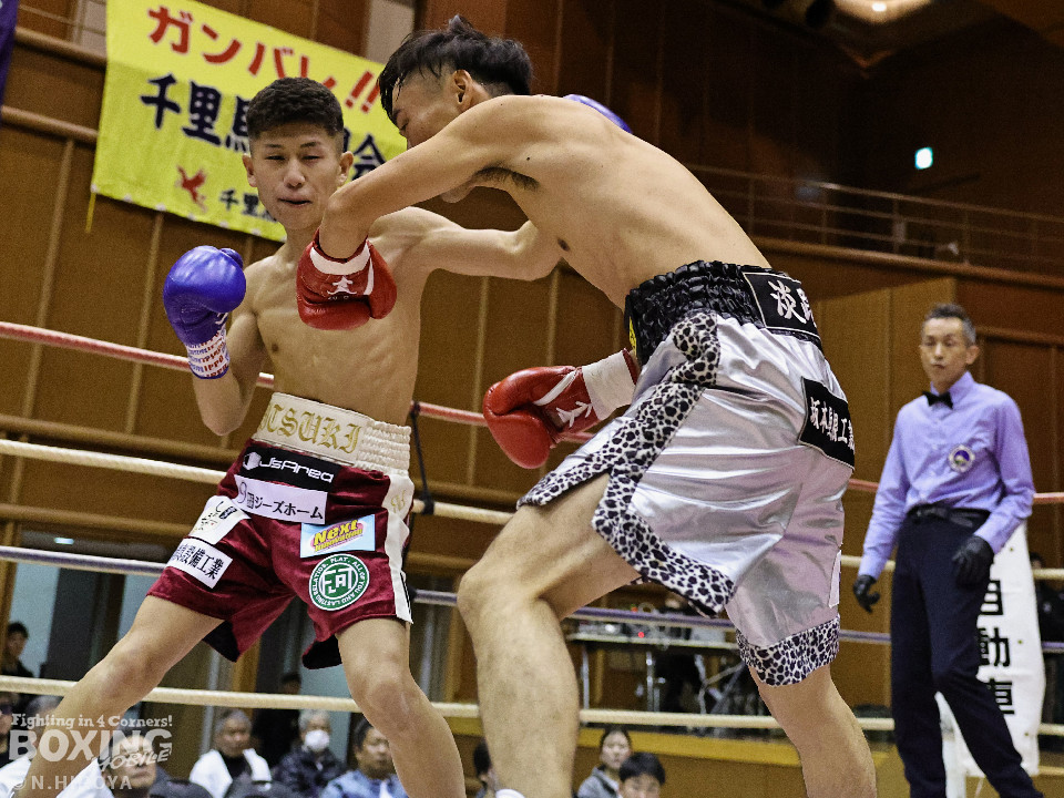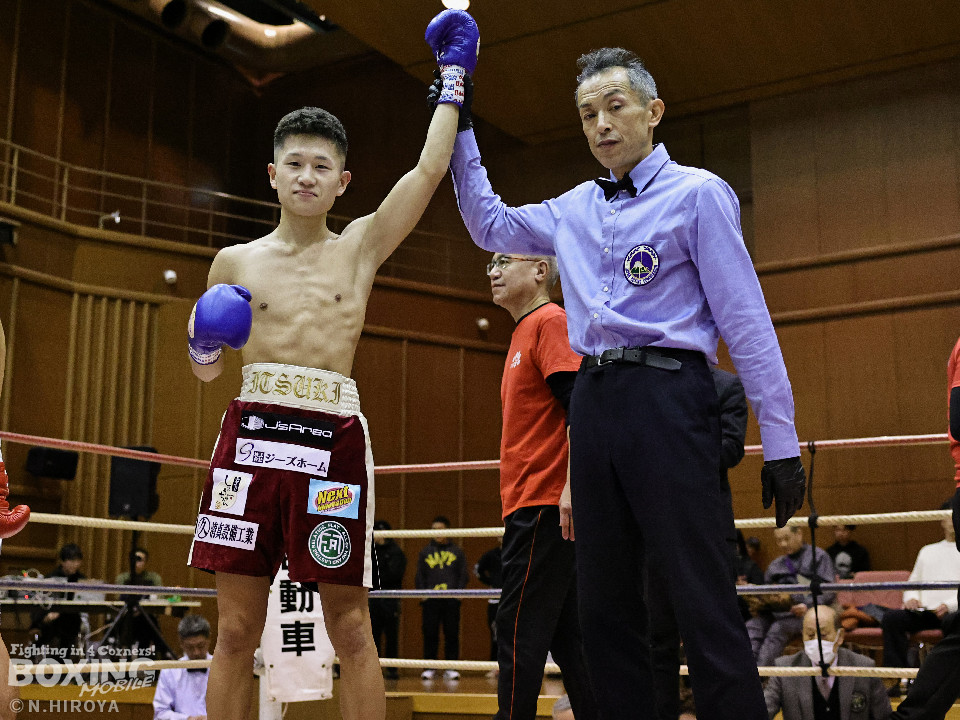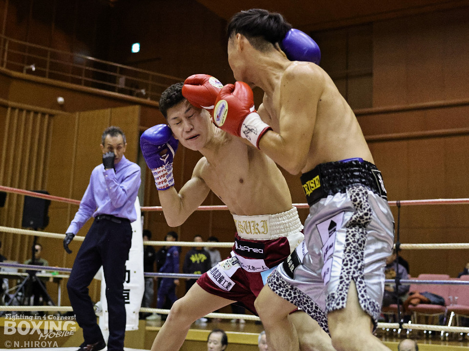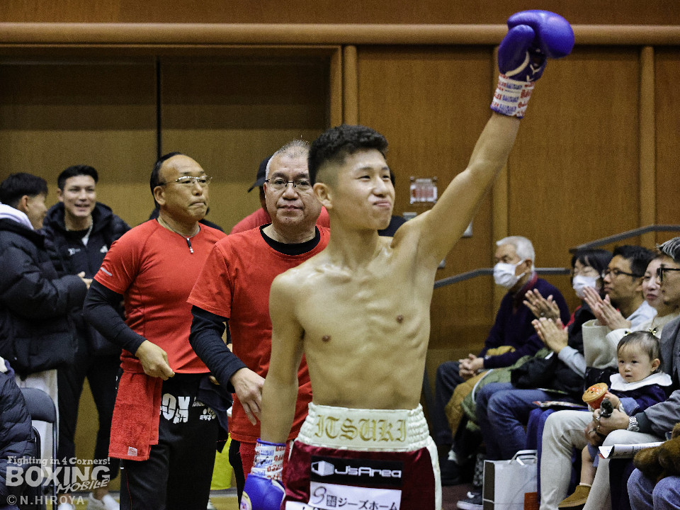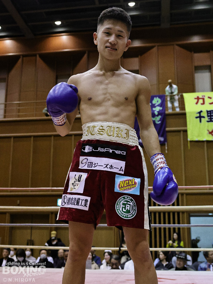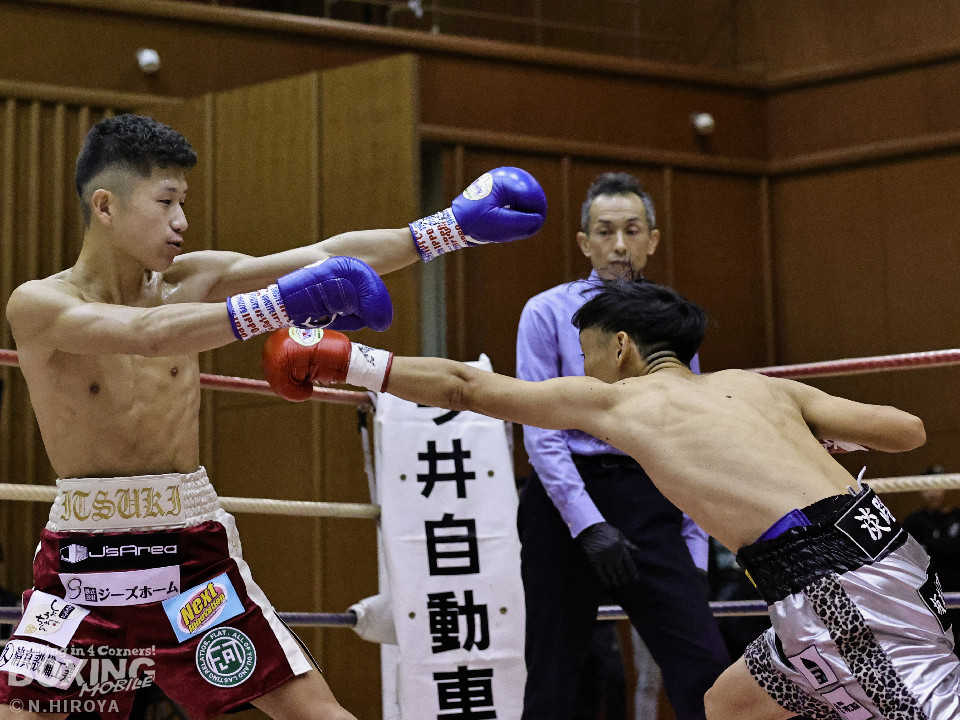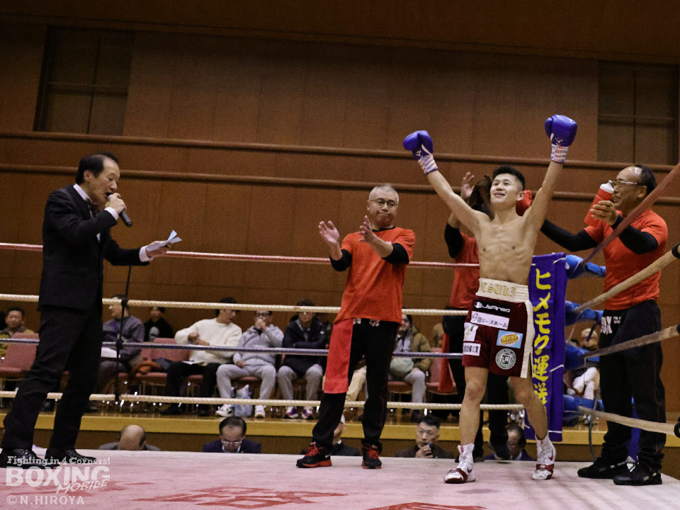 試合:サウスポー龍虎がノーガードで独特のタイミングからの左フックで切り込むのに対し、江浦は距離で外すと右カウンターを狙った。2回、前の手でタイミングの探り合い。お互いに慎重なため決定打を決められず。次のラウンドも距離が遠くジャッジ泣かせの展開。4回、明確なポイントが欲しい龍虎は左ストレートから仕掛けるが空振り。江浦は打ち終わりに右フックを決めた。江浦が判定勝ちでB級(6回戦)昇格を決めた。