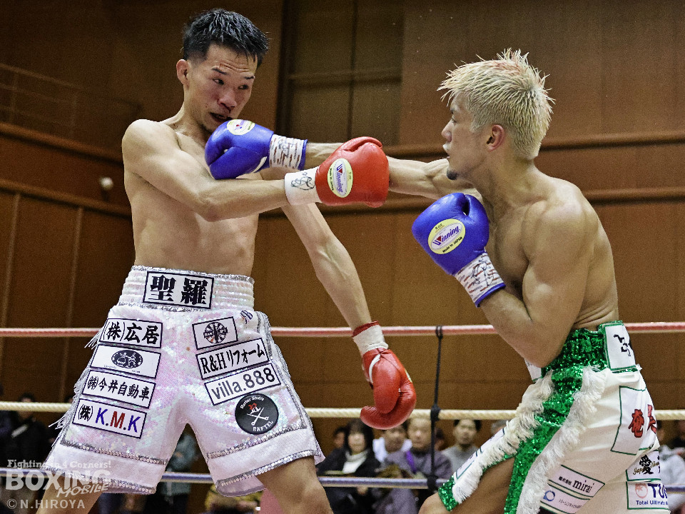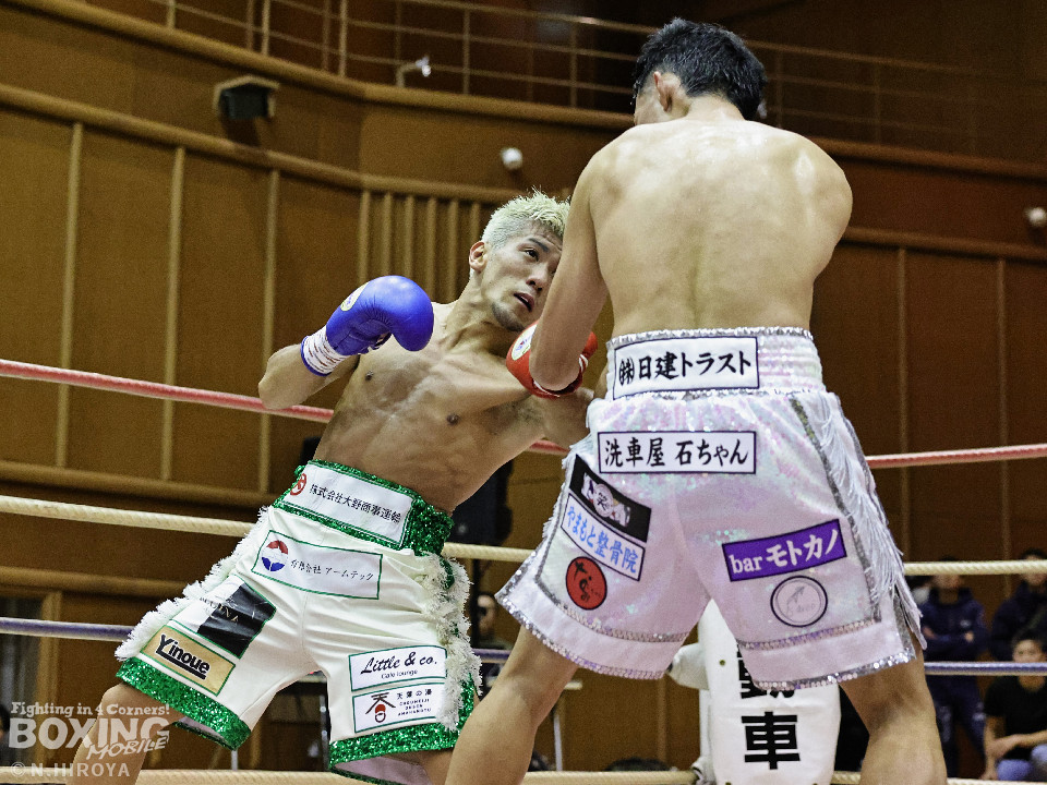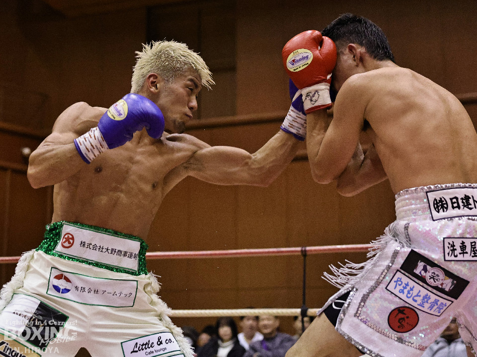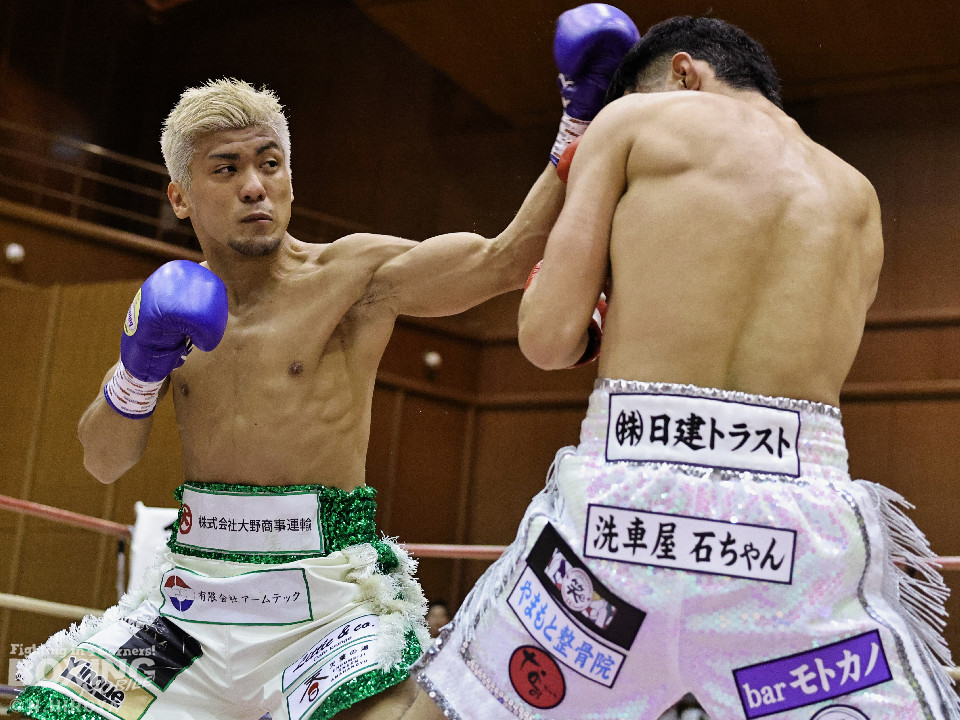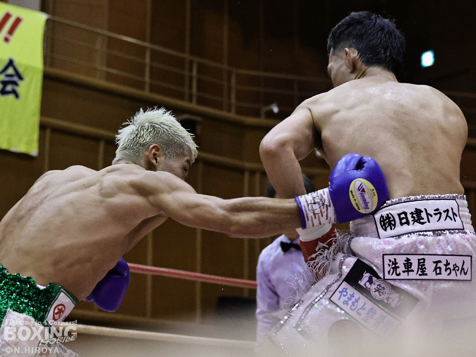 試合:岸田がジャブから打ち下ろしの右ストレートで先制攻撃を仕掛ければ、伊集院も左ボディで応戦。初回からお互いの気持ちがぶつかり合う熱戦を展開。2回、岸田はプレスをかけてワンツー、左ボディで積極的な攻撃。3回、岸田はジャブを軸にテンポアップアップ。4回、右ストレートから切り込みたい伊集院だが、距離が遠いのか後手に。5回、岸田は右オーバーハンドを叩きつけるとサイドに回り込んで見栄えの良さをアピール。6回、伊集院は右フックをねじ込み反撃。7回、岸田はワンツーを軸にリズム感のある攻撃。ラウンド終盤、伊集院は右アッパーを織り交ぜたコンビネーションで食い下がった。8回、岸田は右ボディを差し込みチャンスを作るが、ここで伊集院の右ショート炸裂しダウンを奪取。立ち上ったところで試合終了のゴングが鳴った。採点は割れたが伊集院に軍配が上がった。