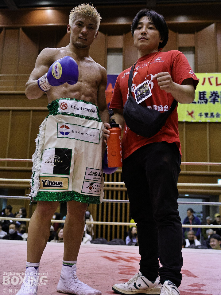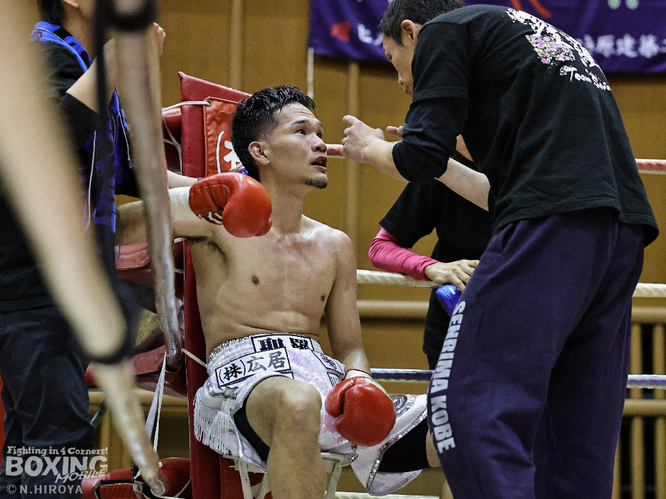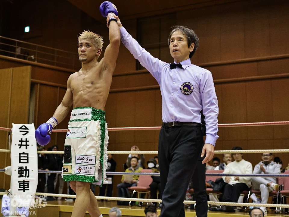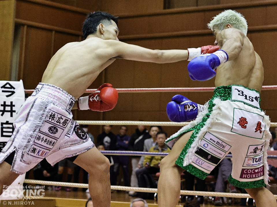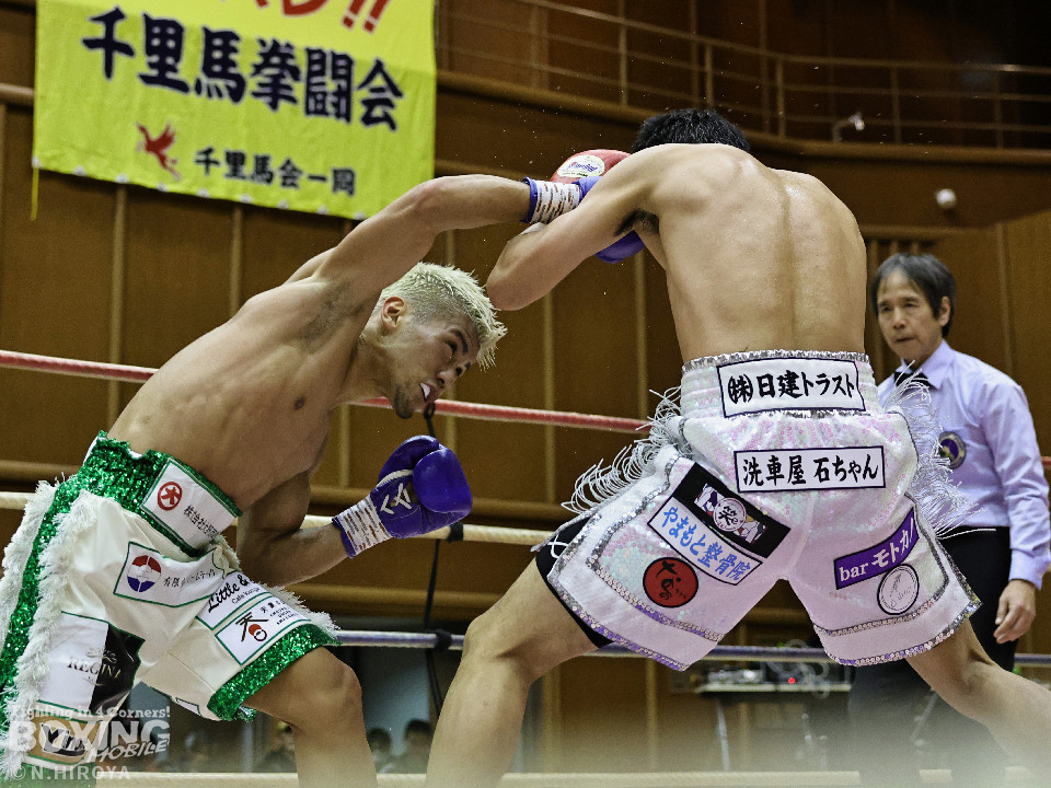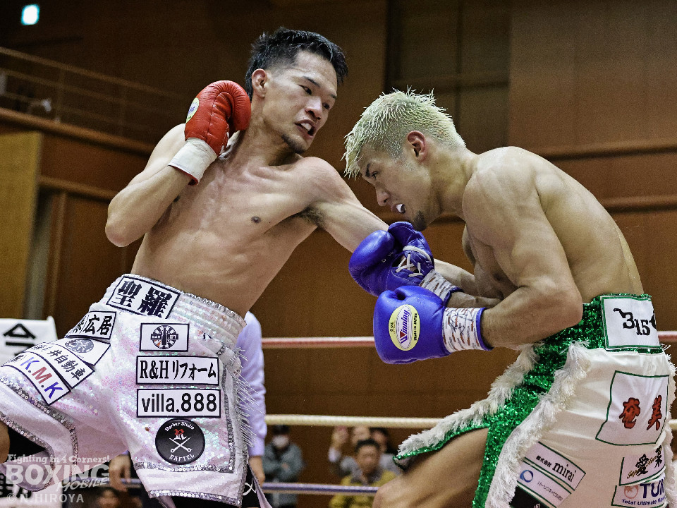 試合:岸田がジャブから打ち下ろしの右ストレートで先制攻撃を仕掛ければ、伊集院も左ボディで応戦。初回からお互いの気持ちがぶつかり合う熱戦を展開。2回、岸田はプレスをかけてワンツー、左ボディで積極的な攻撃。3回、岸田はジャブを軸にテンポアップアップ。4回、右ストレートから切り込みたい伊集院だが、距離が遠いのか後手に。5回、岸田は右オーバーハンドを叩きつけるとサイドに回り込んで見栄えの良さをアピール。6回、伊集院は右フックをねじ込み反撃。7回、岸田はワンツーを軸にリズム感のある攻撃。ラウンド終盤、伊集院は右アッパーを織り交ぜたコンビネーションで食い下がった。8回、岸田は右ボディを差し込みチャンスを作るが、ここで伊集院の右ショート炸裂しダウンを奪取。立ち上ったところで試合終了のゴングが鳴った。採点は割れたが伊集院に軍配が上がった。