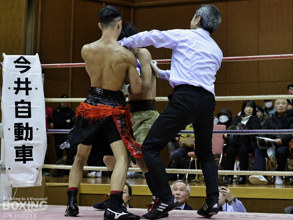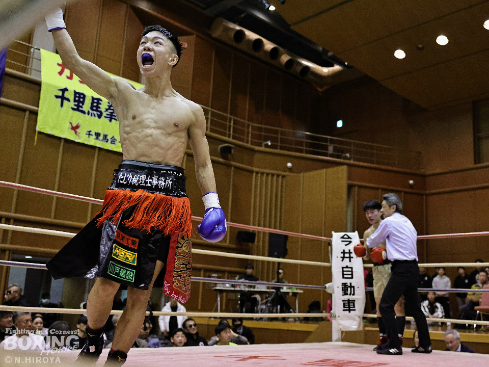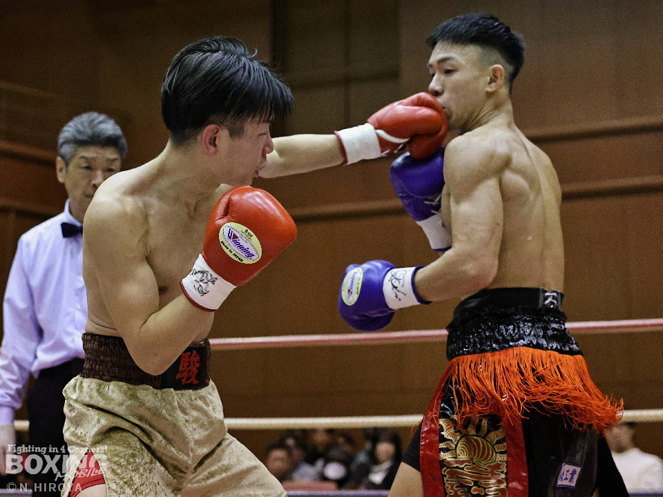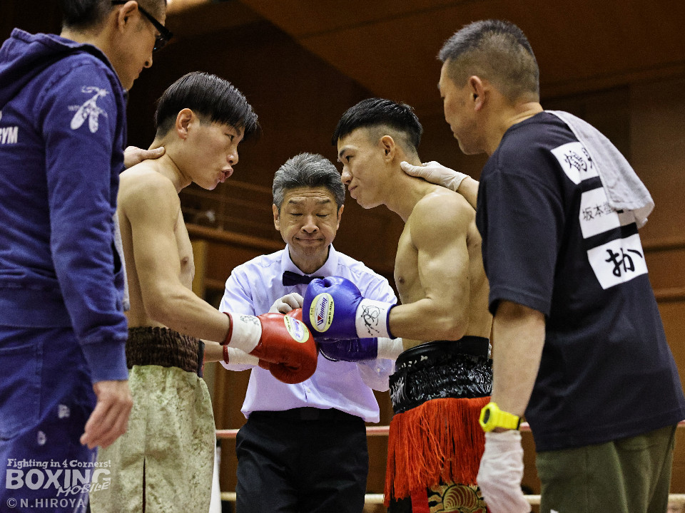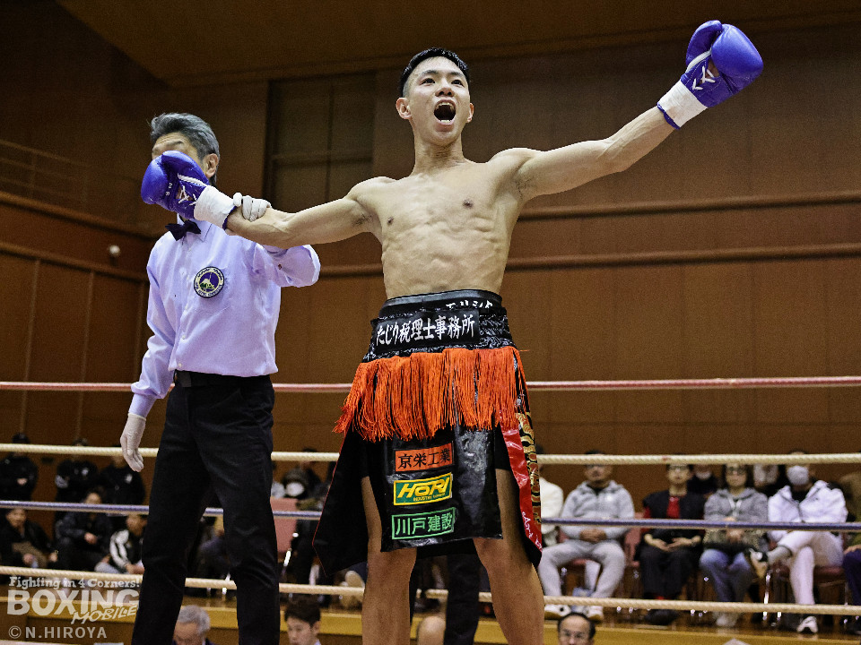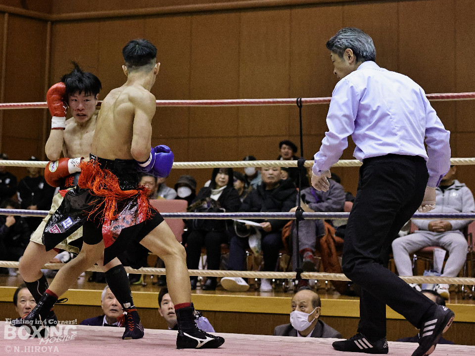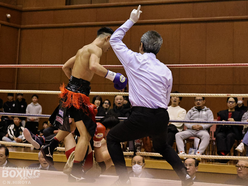試合:中間距離でジャブの差し合いからスタートした試合は、2回に弘田が右フックを叩きつけて見栄えの良さをアピール。3回、弘田はステップインから左フックで顔を弾くと右フックでダウンを奪取。ダメージが残る小坂に迫るとパンチを畳みかけてレフェリーストップに持ち込んだ。A級初戦の弘田が日本2位の小坂を撃破した。