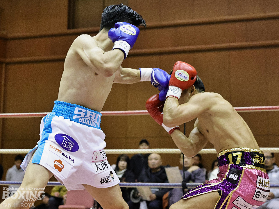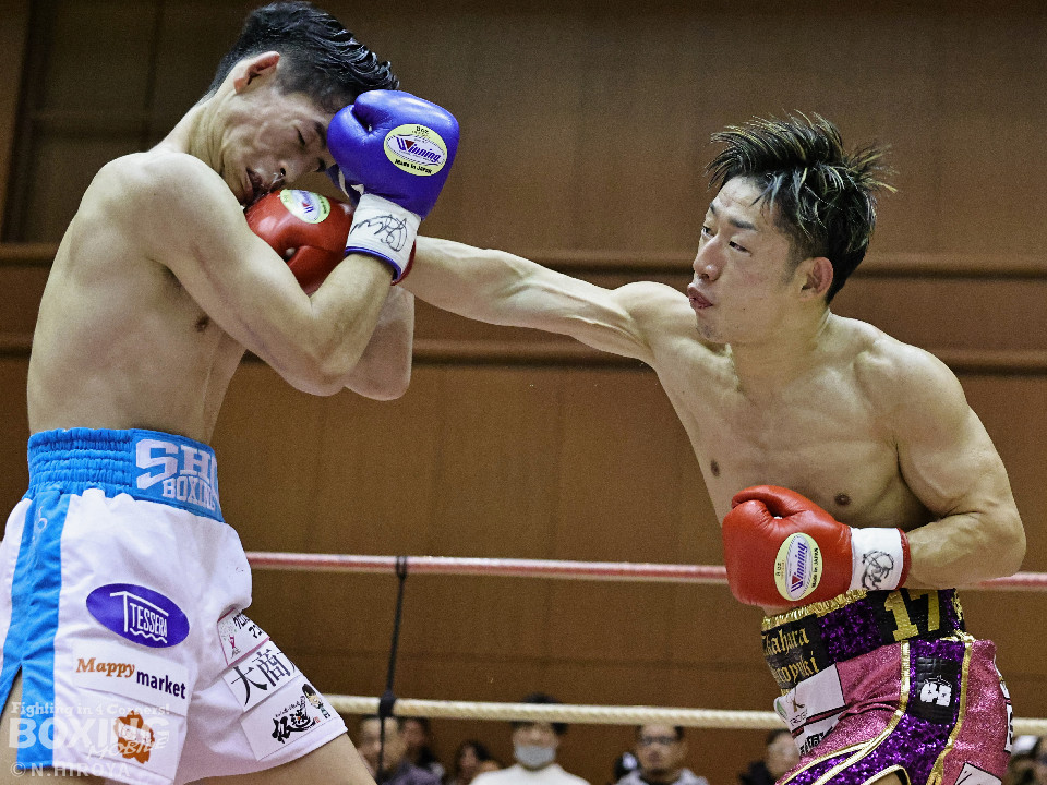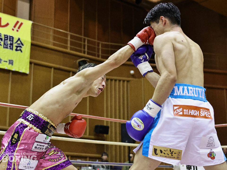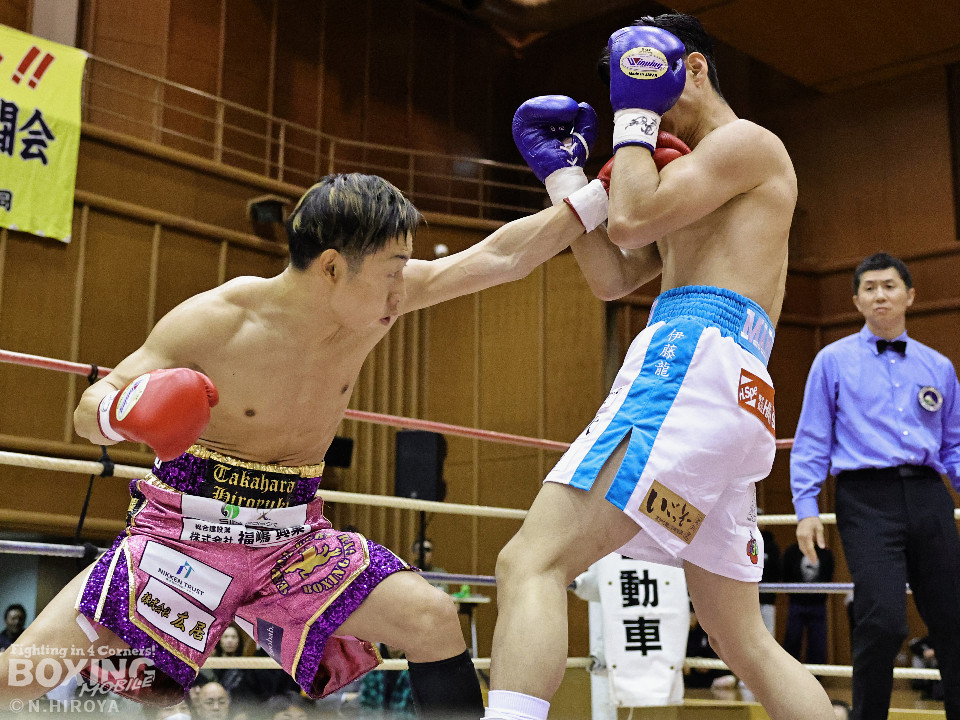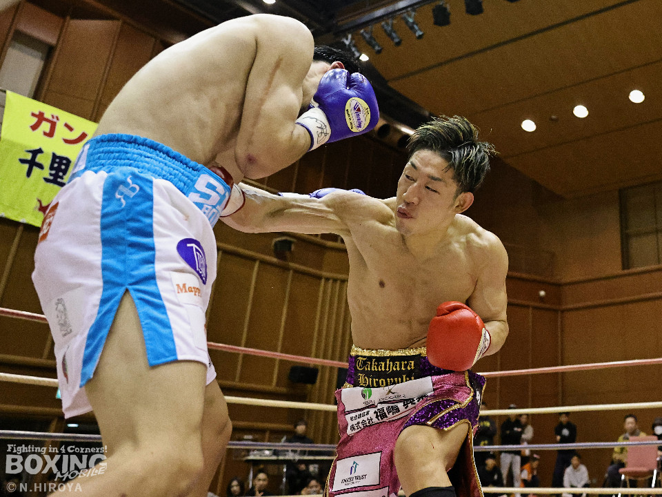 試合:山原がシャープなジャブを飛ばして距離とタイミングを探るのに対し、高原は力強い右フックを叩きつけて応戦。2回、山原は左を突きながらリズムを作ると左ボディをヒット。3回、至近距離でのパンチの応酬、山原が左ボディを突き刺せば、高原も右フックで譲らず。ラウンド終了間際、高原の右フックが火を噴きダウンを奪取。なんとか立ち上った山原はゴングに救われた。4回、高原は右ボディストレートを突き刺し前に出たところに山原が左フックを合わせてダウンを奪い返す!その後は死力を尽くしての打ち合いに発展。山原は後頭部への打撃による反則で減点1が課せられた。5回も両者の意地がぶつかり合う打撃戦。高原が右フックを強振し左目尻を切り裂いた。6回、山原が左ボディに的を絞り攻勢をアピール。7回、打ち合いは激しさを増し総力戦。距離が詰まり乱戦模様。高原はホールディングの反則で減点1。ラウンド終盤、高原は回転力を上げて攻め立てた。勝負が決まったのは8回、高原はワンツーで効かせると一気にスパートしてレフェリーストップに持ち込んだ。激戦を制した高原がランキングを死守した。