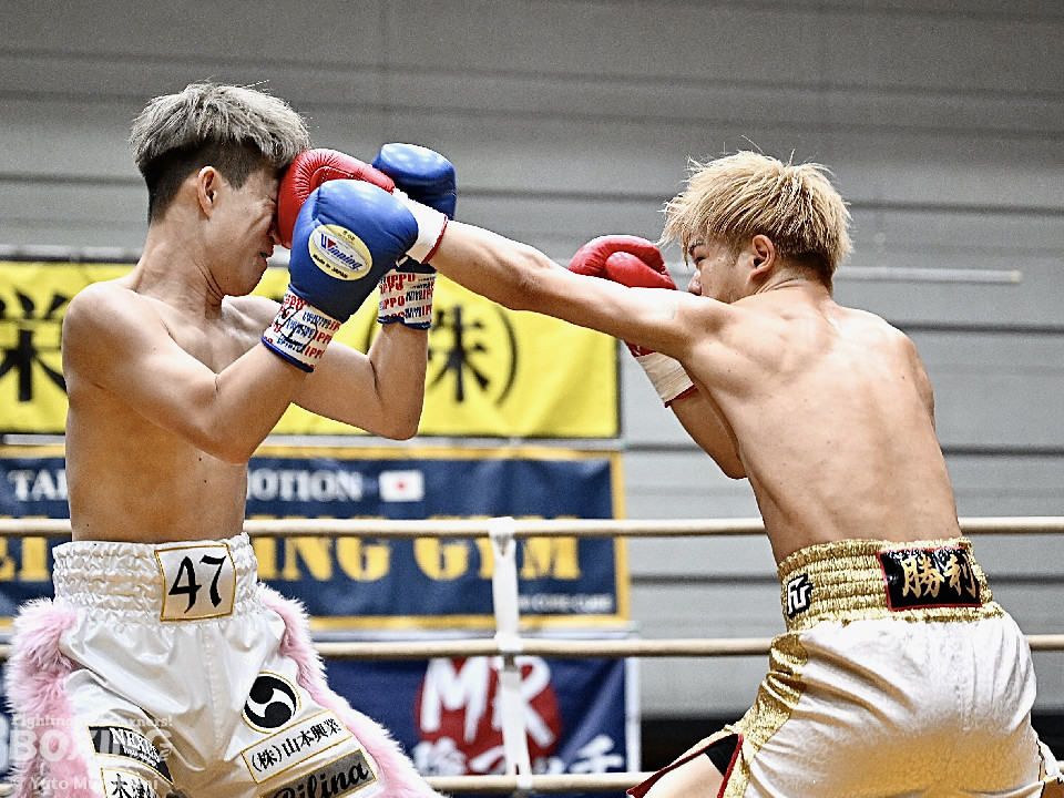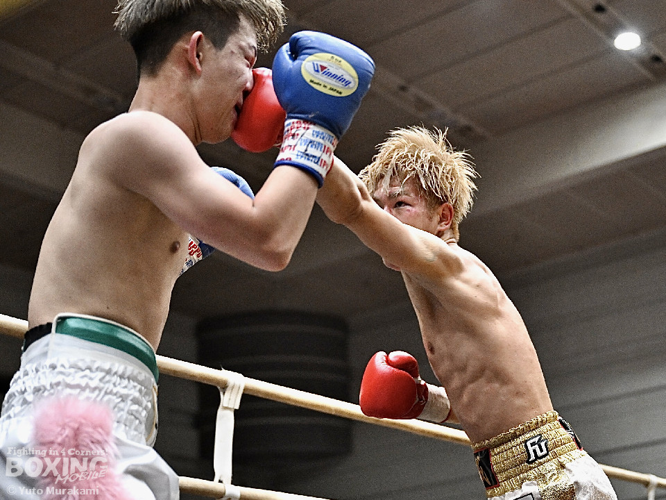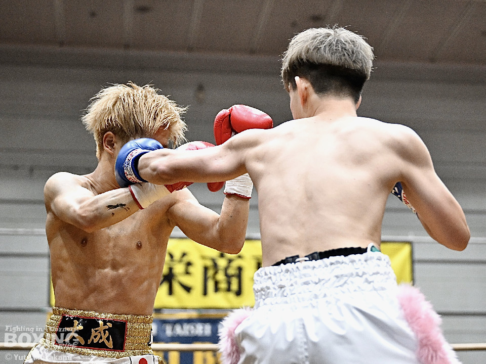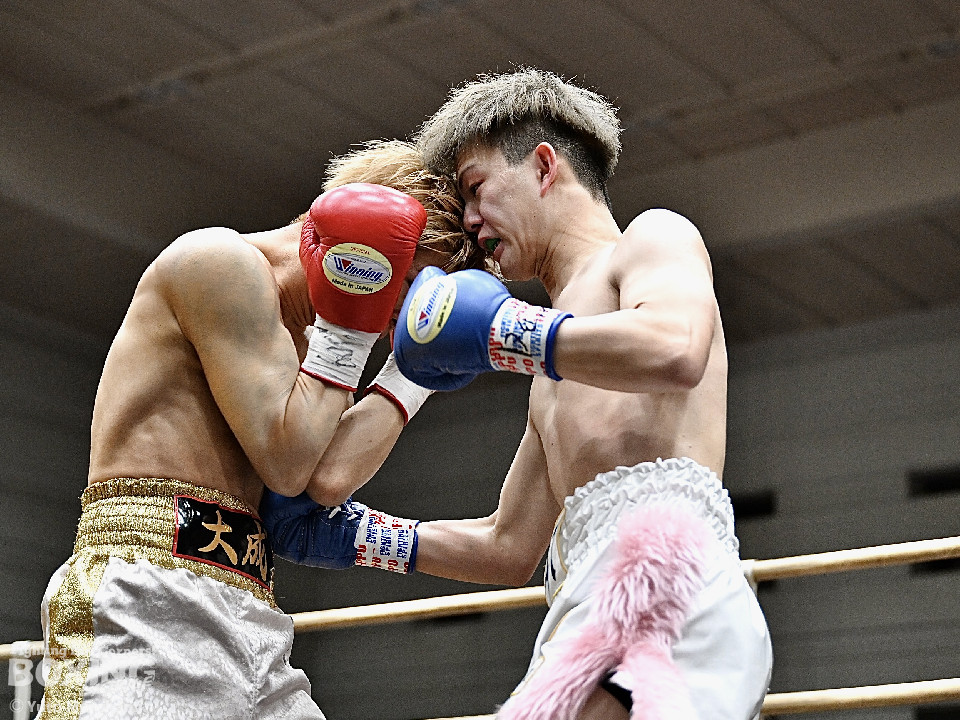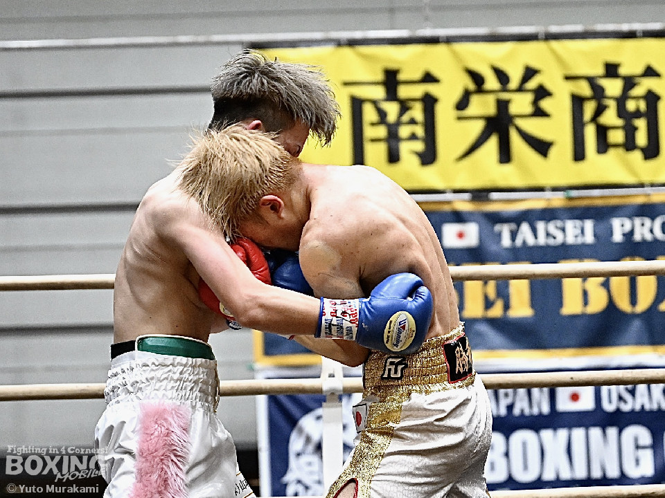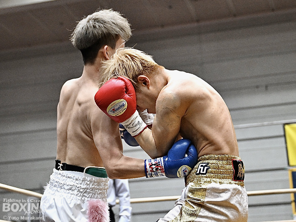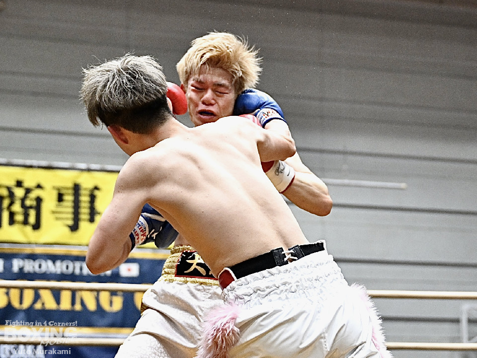 試合:出井がジャブを飛ばして体に当てる意識を作りつつ、ワンツーをヒット。2回、後手に回った下川は距離を詰めてワンツーを打ち込むが、出井は真っ向から応戦すると右カウンターでダウンを奪取。再開後、下川は打ち下ろしの右ストレート、左ボディで反撃。出井はホールディングの反則により減点1が課せられた。3回、至近距離での打ち合いの中、下川が右をコツコツと当てて優勢。レフェリーは出井に対しホールディングの反則でさらに減点を与えた。4回、出井は左アッパーで迎え撃つが、相手の勢いを止められず。下川はグイグイと距離を潰して右フックをねじ込んだところでレフェリーが割って入った。