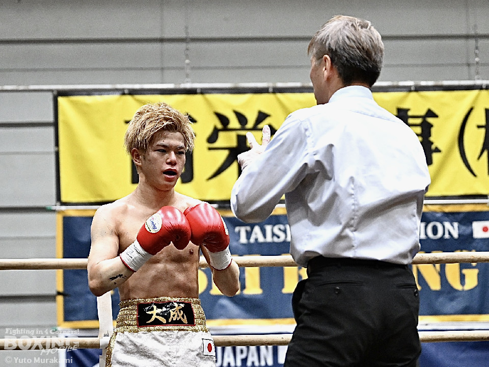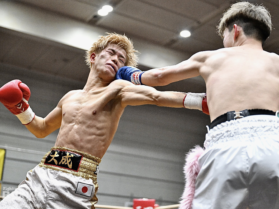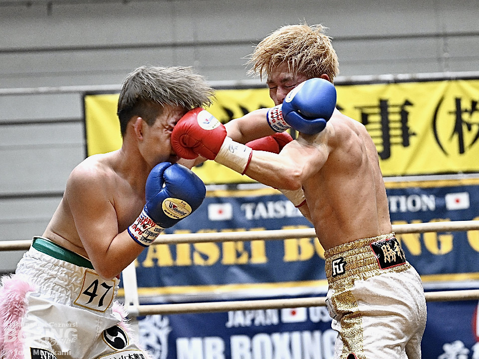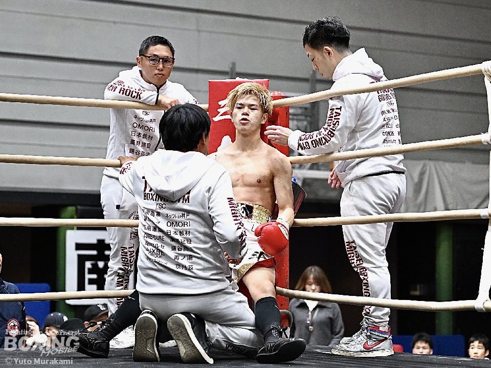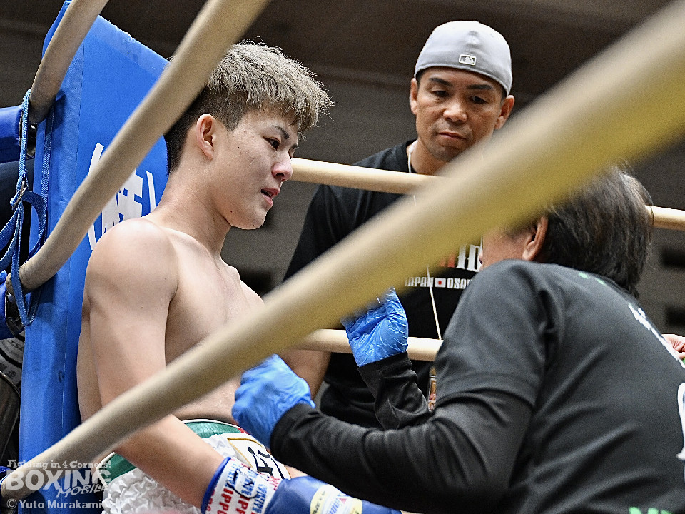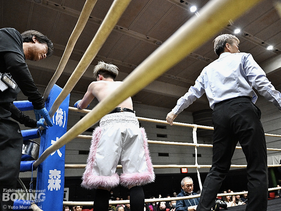 試合:出井がジャブを飛ばして体に当てる意識を作りつつ、ワンツーをヒット。2回、後手に回った下川は距離を詰めてワンツーを打ち込むが、出井は真っ向から応戦すると右カウンターでダウンを奪取。再開後、下川は打ち下ろしの右ストレート、左ボディで反撃。出井はホールディングの反則により減点1が課せられた。3回、至近距離での打ち合いの中、下川が右をコツコツと当てて優勢。レフェリーは出井に対しホールディングの反則でさらに減点を与えた。4回、出井は左アッパーで迎え撃つが、相手の勢いを止められず。下川はグイグイと距離を潰して右フックをねじ込んだところでレフェリーが割って入った。